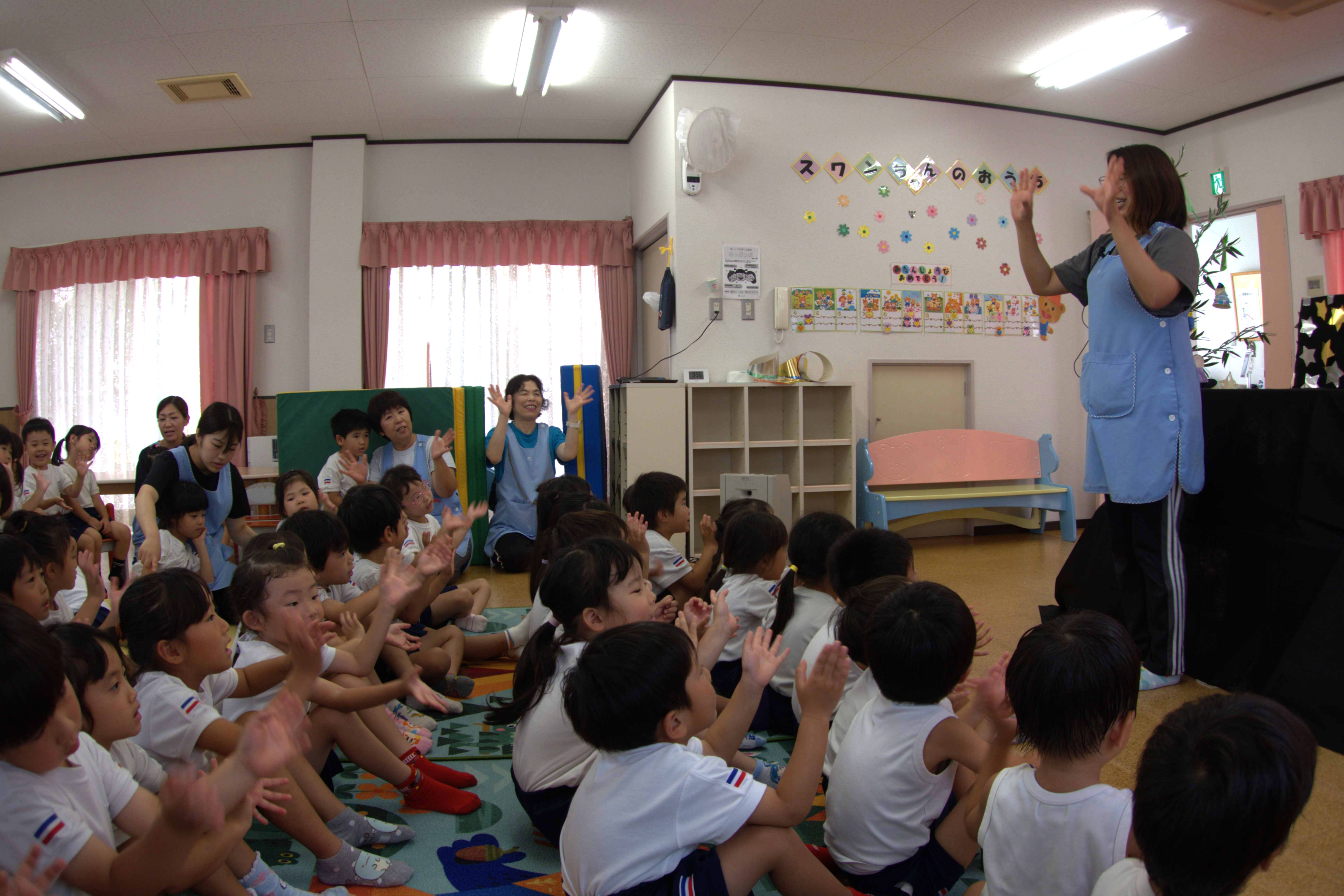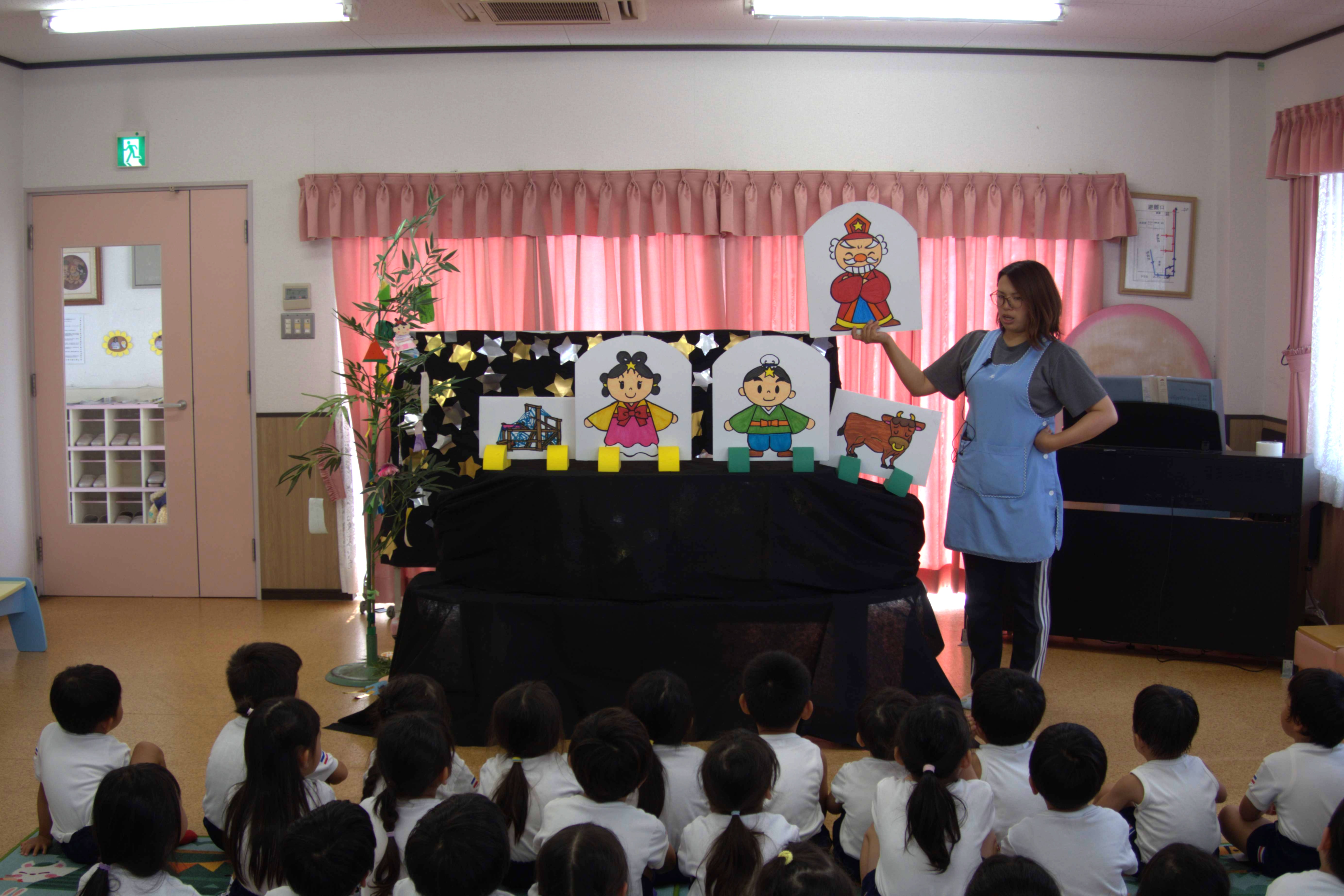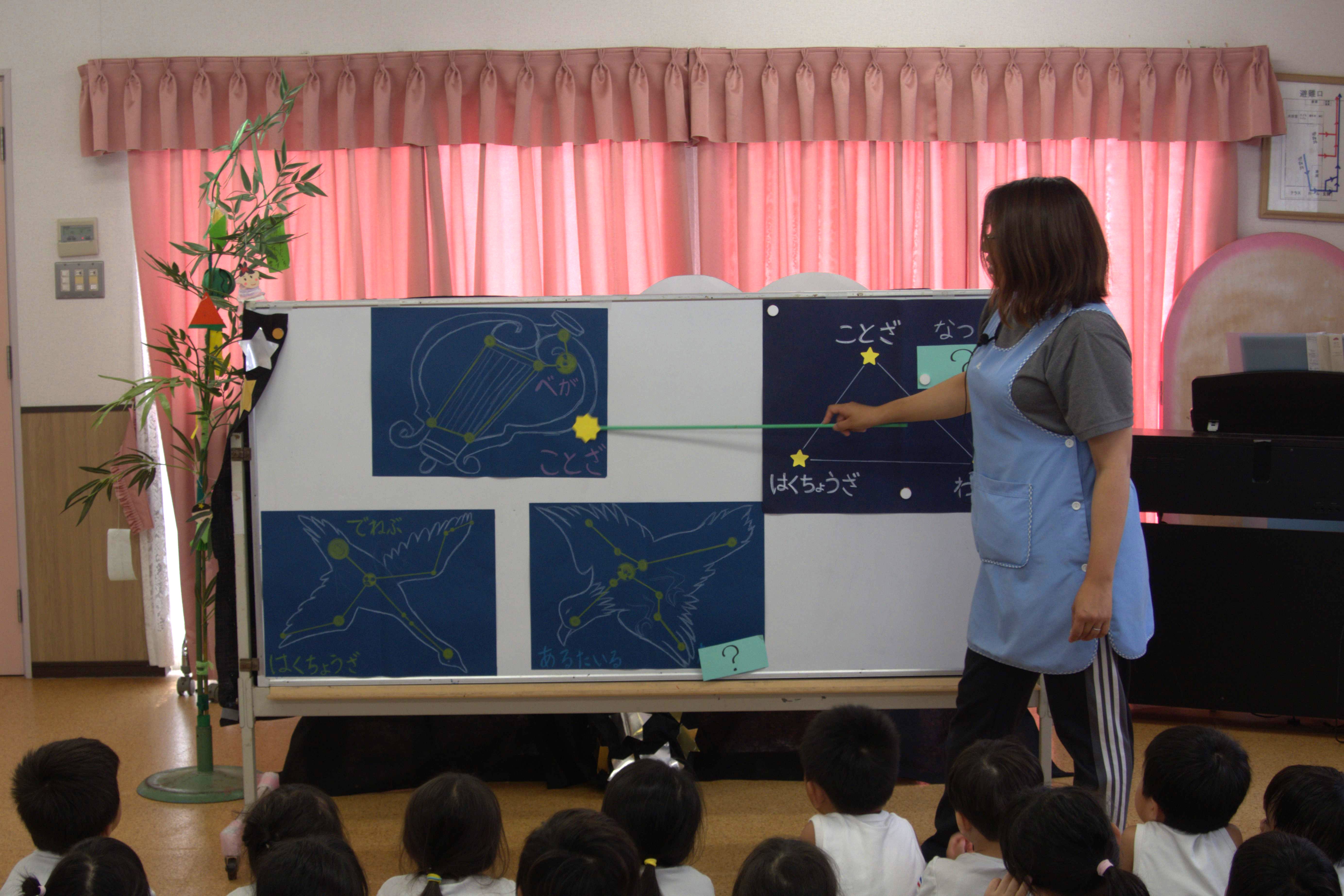 お誕生会の後は七夕についてのお話を聞きました!ペープサートシアターで七夕の由来を聞いたり、夏の星座について教えてもらったり、お友だちの七夕製作の紹介を聞いたりしましたよ。最後は七夕クイズにもチャレンジしました!全問正解を目指して大盛り上がりの子どもたちでした!