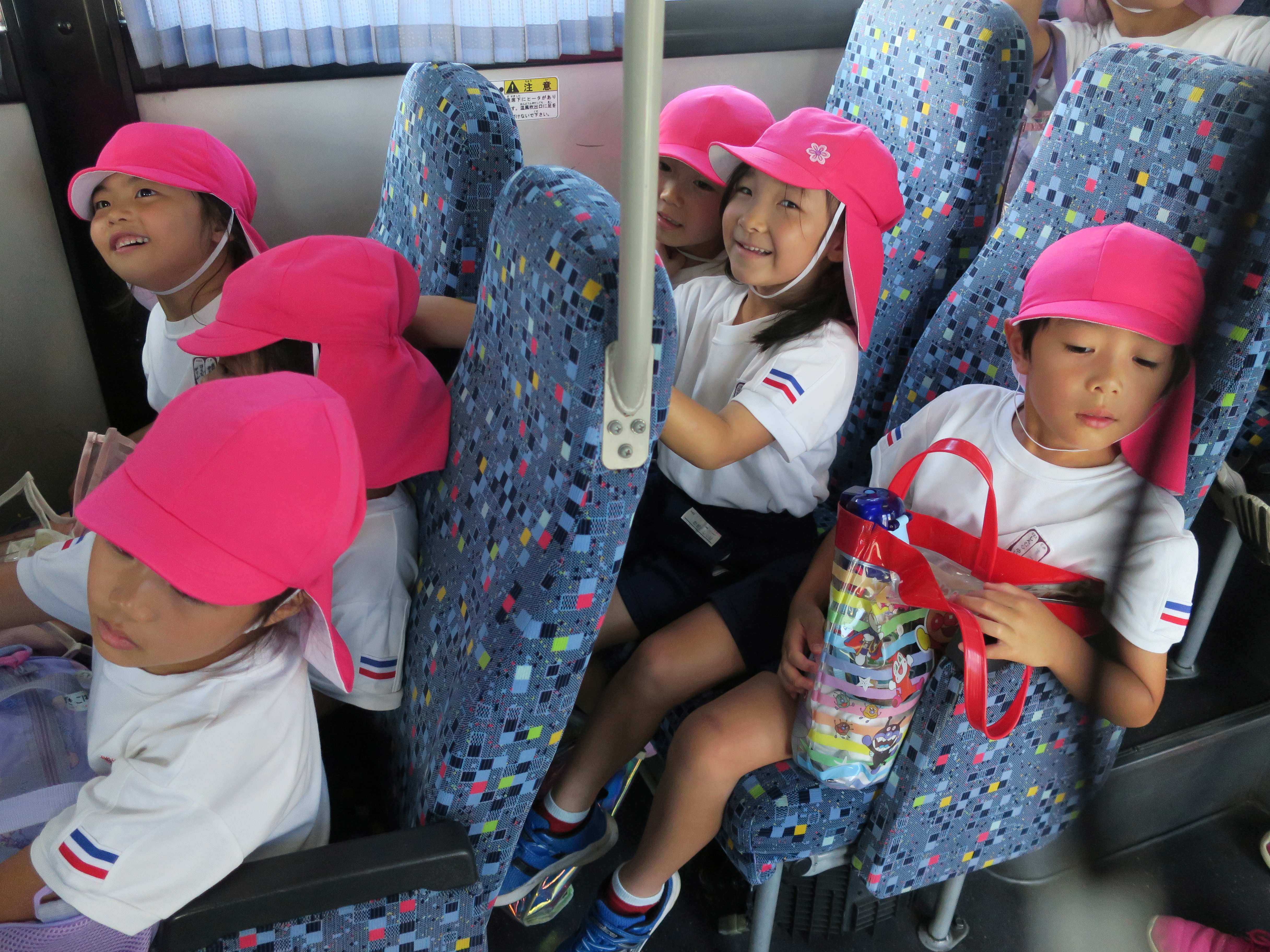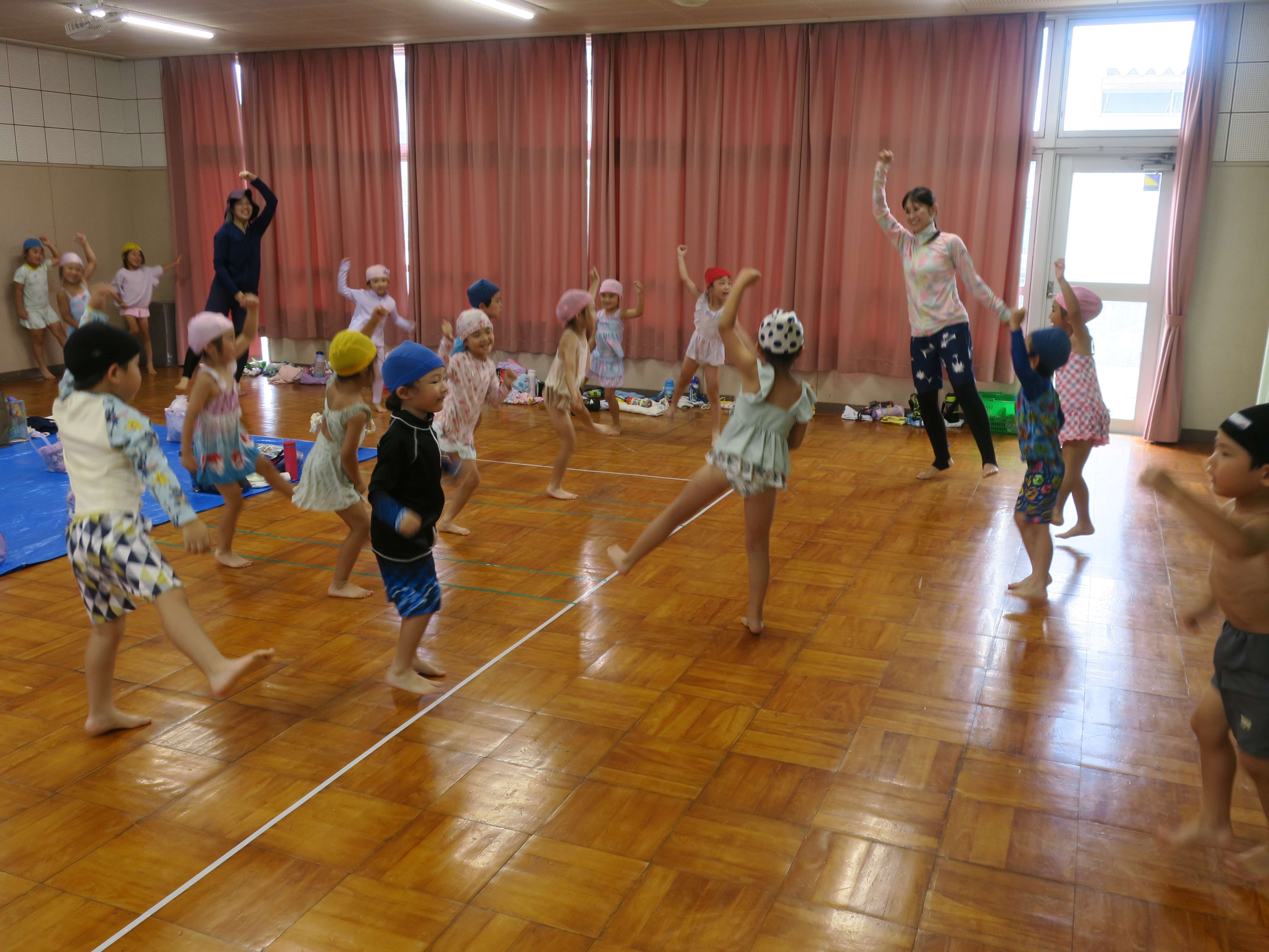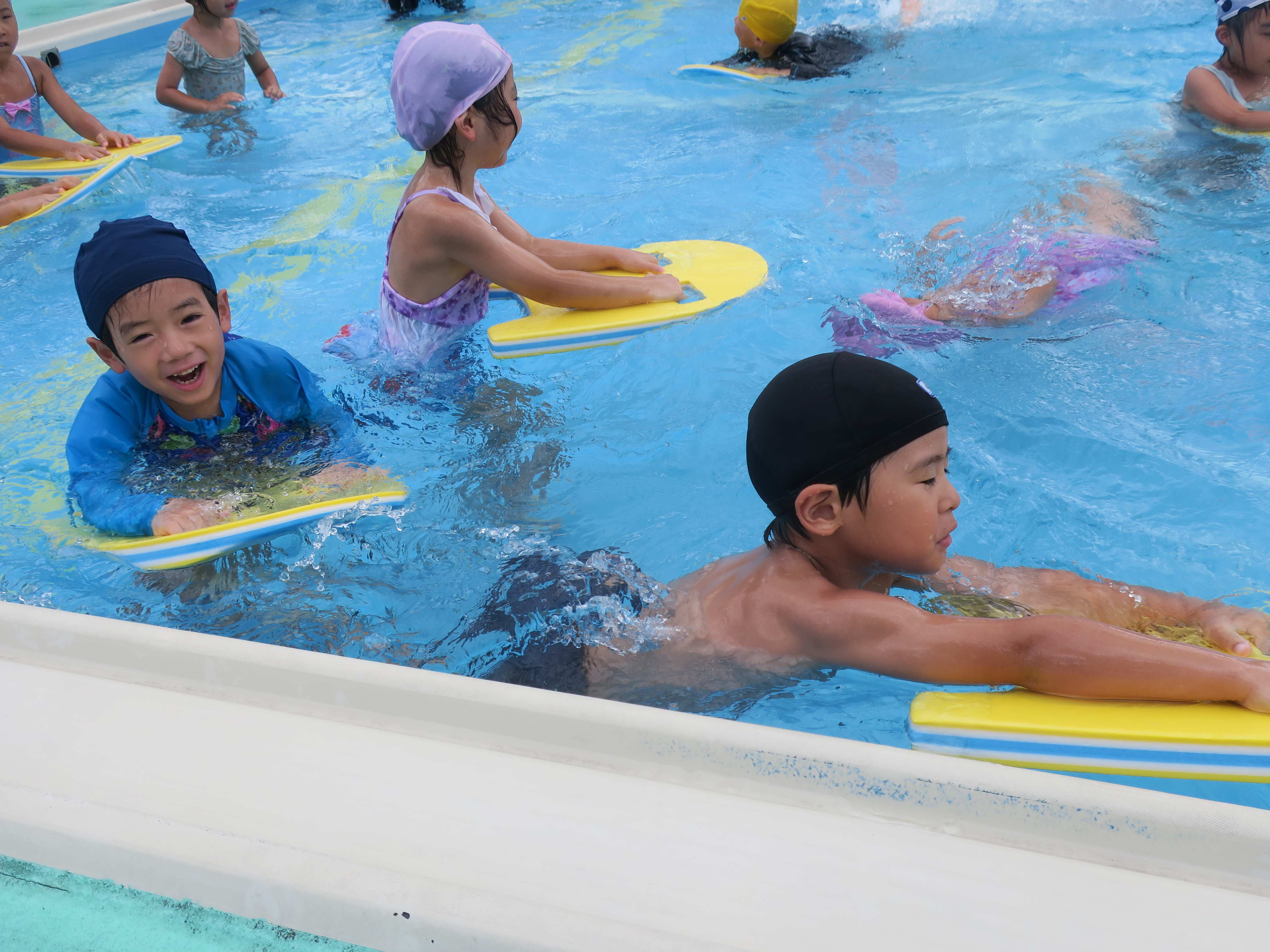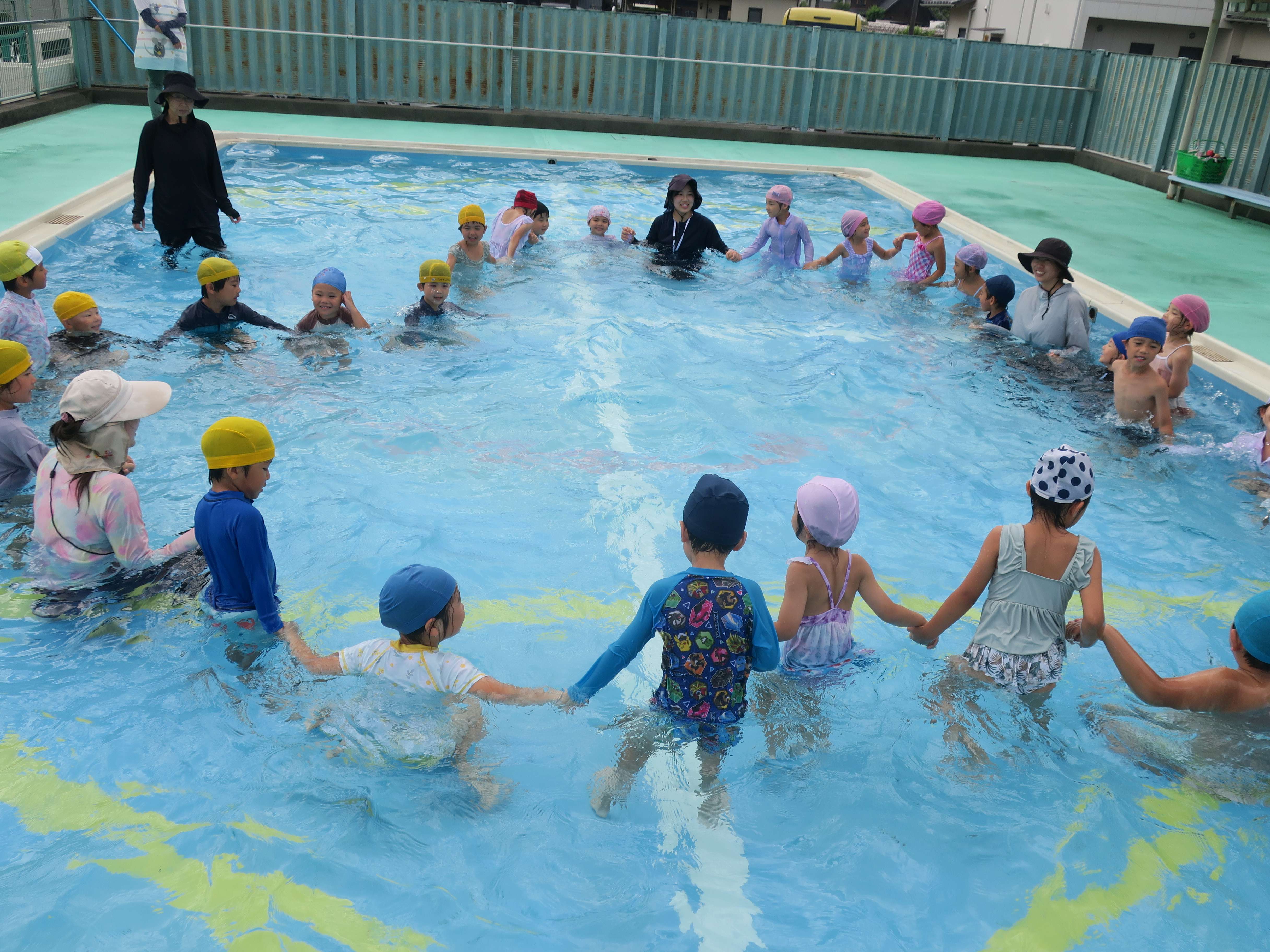 北庄内幼稚園へ行ってきました! 北庄内幼稚園のプールに招待してもらいました♪行きはバス、帰りはタクシーを使い、熱中症にも考慮して行ってくることができましたよ!とっても大きなプールに大はしゃぎの子どもたち。みんなで手をつないで大きな輪を作ったり、ビート版もお借りして広々と泳いだりと、交流を十分に楽しめたようです♪♪