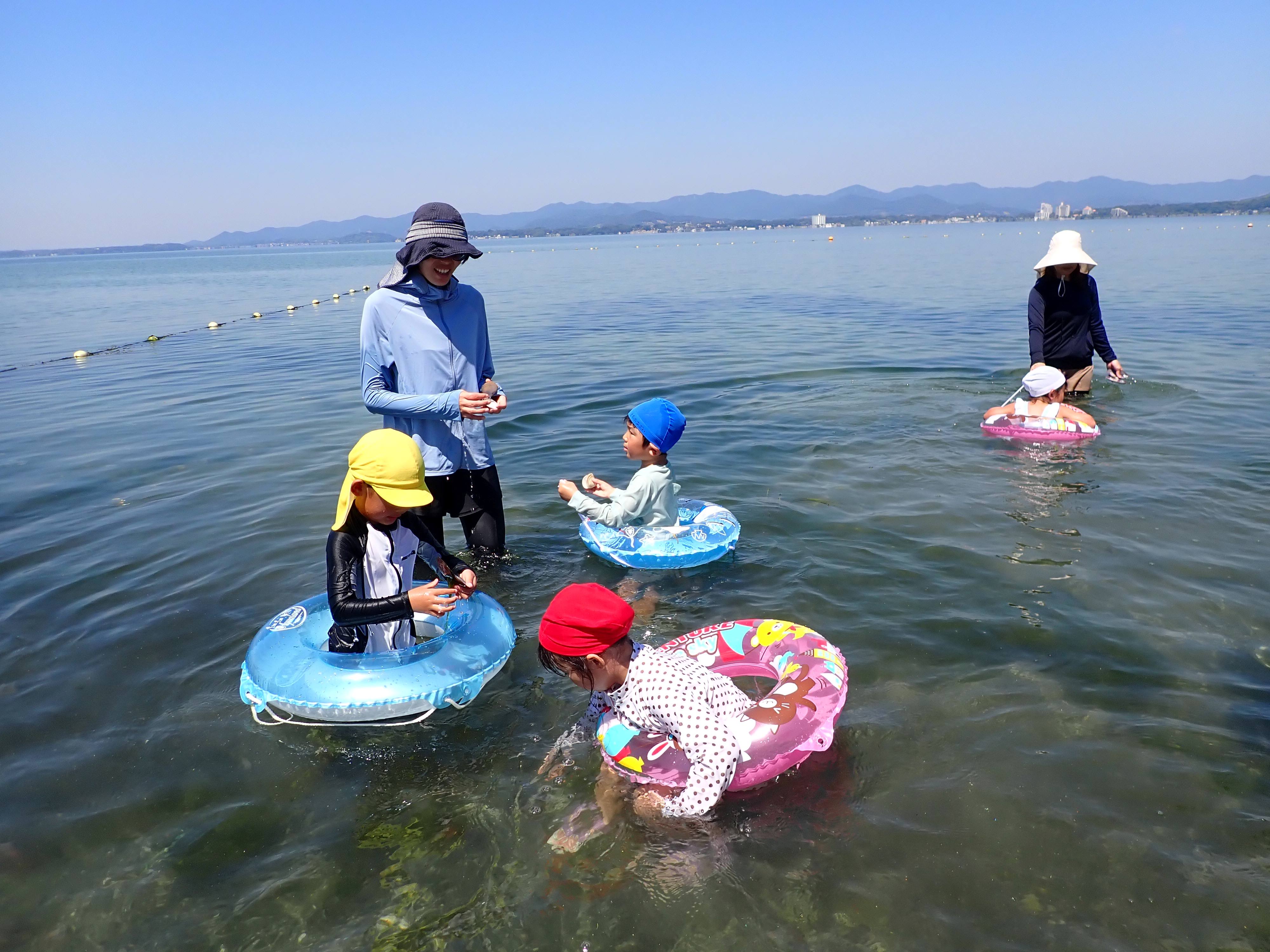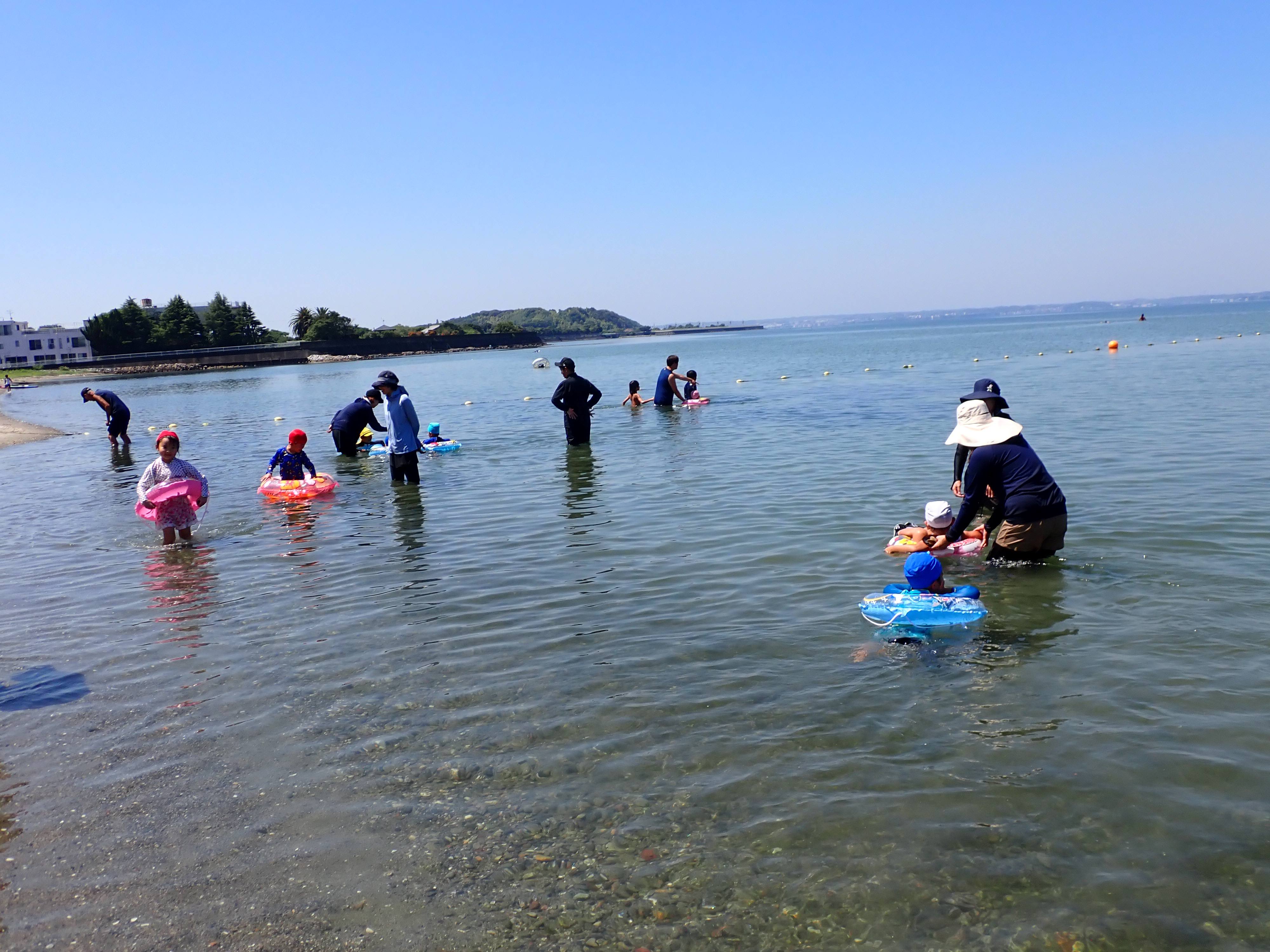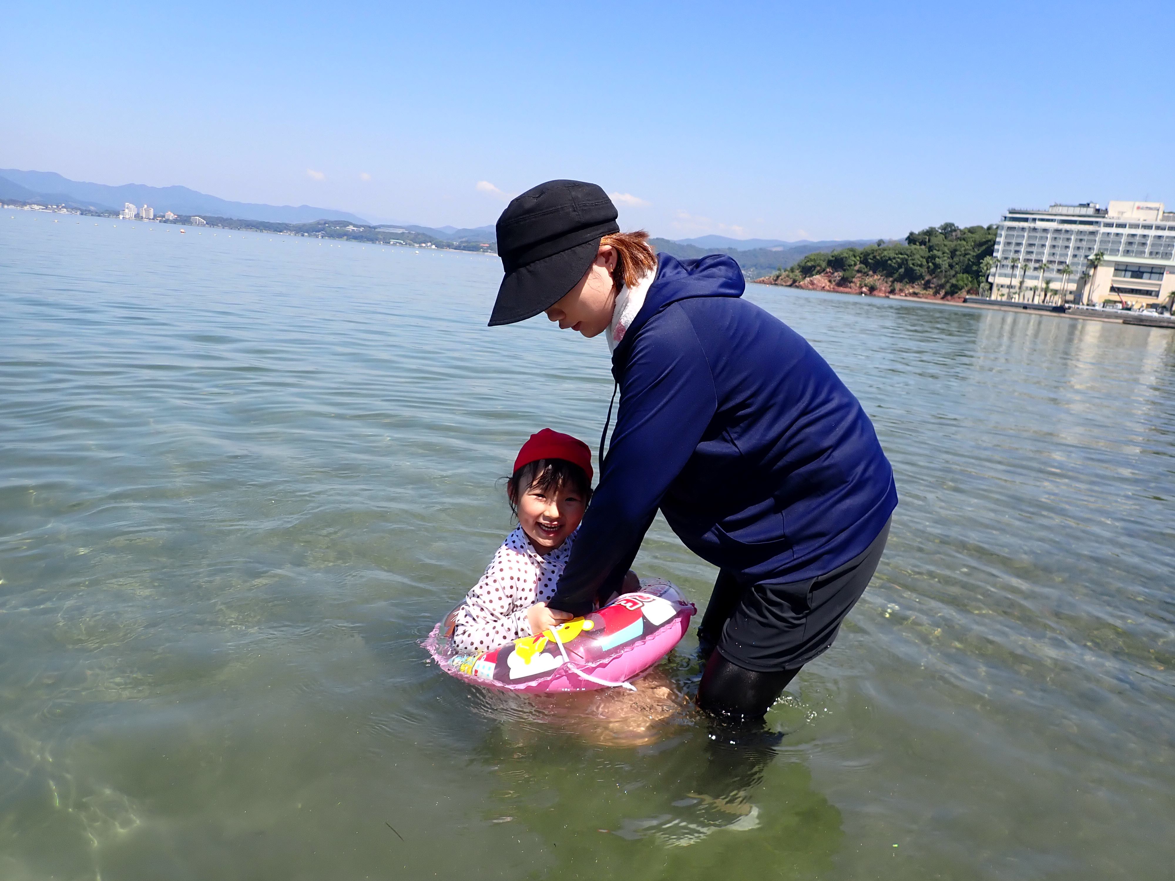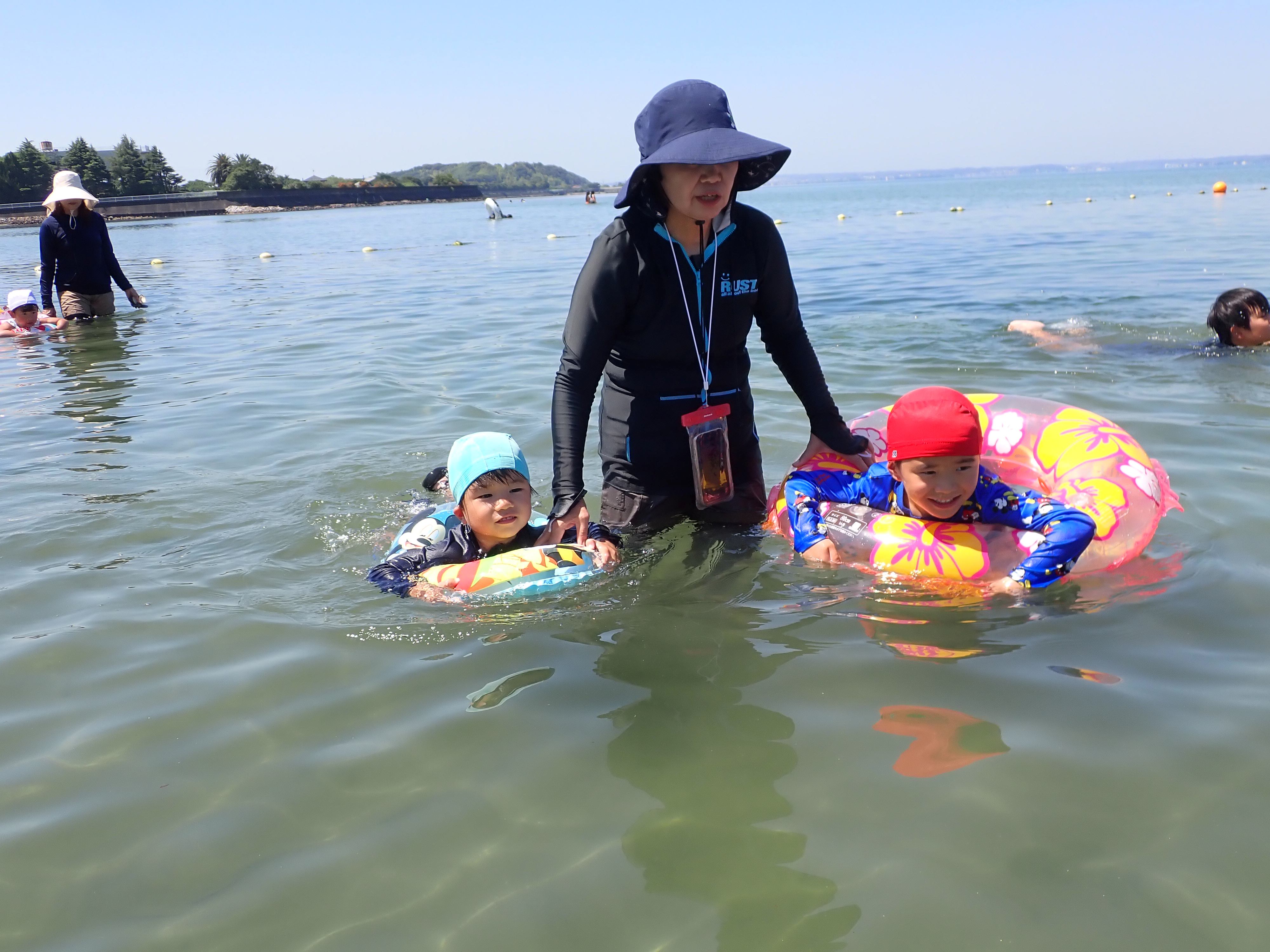 ゆり組さんが海水浴に行ってきました♪ ゆり組さんが初めての海水浴に行ってきました♪お手伝いに来て下さったおうちの方と手を繋いで、サンビーチに向かいました。サンビーチでは、おうちの方やお友だちと一緒に、浮き輪でぷかぷか浮いたり、魚や貝殻探しをしたりして楽しみました!お忙しい中海水浴のお手伝いに来て下さった保護者の皆様ありがとうございました!