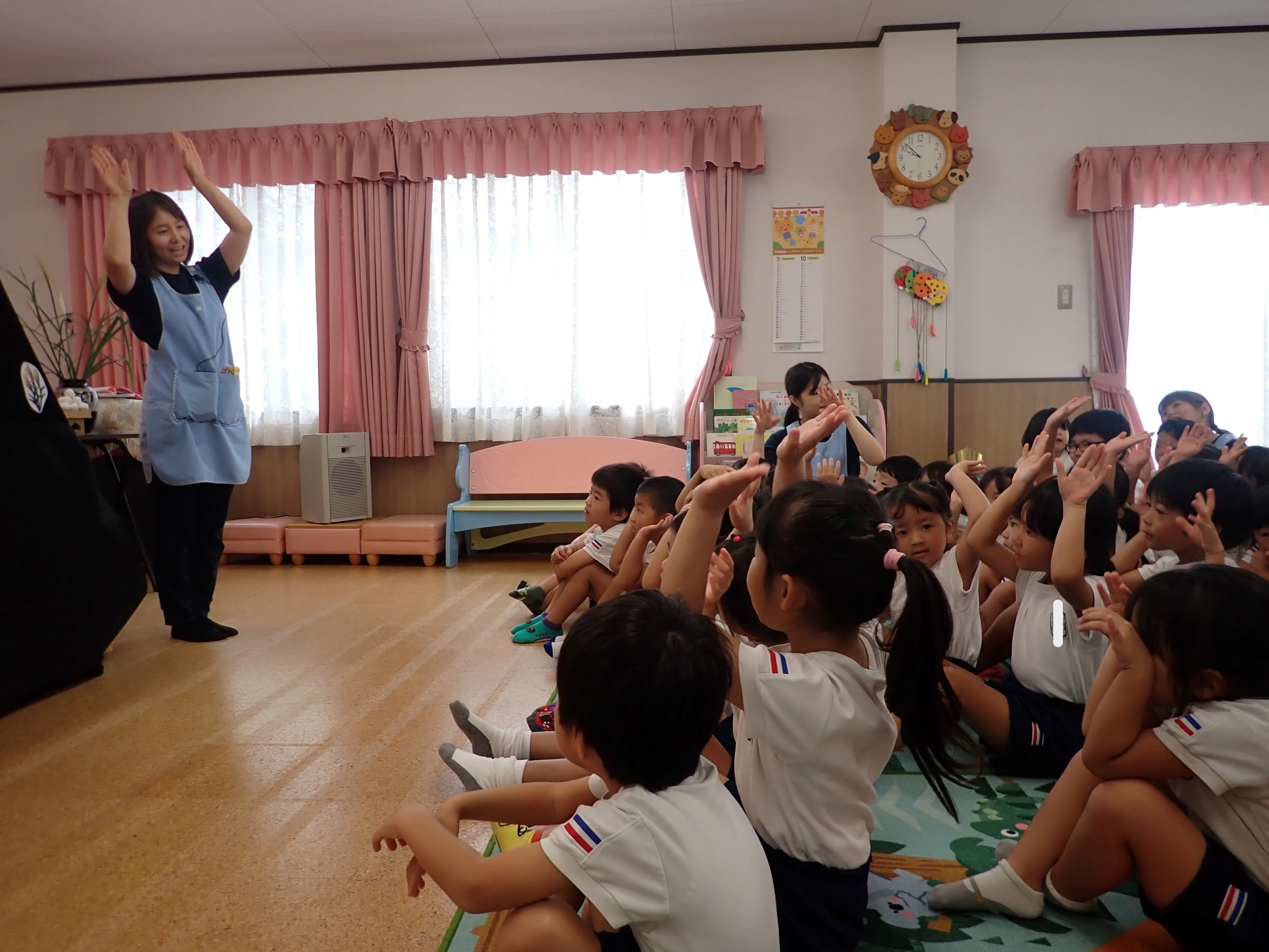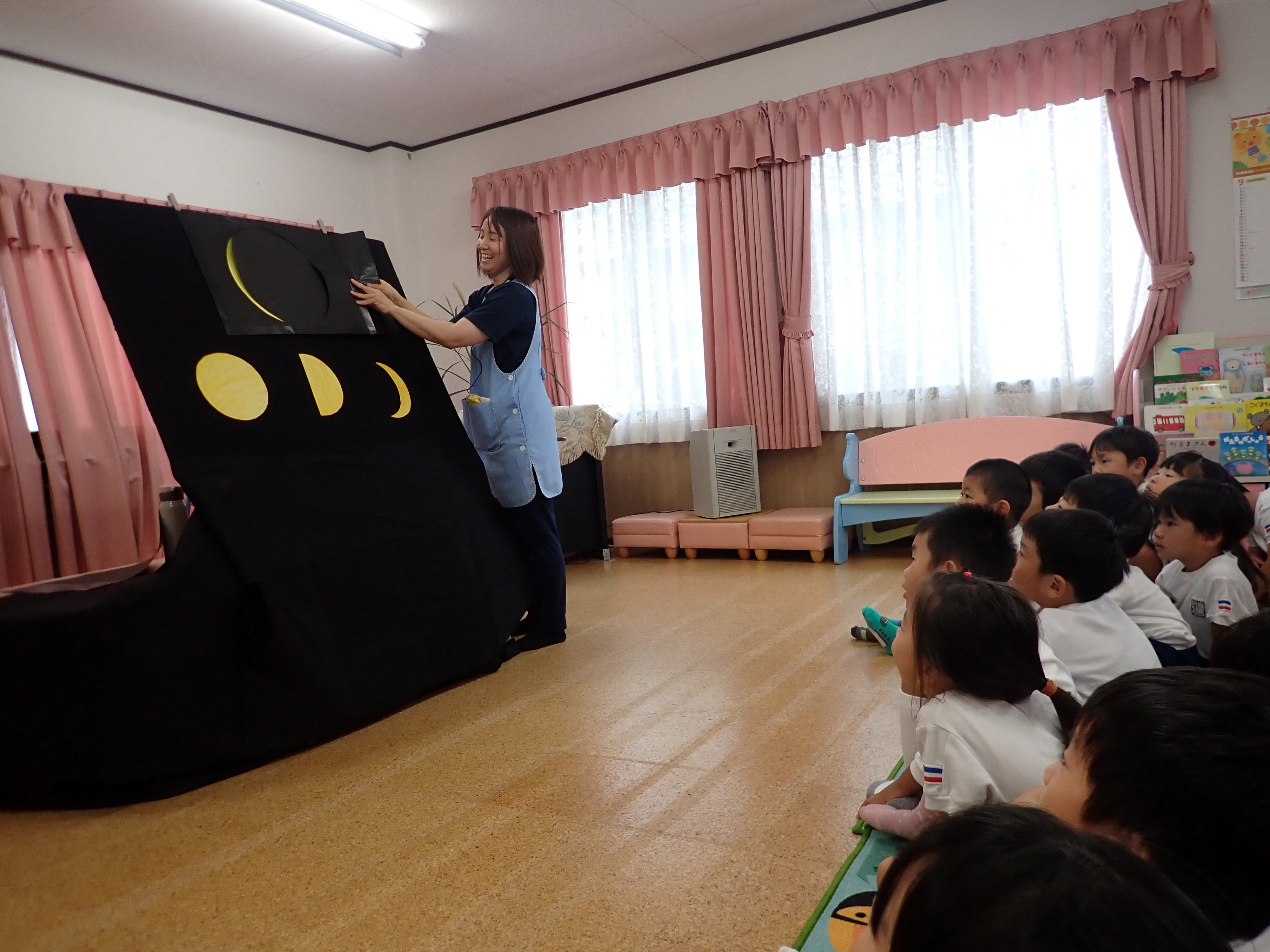10月のお誕生会がありました! 10月のお誕生会を行いました!10月生まれのお友だち、お誕生日おめでとう♪お誕生会のあとは、お月見会がありましたよ。「まんまるお月見」のパネルシアターを観たり、月の満ち欠けについてのお話を聞いたりしました。月の満ち欠けのお話では、「満月!半月!」とお話ししてくれる物知り博士のお友だちもいましたよ!