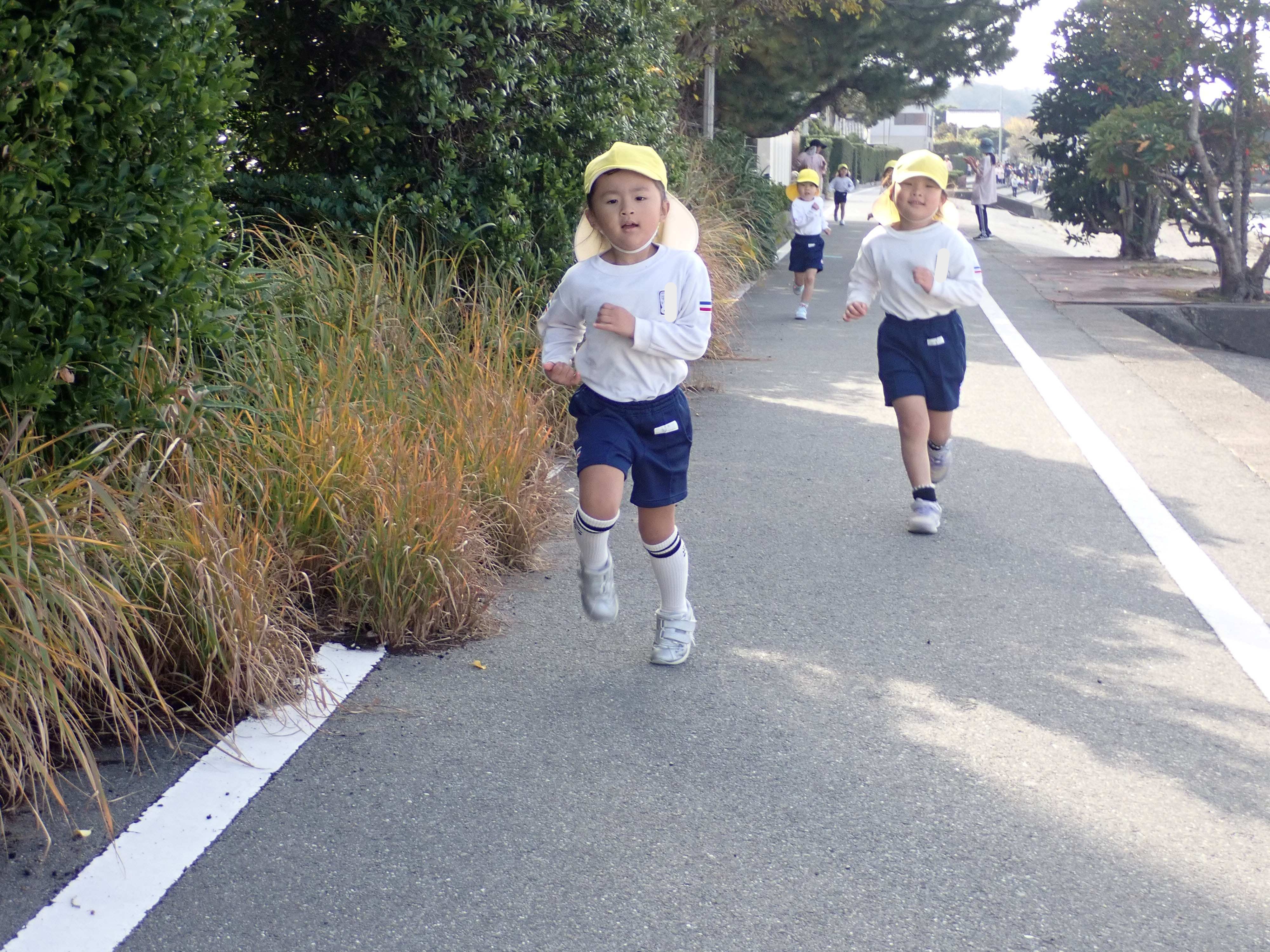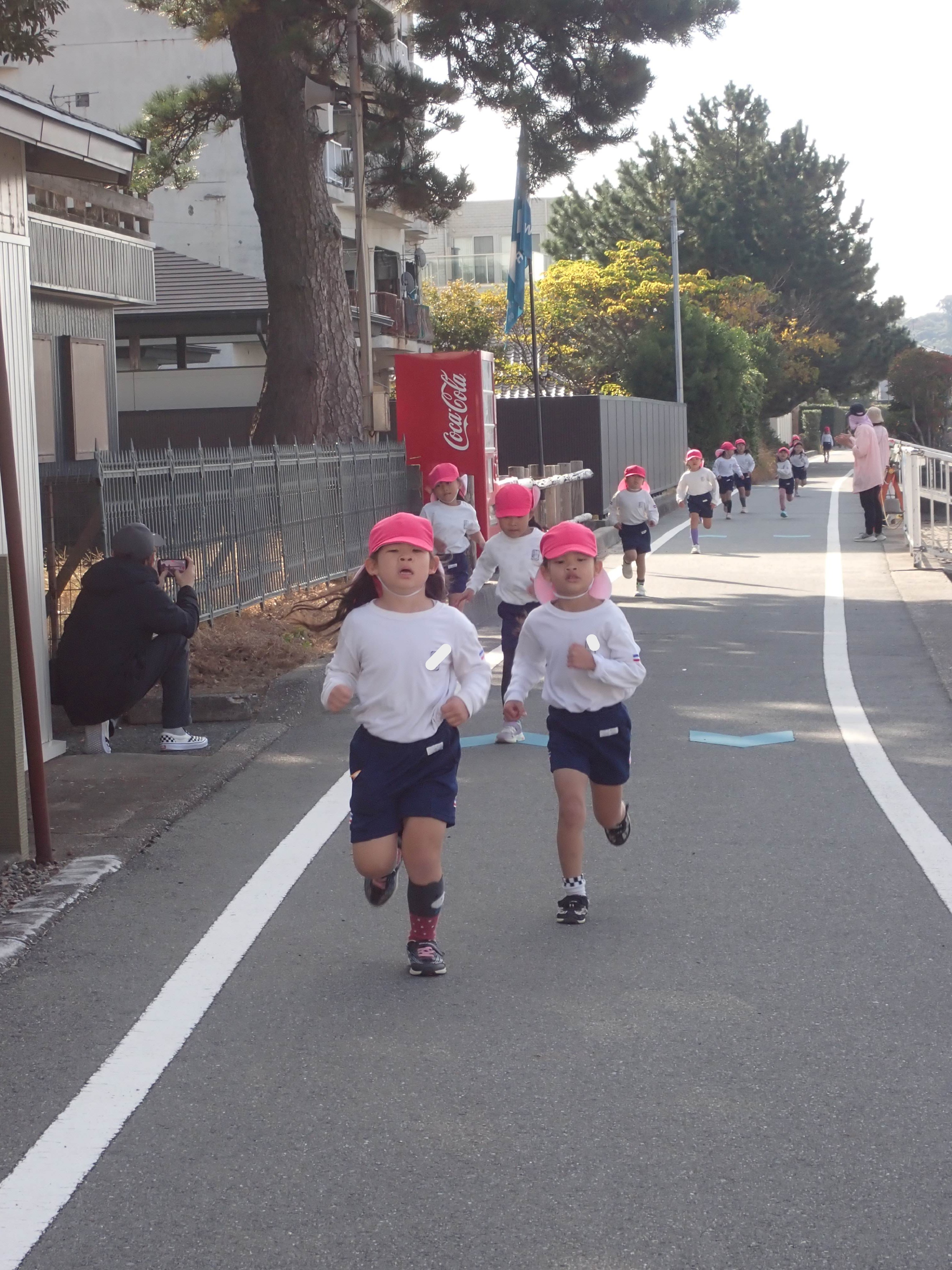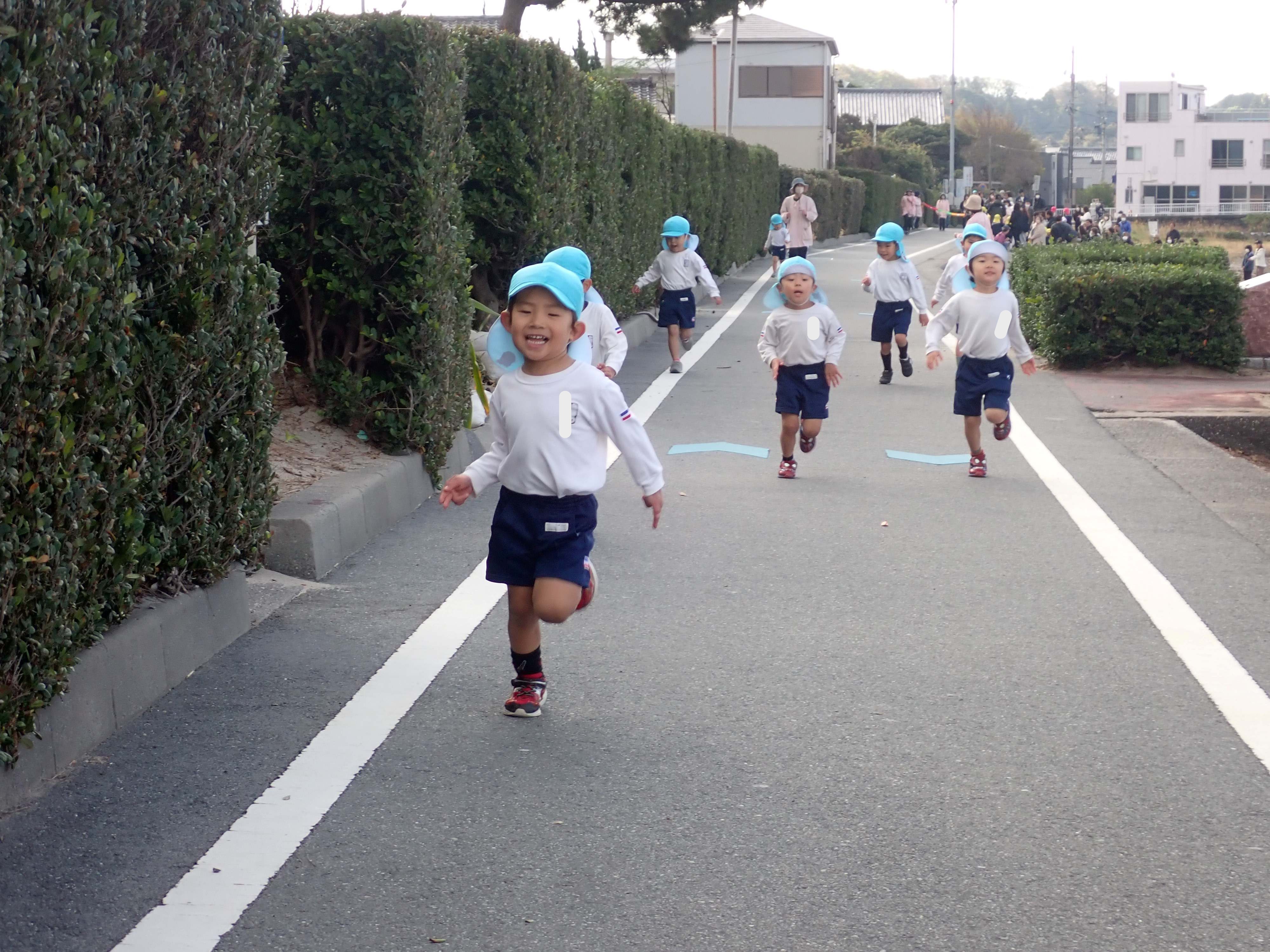 良いお天気のもと、サンビーチにてきく・ゆり・あやめ組のマラソン大会が行われました!まずはこども園の運動場でみんなで体操をしてから、サンビーチへ向かいましたよ。サンビーチでは、たくさんのおうちの方々が応援をしに来て下さっていました!きく・ゆり・あやめ組の順番に各学年ごとの距離を一生懸命走りました。お友だちやおうちの方の声援が響く中、諦めないで走り切る子どもたちの姿がとてもかっこよかったですよ!みんな最後まで頑張りました☆園に戻ってからは、みんなでホットカルピスを飲んで、先生からメダルをもらい嬉しそうな子どもたちでした。応援に来て下さった保護者の皆様、ありがとうございました。
