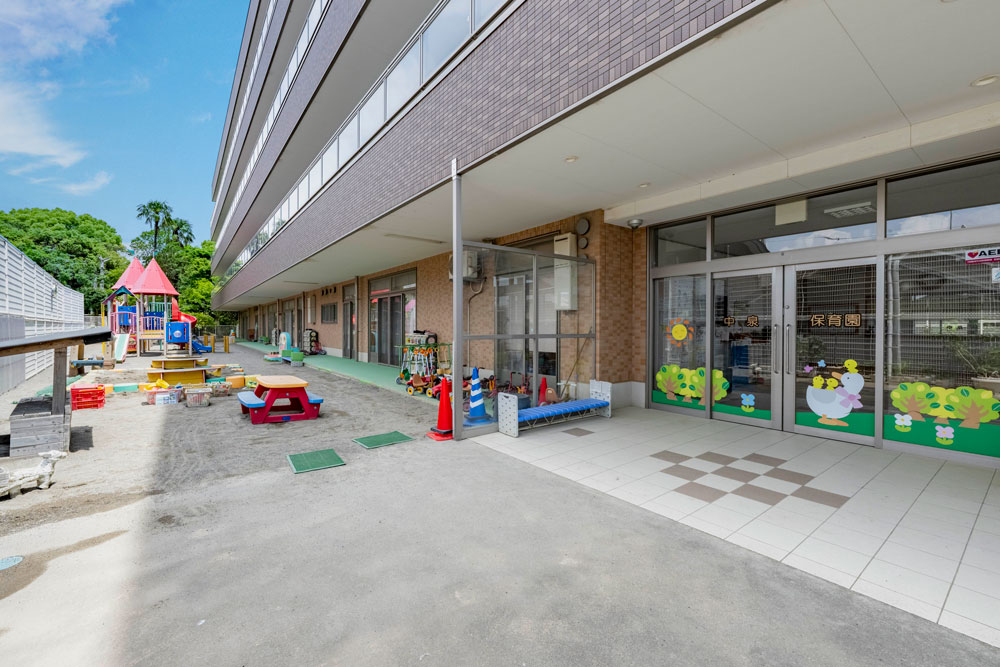 | 敷地面積・建物(園舎) | 敷地面積:4827.48㎡ 園舎:鉄骨構造地上5階建 1階:中泉保育園 2階~4階:中泉の里(特養) 5階:屋上 |