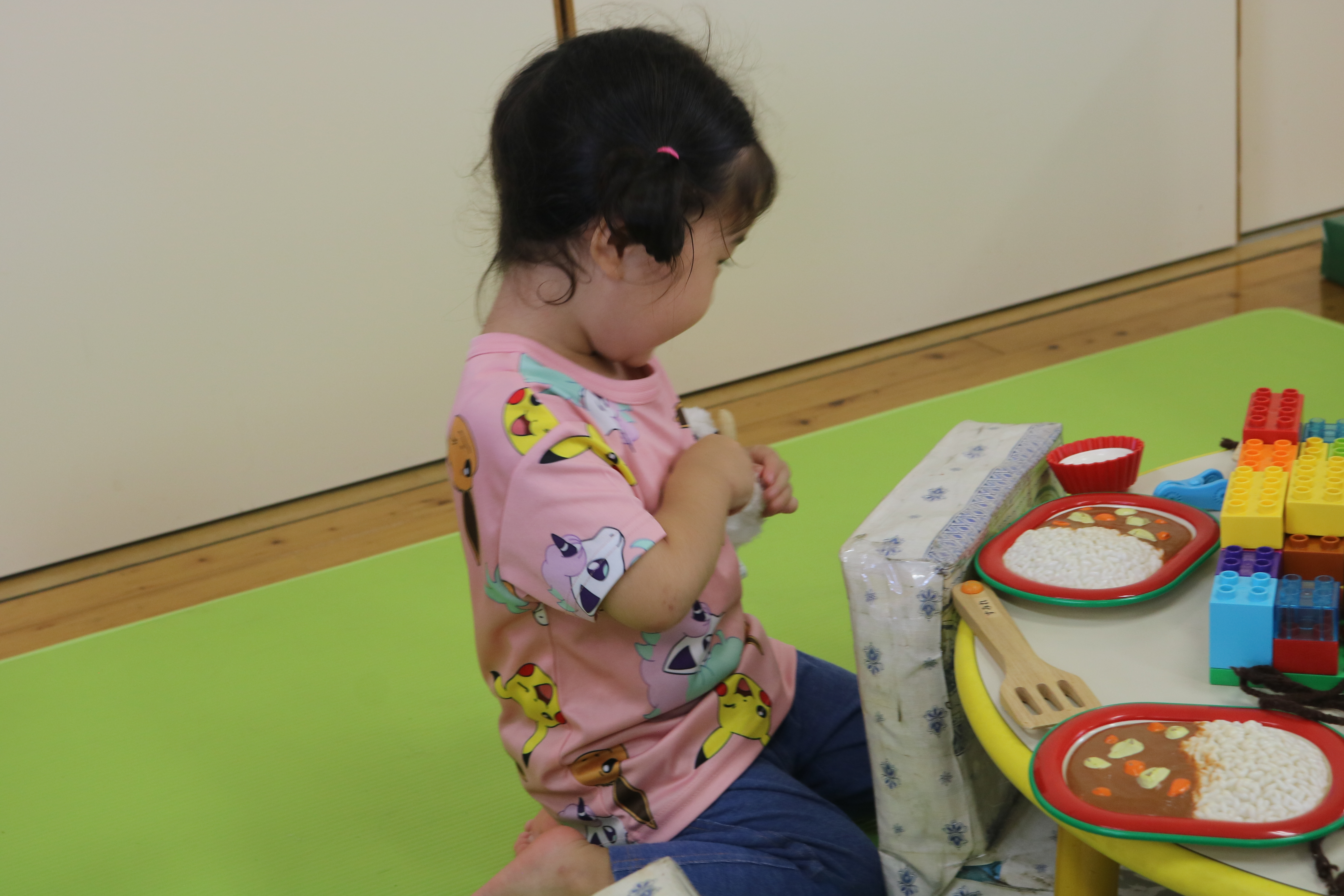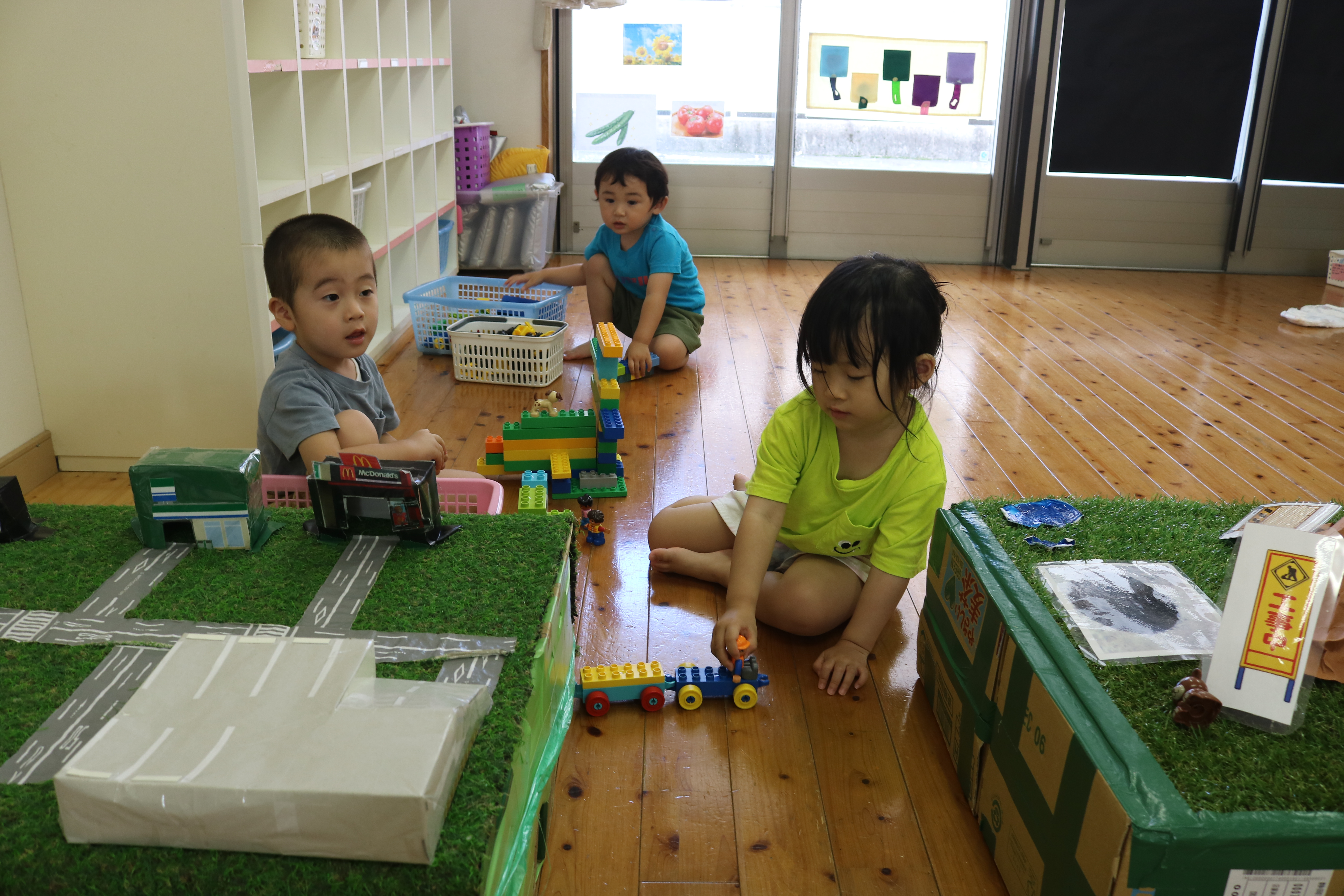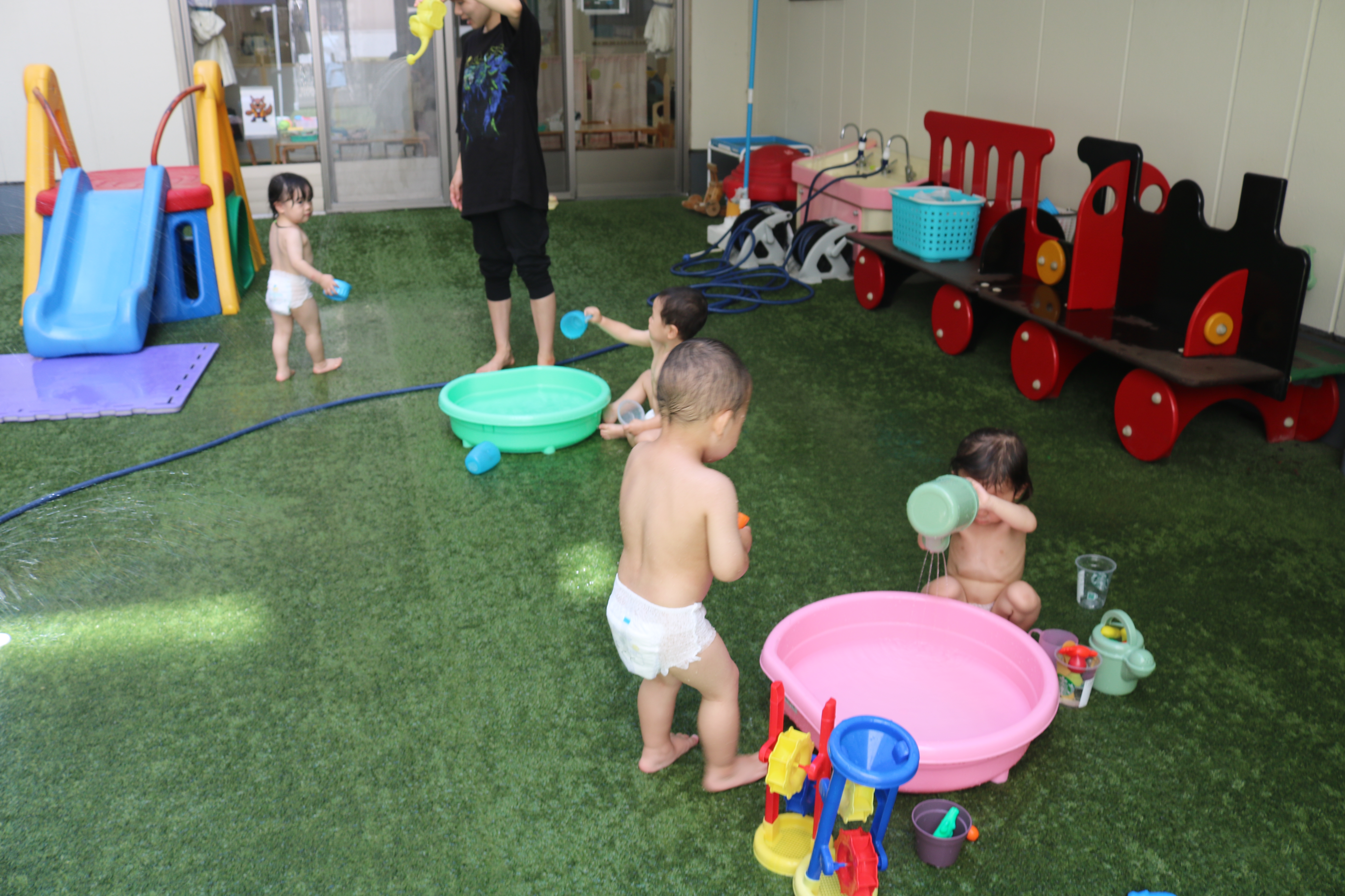 いっぱい遊んだよ! ~もも・さくら・すみれ・きく~ さくら組 さくら組 すみれ組 すみれ組 きく組 きく組 木陰を利用して水遊びをして楽しんでいました。汗を流してさっぱりしますね。 水遊び後は水分補給をしたり、お部屋で遊んだりしましたよ。