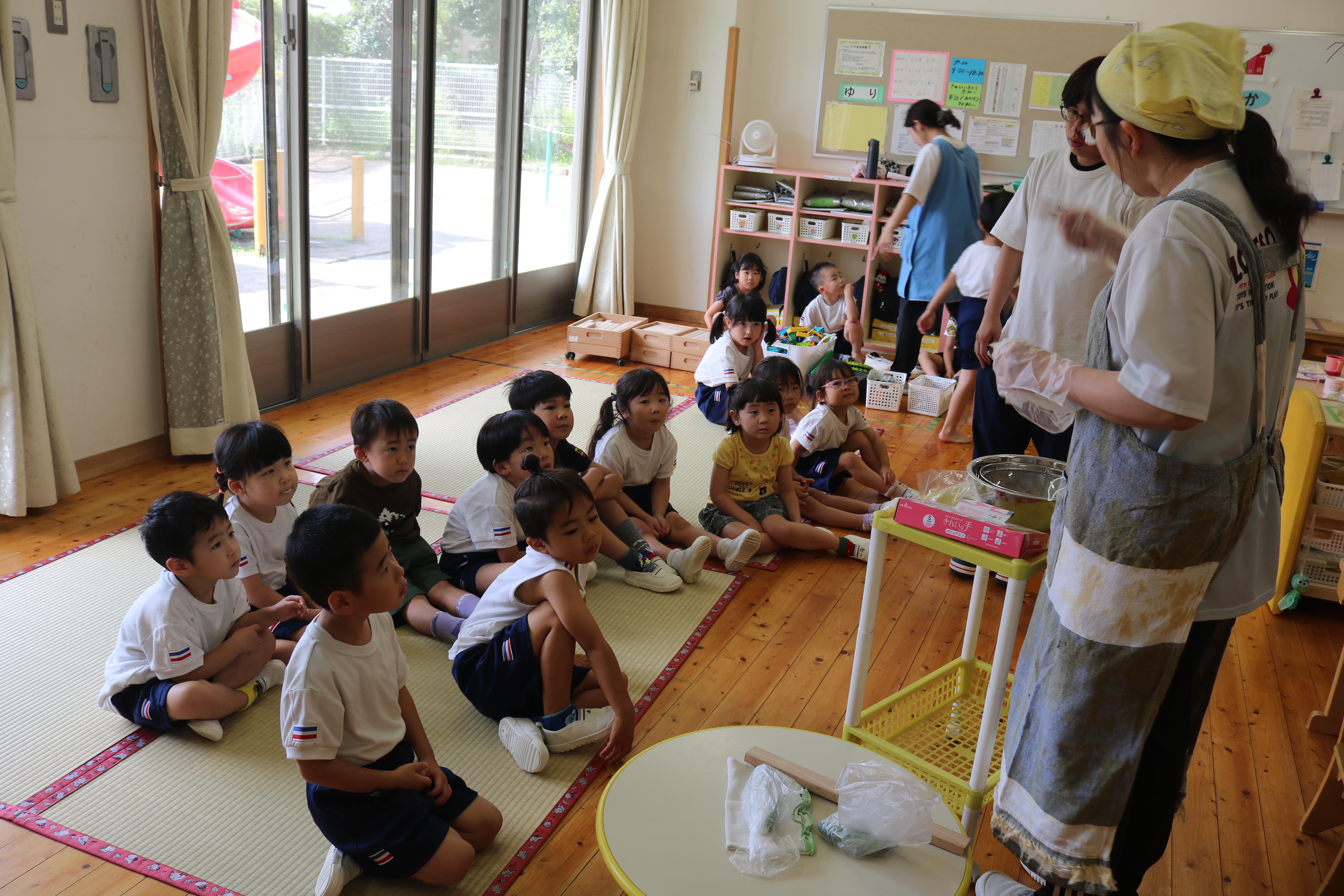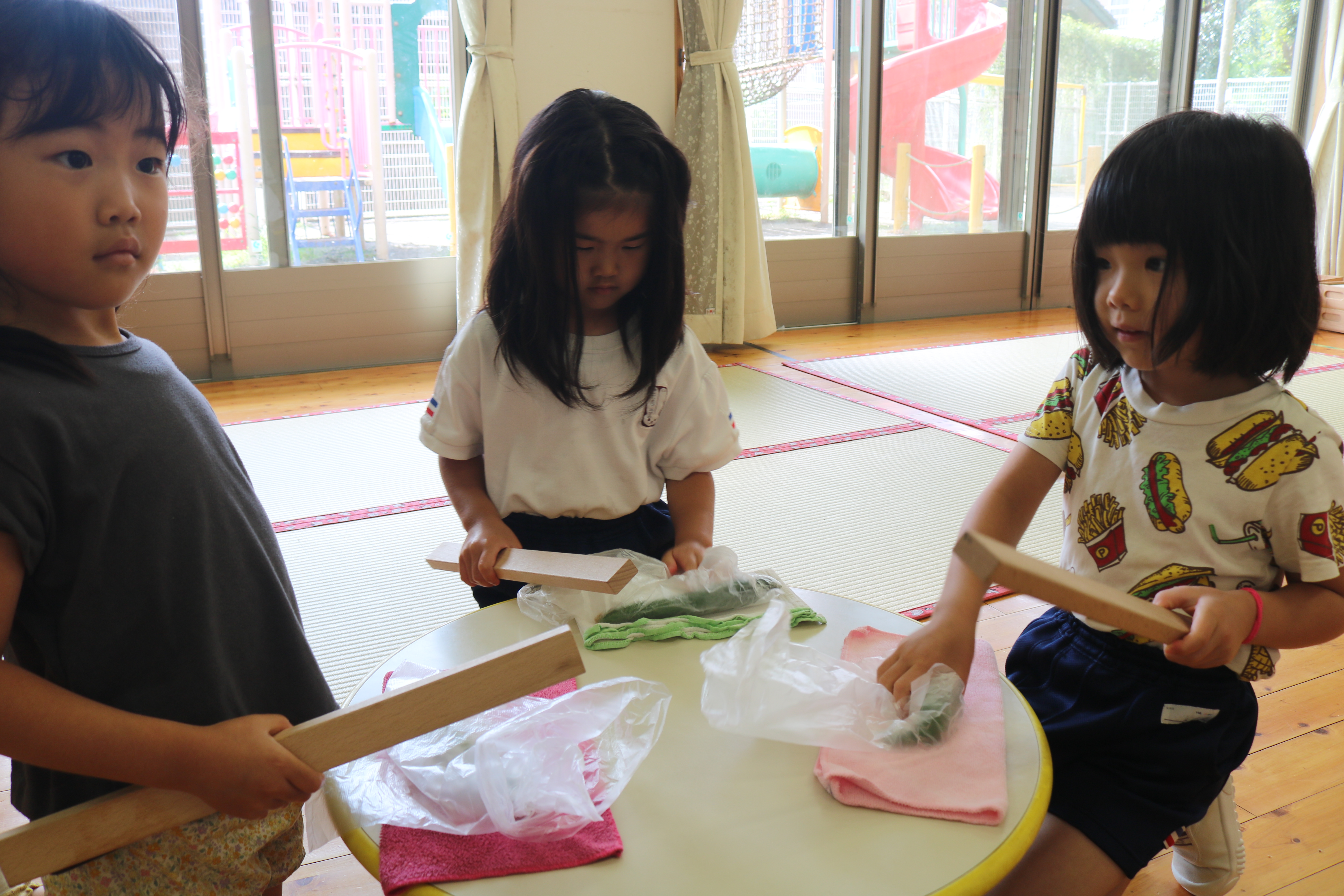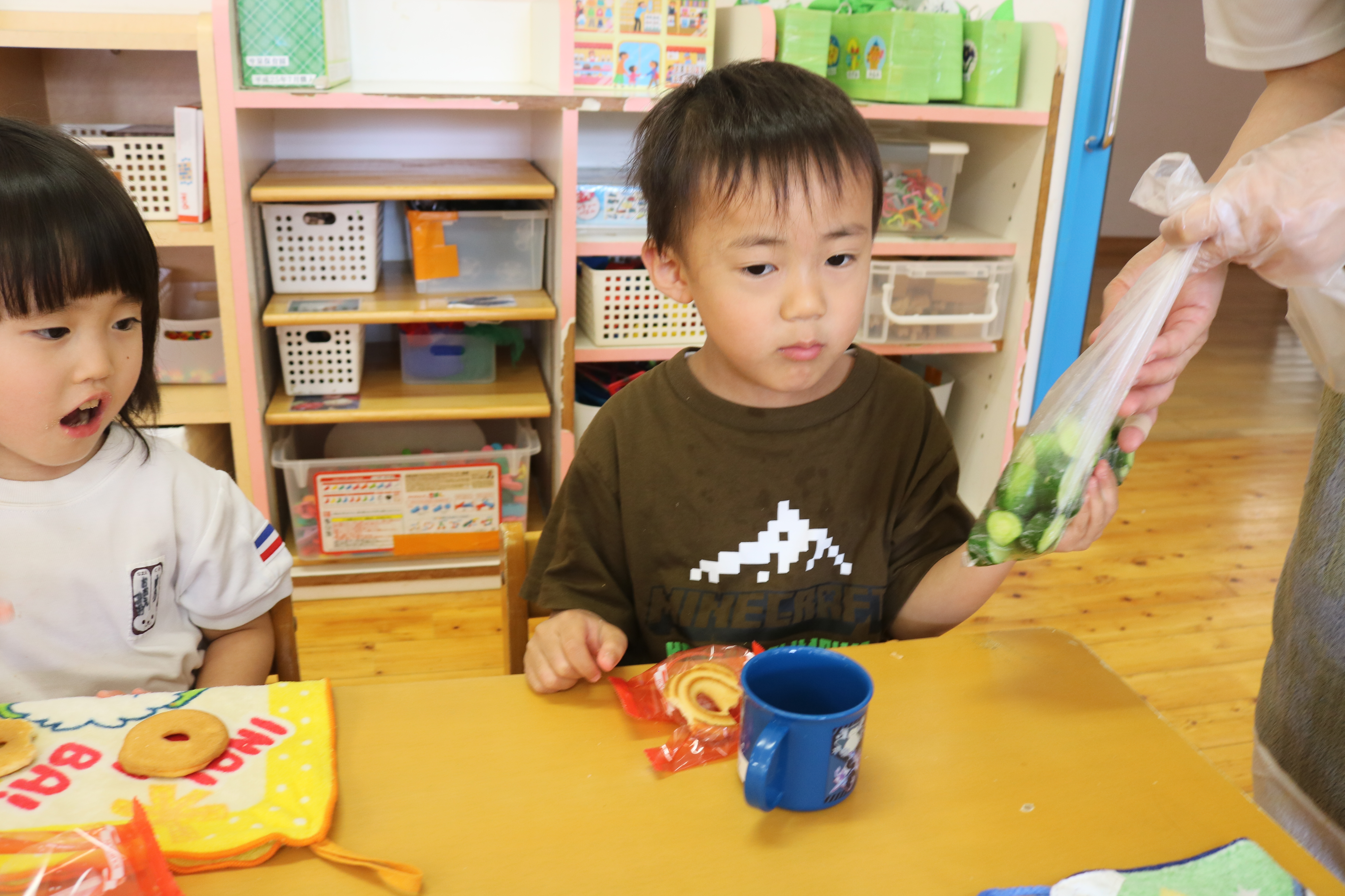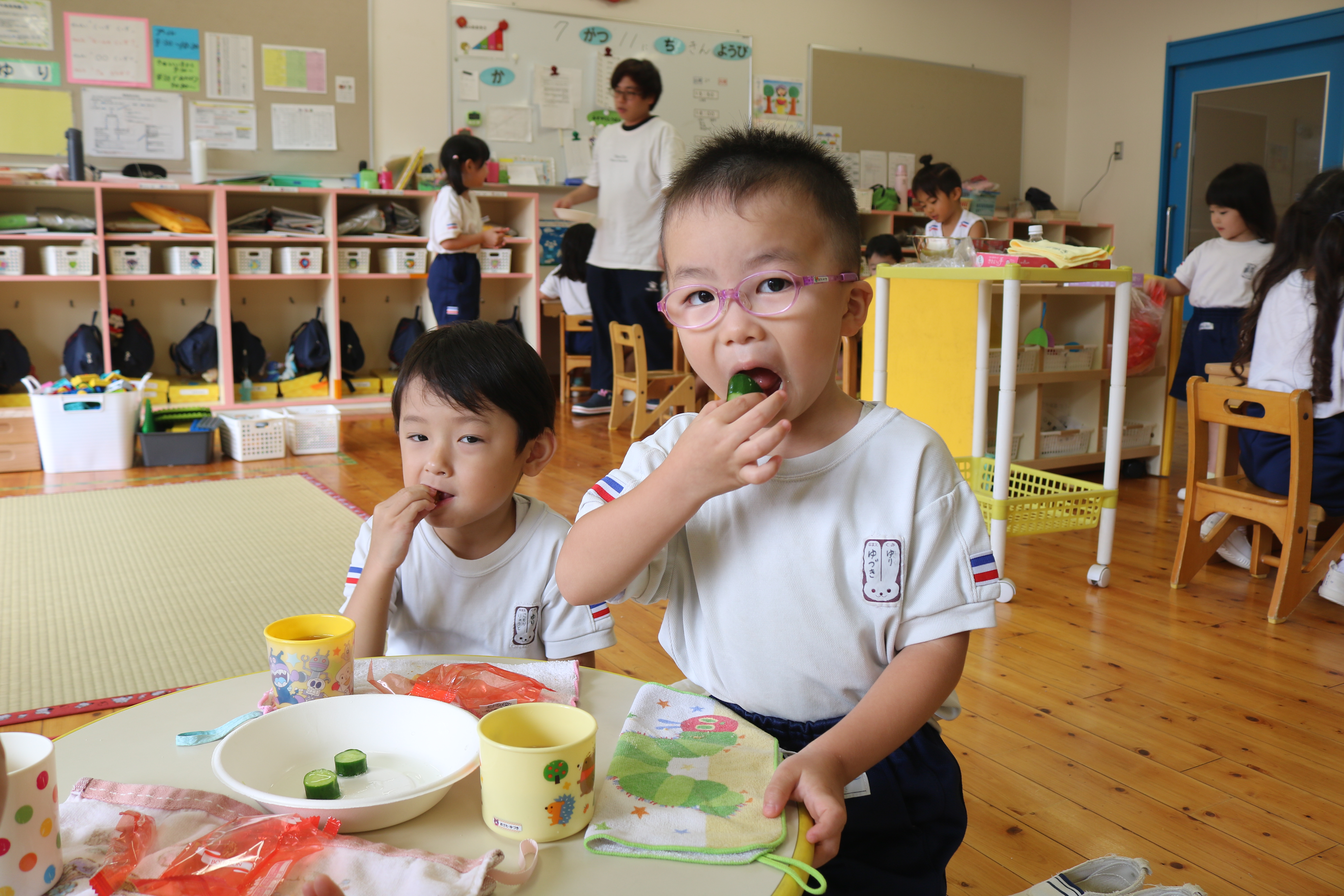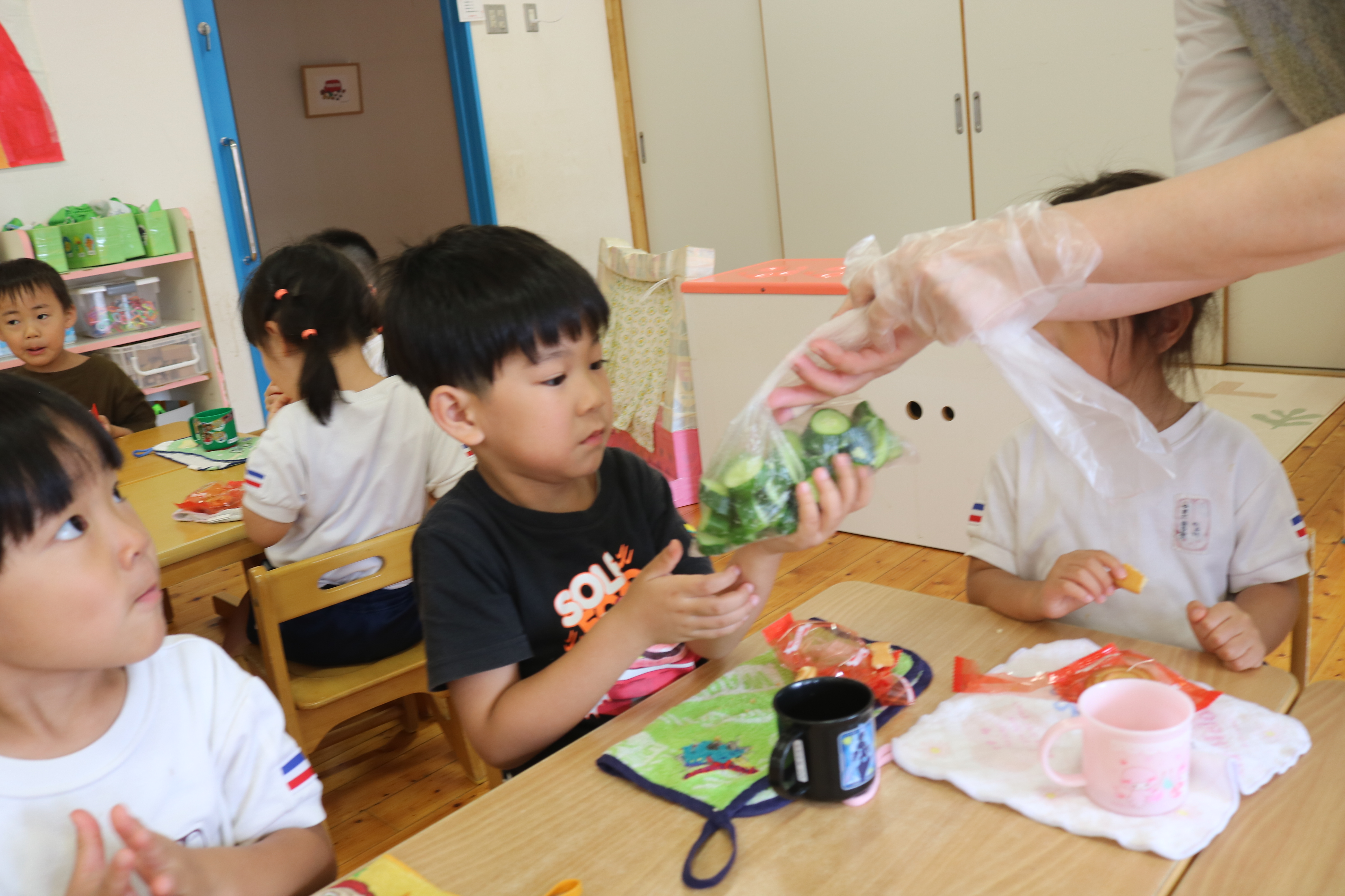 キュウリを収穫して食べたよ!~ゆり組~ 画像説明文 朝収穫したきゅうりを「たたききゅうり」にしました。子どもたちの力が優しくて全くつぶれなかったので、職員が包丁できゅうりを切り、袋の中で塩もみをして食しました。またチャレンジしようね!