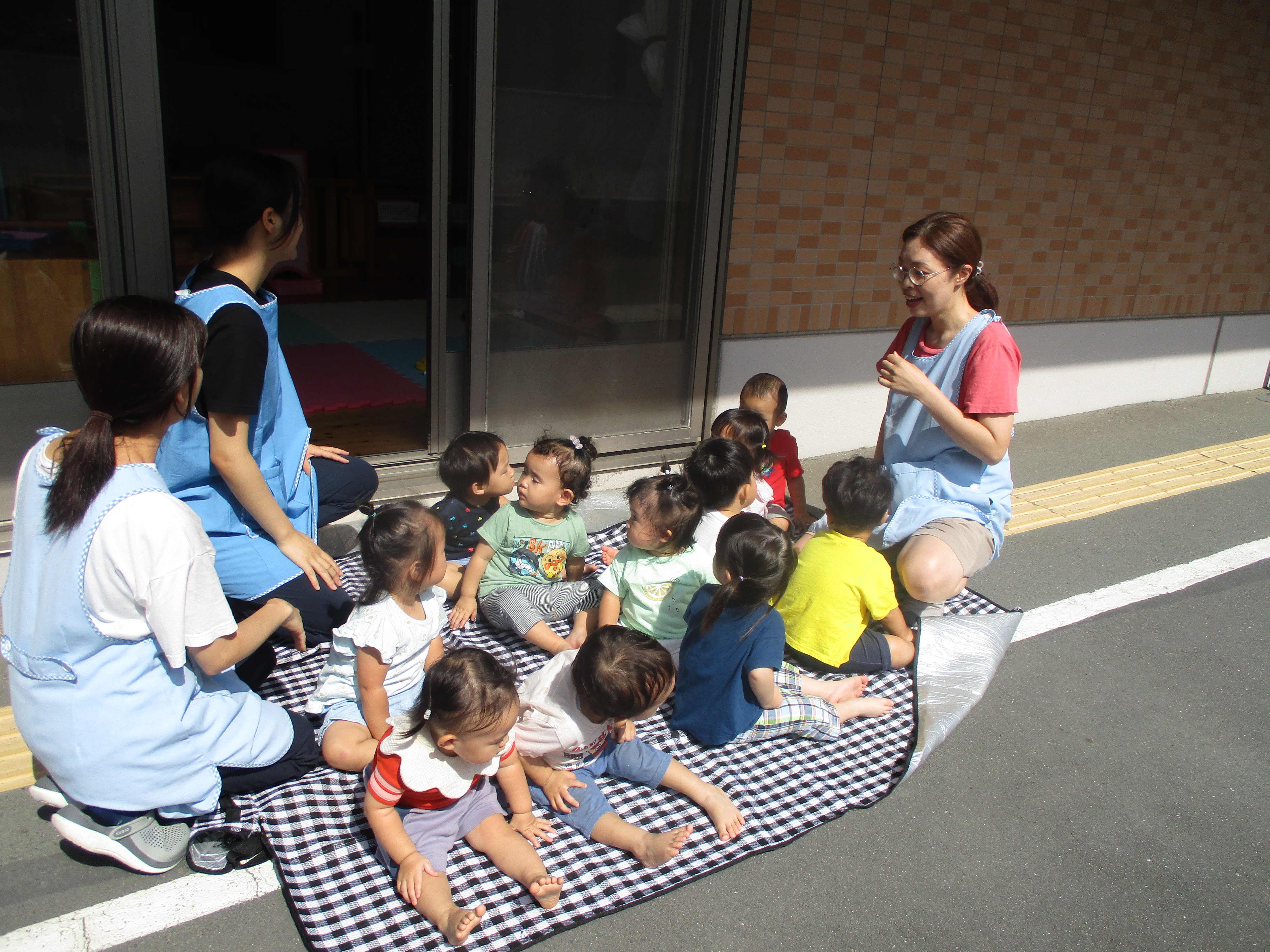 来月9月からは、また運動遊びに戻ります。暑い日は遊戯室で、涼しくなってきたら5階屋上の芝生広場でのびのび体を動かして楽しんでいきます。