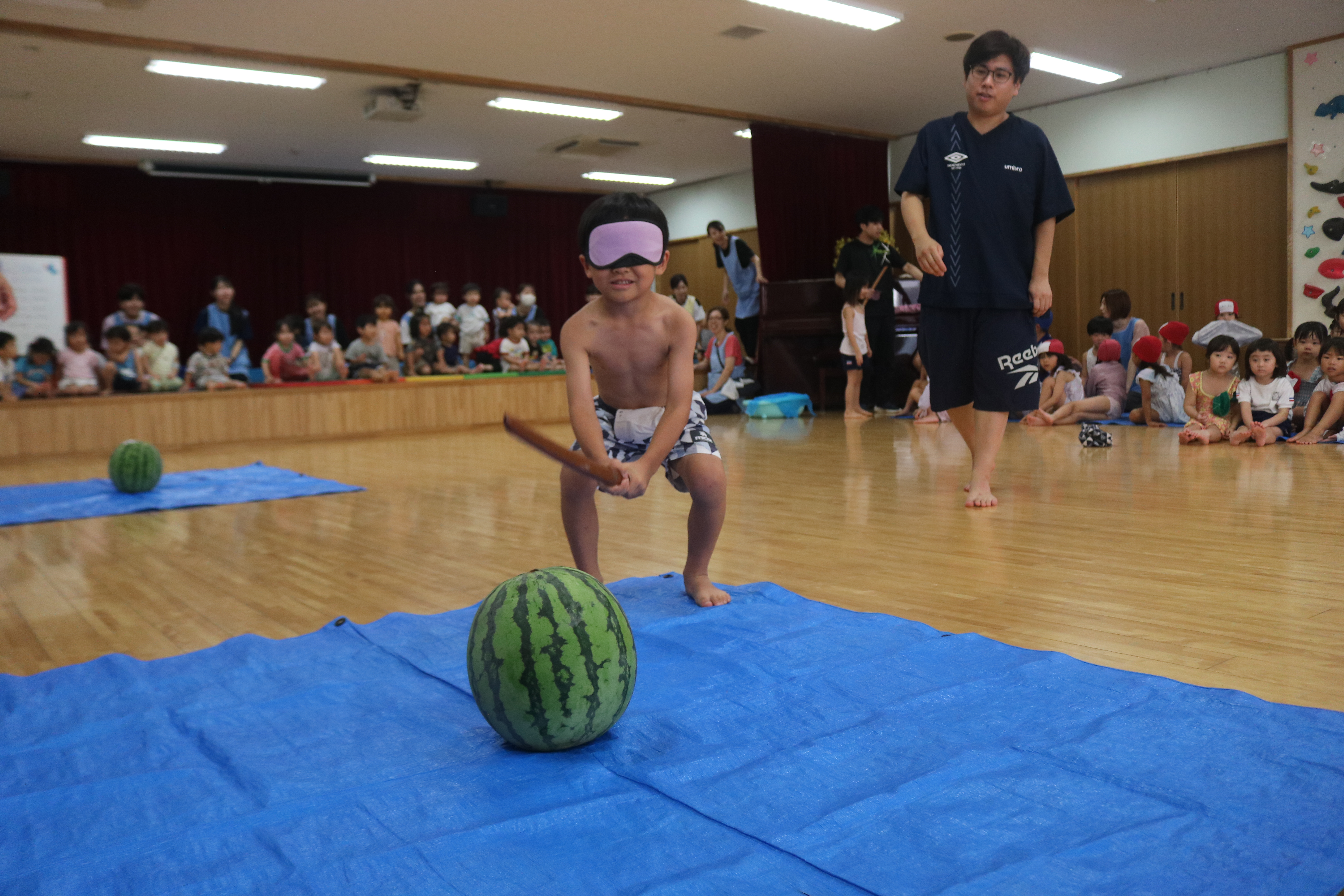 みんなの「前!後ろ!」という声援に合わせて、棒を振りかざし、集中して取り組む姿が見られました。小さいクラスの子どもたちも応援に来てくれましたよ。その後、すいかをみんなでおいしくいただきました。