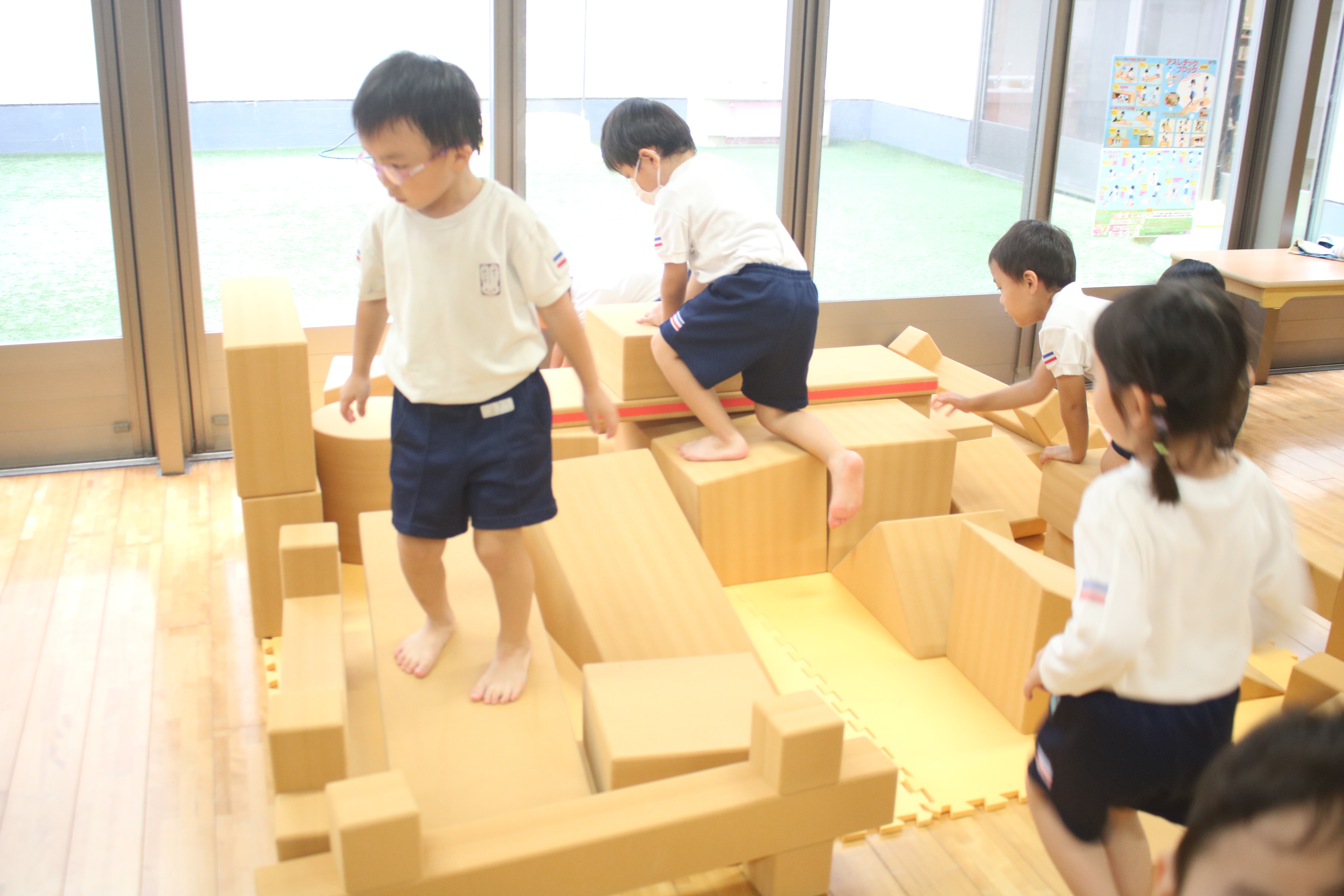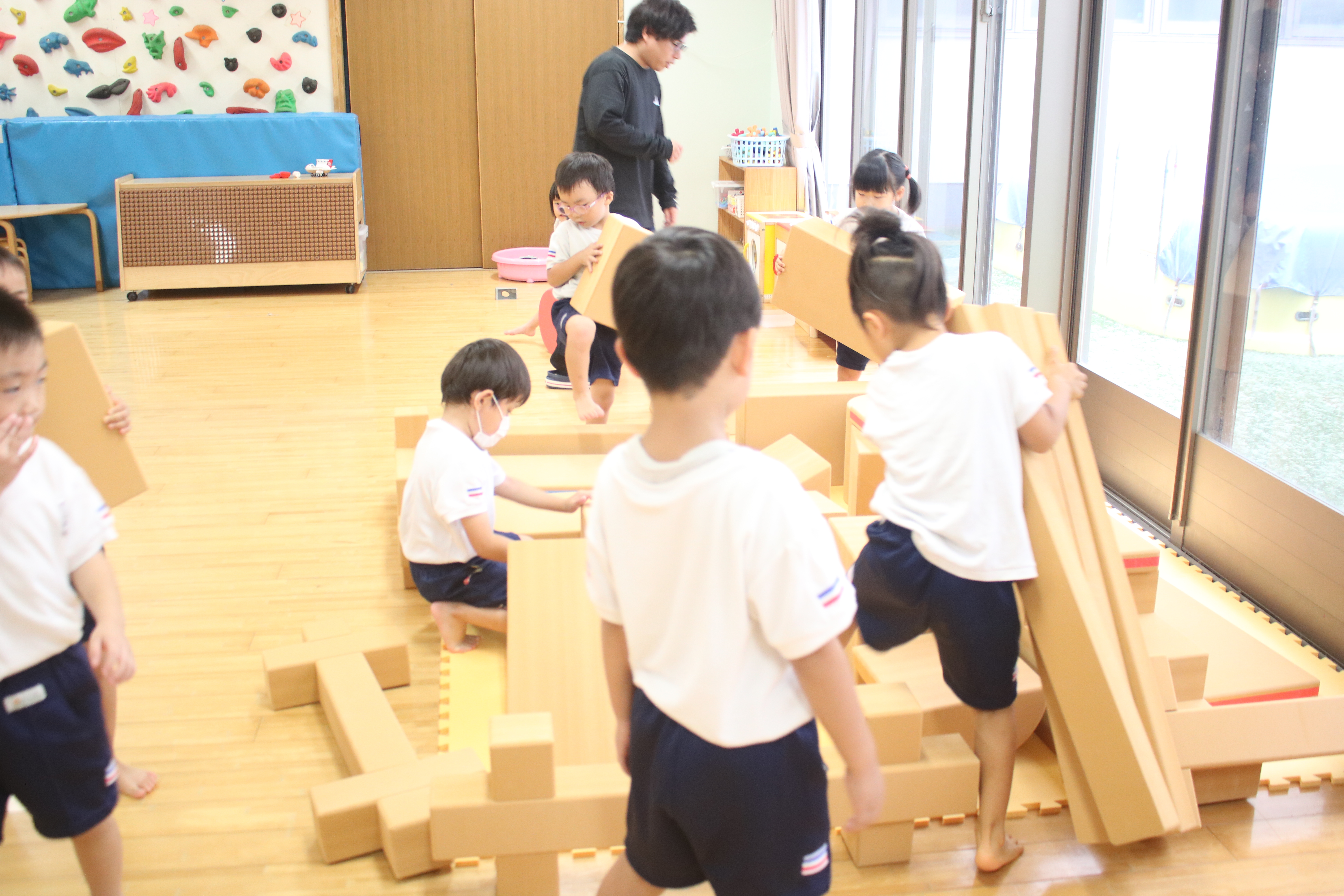 ゆり組 大型積み木を自分たちで考えアスレチックを作成中
