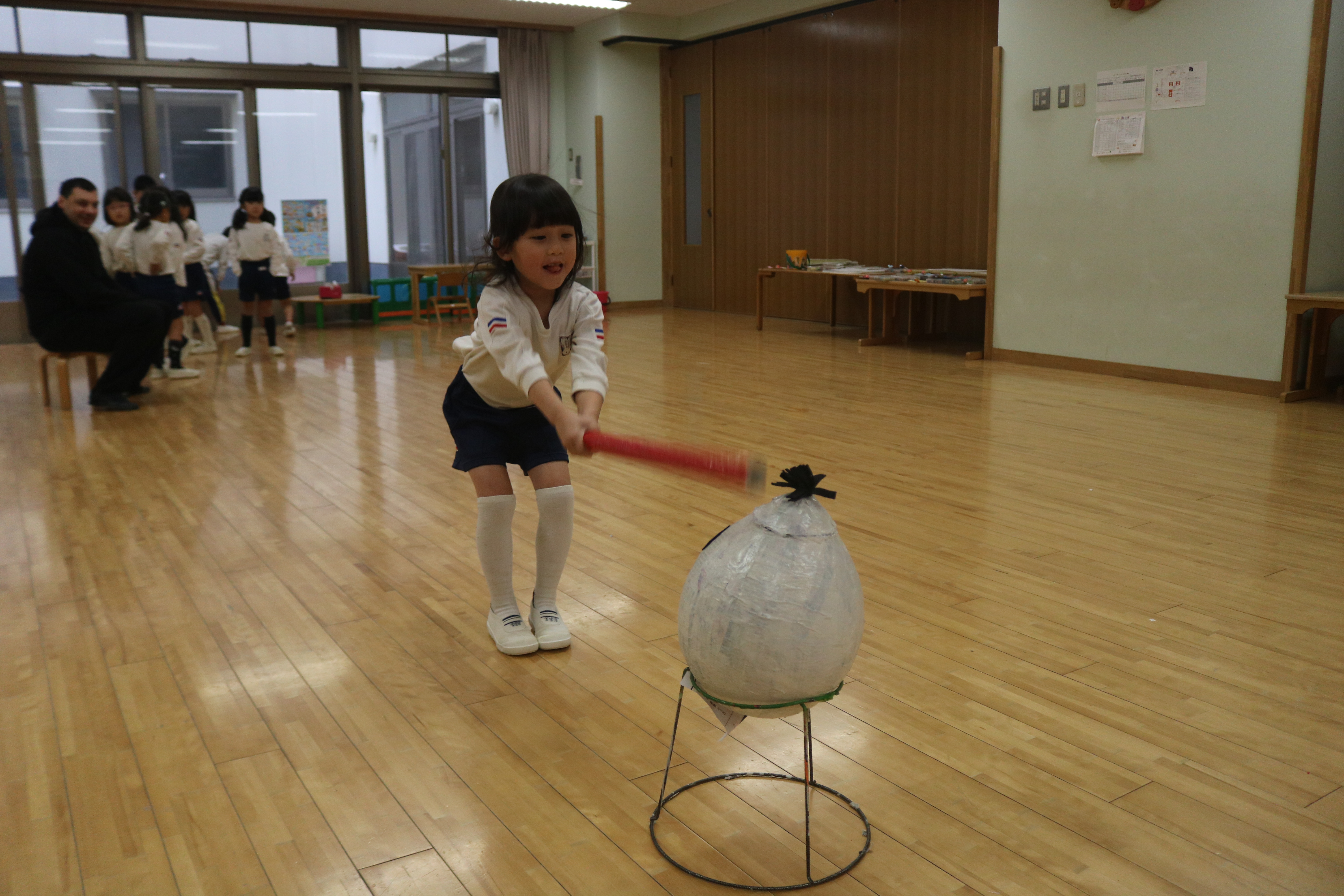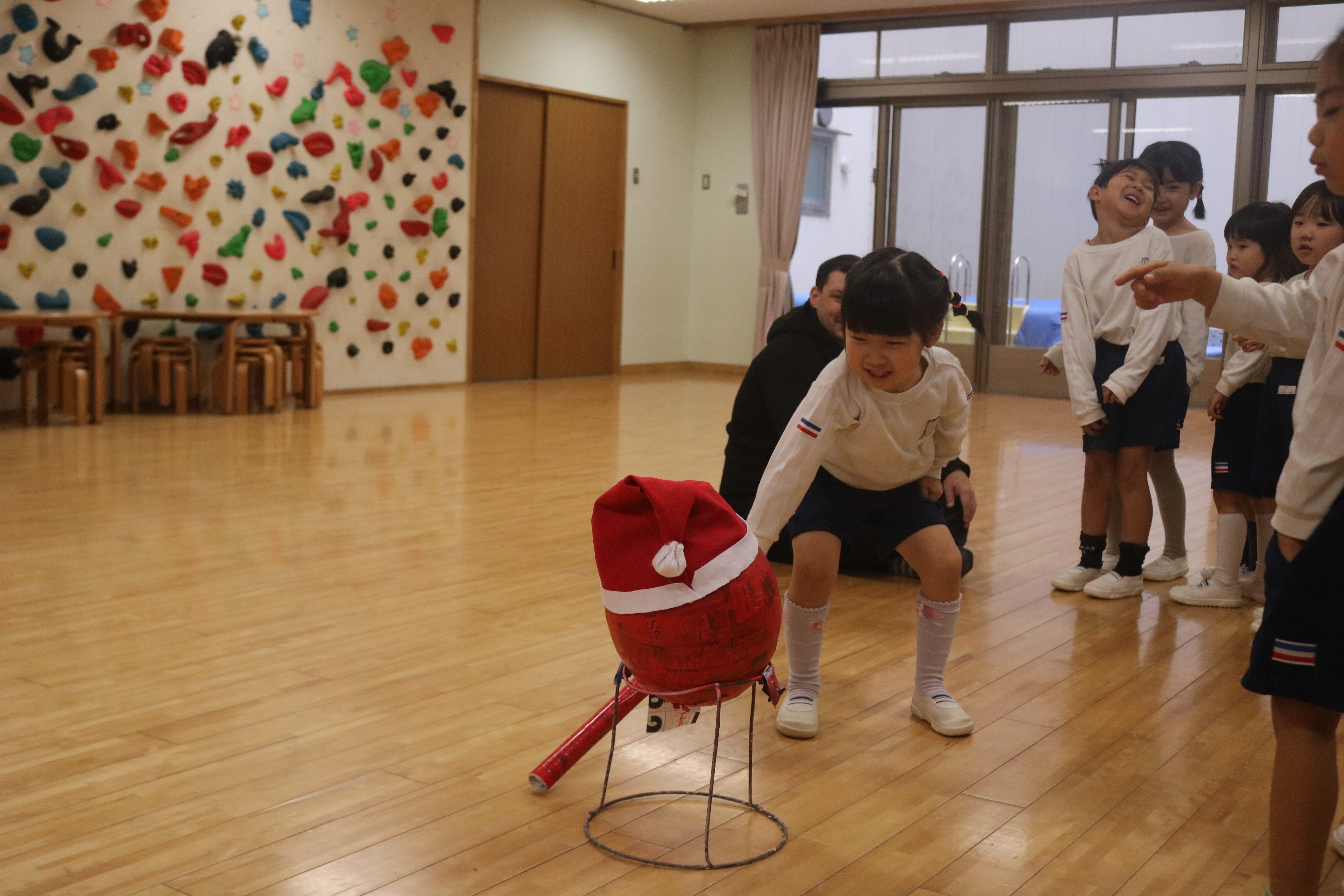 今回の英語であそぼう!はクリスマスパーティーとして、サンタやトナカイの張りぼてを棒でたたいてお菓子を出すゲームをしました。たくさんのお菓子が出てきて、子どもたちは大喜びでしたよ。