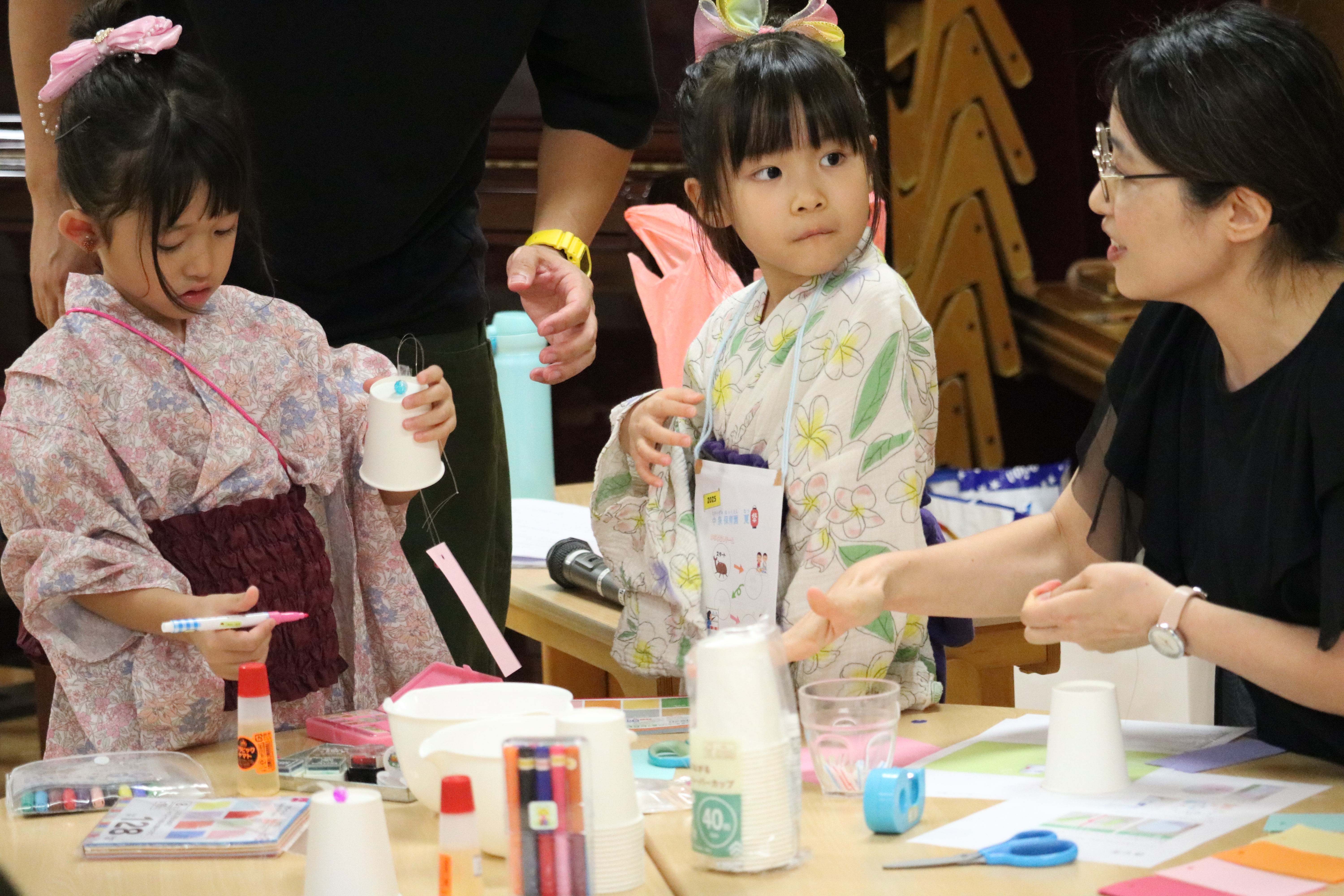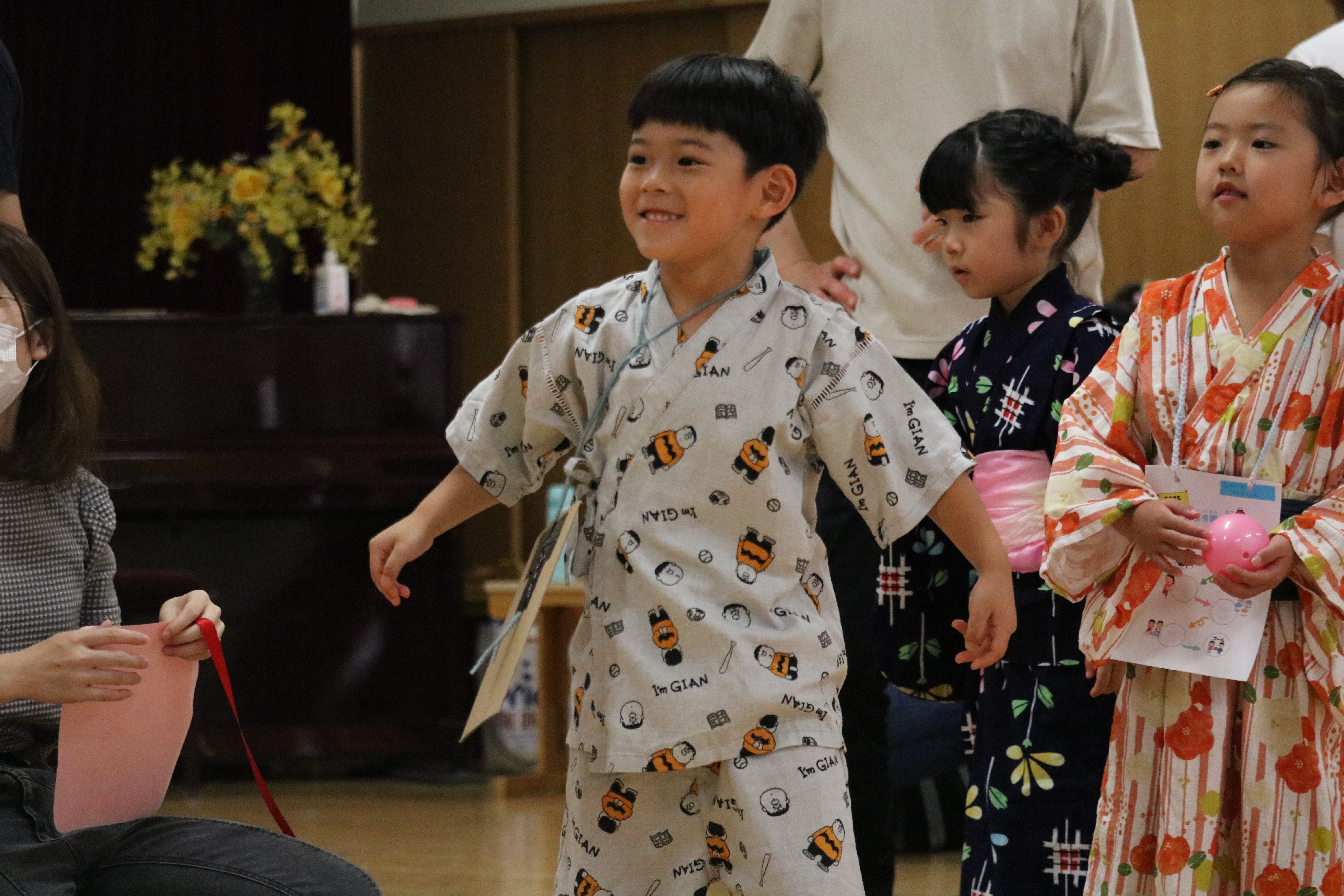 夕涼み会~あやめぐみ~ 今日はあやめ組さんの保護者会主催で「夕涼み会」が行われました。子どもたちは浴衣や甚平に身を包み、ホールは「夏祭り」会場となりました。ゲームをしたり、風鈴を作ったり、ビンゴをしたりと盛りだくさんの夏祭りでした。ゲームに勝って笑ったり・泣いたりと思い出深い日となりましたね。準備を進めてくださった保護者の皆様、協力してくださった保護者の皆様、ありがとうございました。