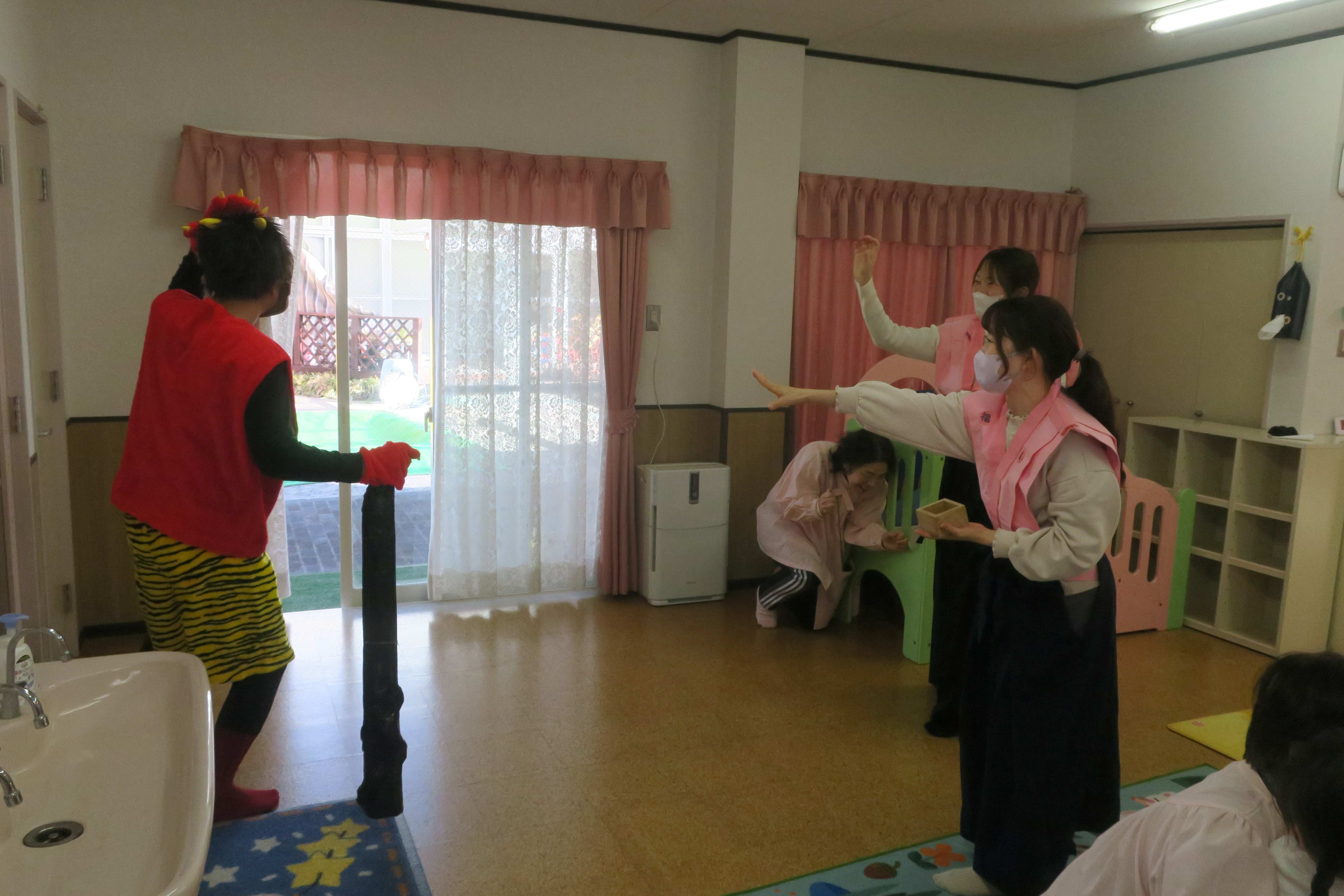 みんなで「おには~そと~!」と元気に言っています