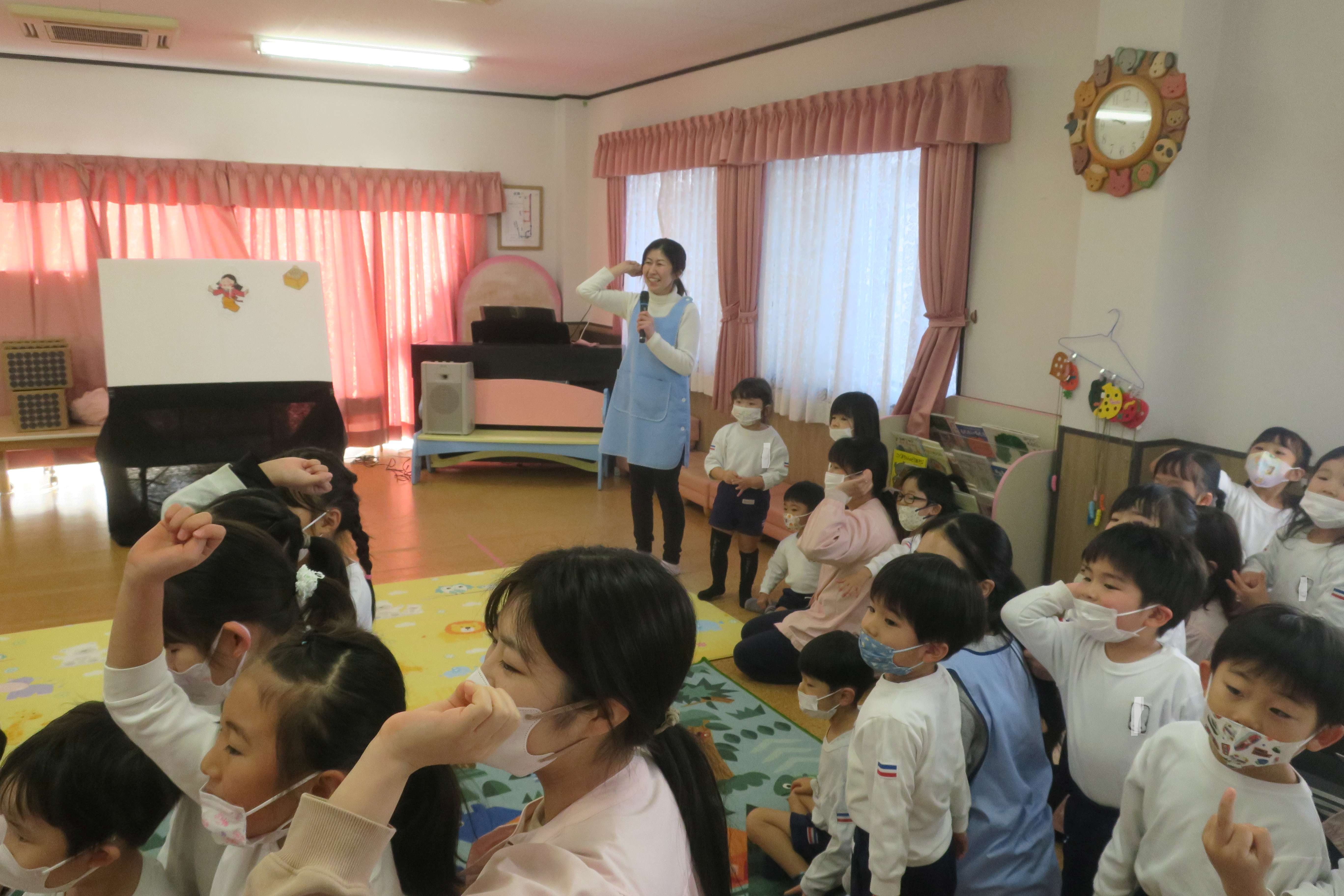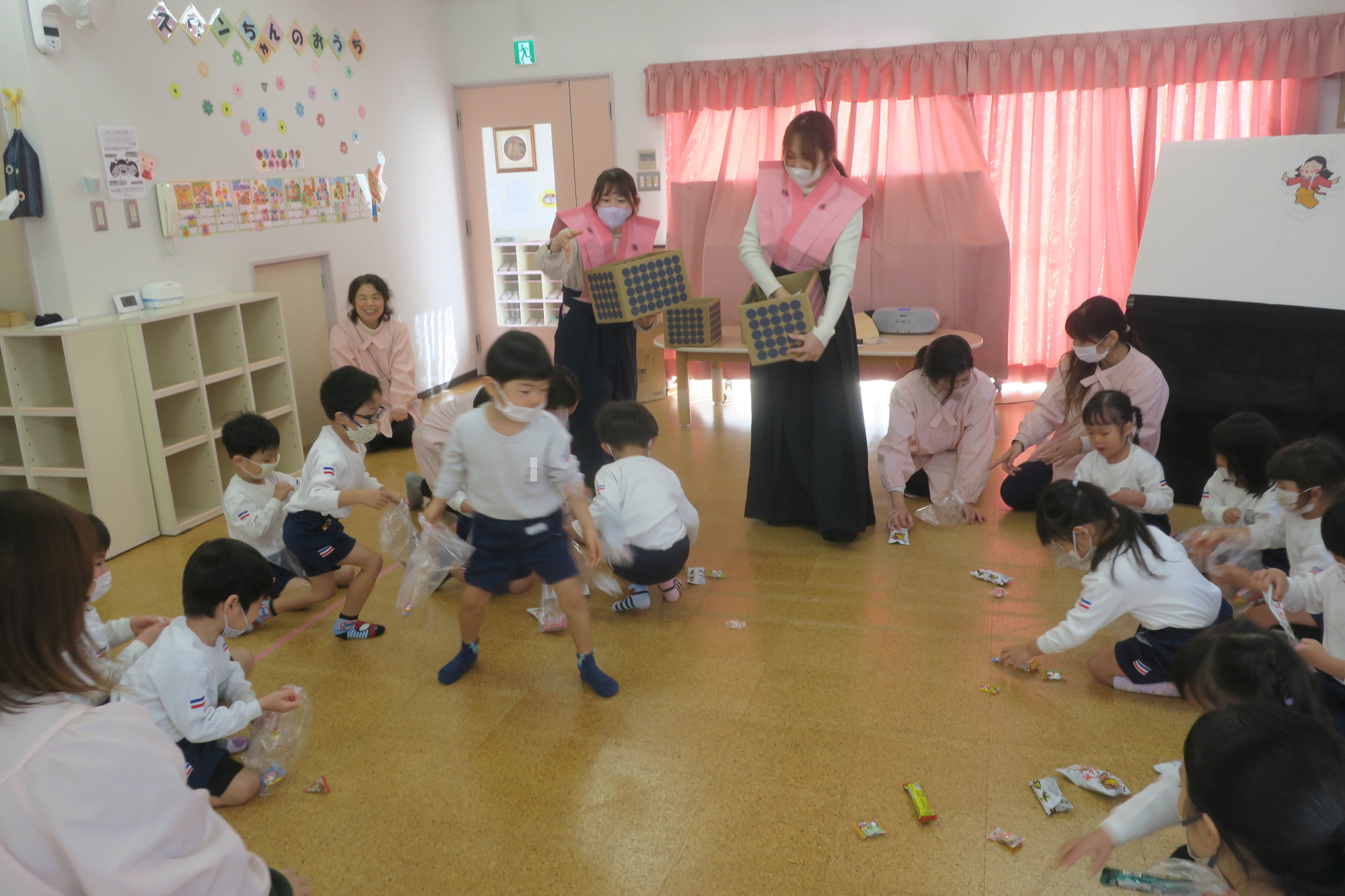 今日は節分会を行いました。パネルシアターで節分の由来のお話を聞いたり、お菓子拾いをしたりして楽しみましたよ!鬼が登場するとちょっぴり怖がった子どもたちも福の神さんと一緒に元気に「おには~そと~ふくは~うち」と言いながら豆を投げるまねをして、鬼を追い出しましたよ!お腹の中にいる鬼も、きっと出て行ったことでしょう!その後は、福の神さんが撒いてくれたお菓子を夢中で拾い、袋いっぱいに詰めてニコニコの子どもたちでした!