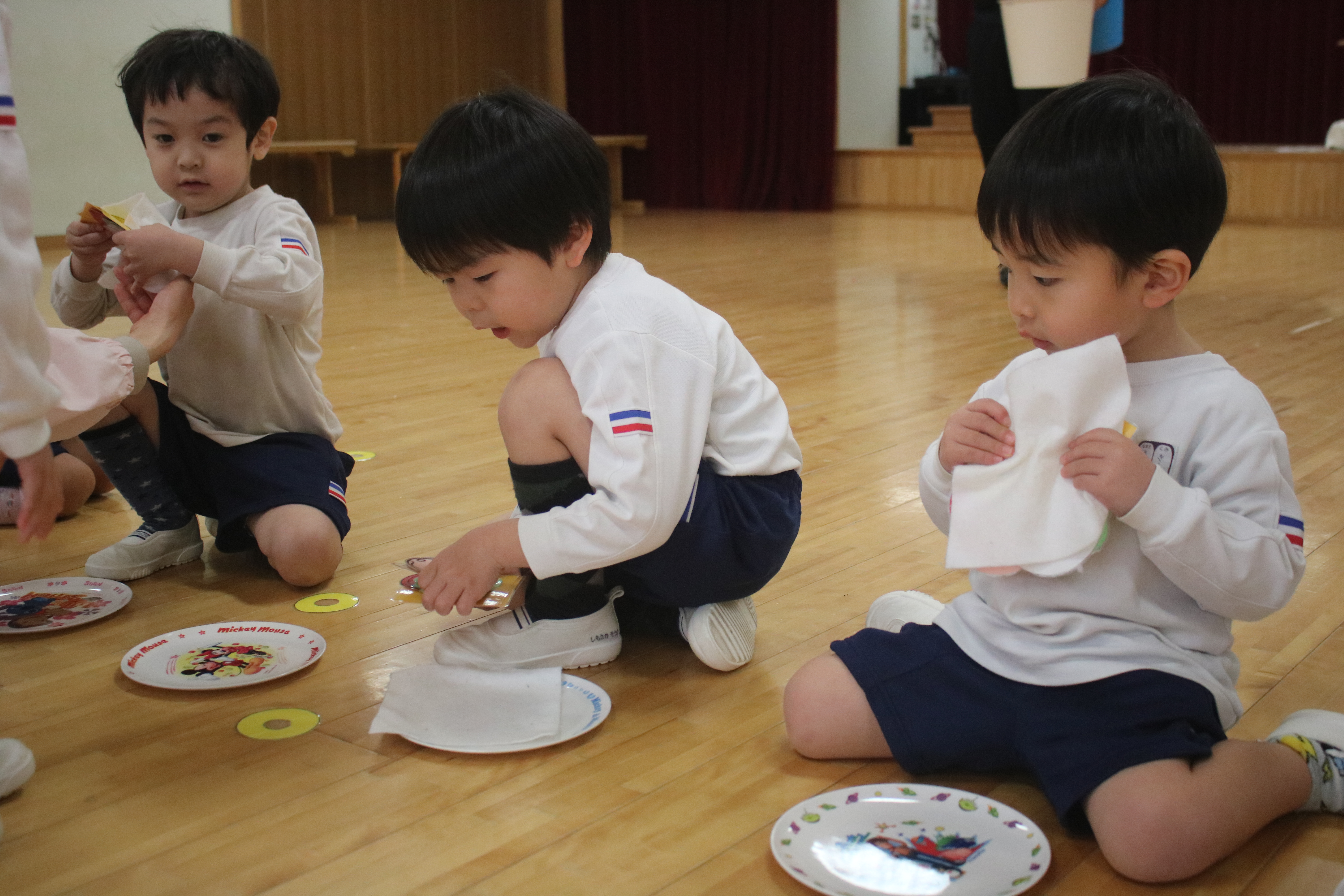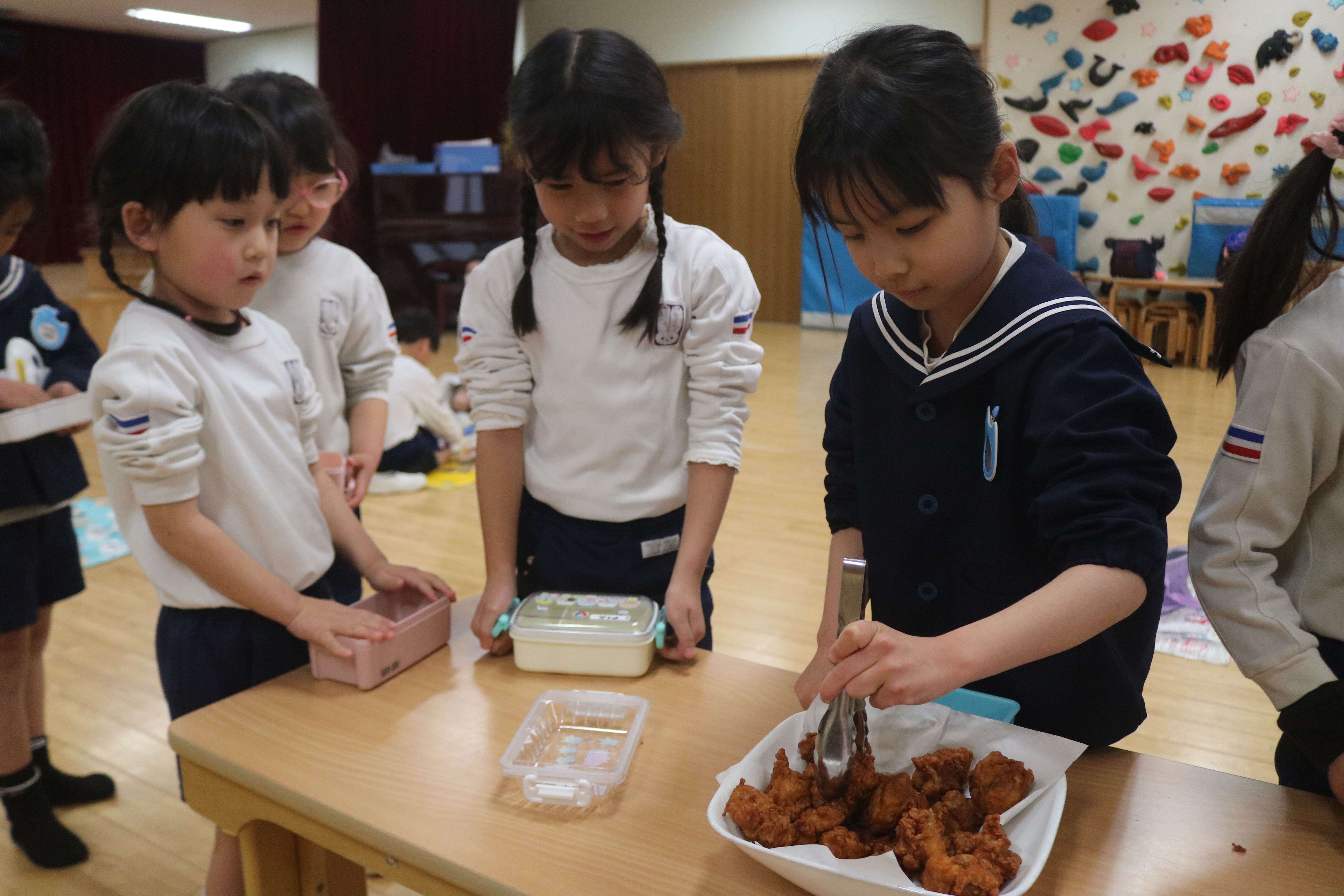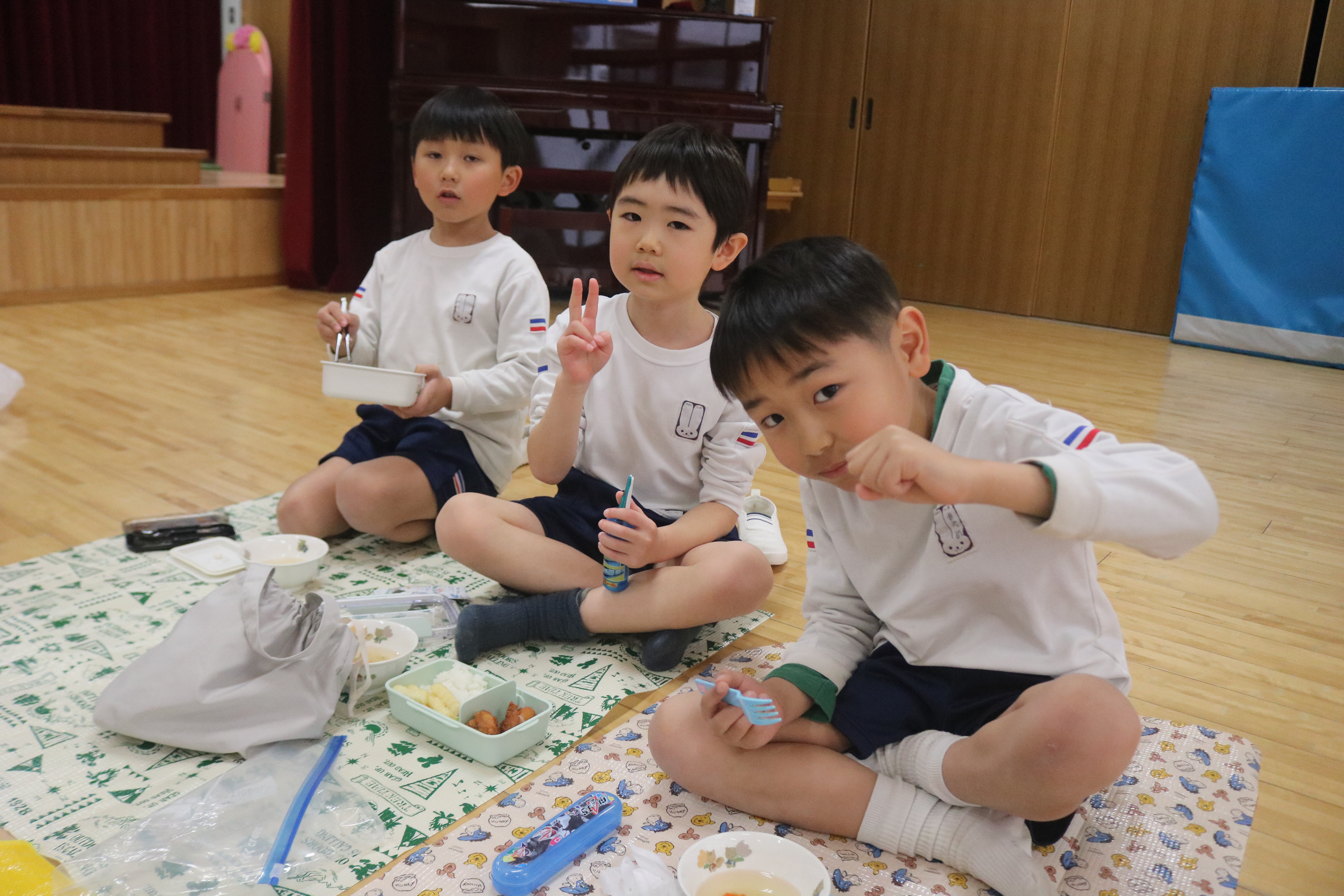 今日は園外保育で今之浦公園へ行く予定でしたが、あいにくの雨で残念ながら中止となりました。そこで遊戯室でピクニックごっこを楽しむことにしました。自分のお弁当箱に給食を詰めて、シートの上で食べると「ピクニックみたい!」と嬉しそうな子どもたち。いつもとは少し違う雰囲気の中で、楽しい時間を過ごしました。