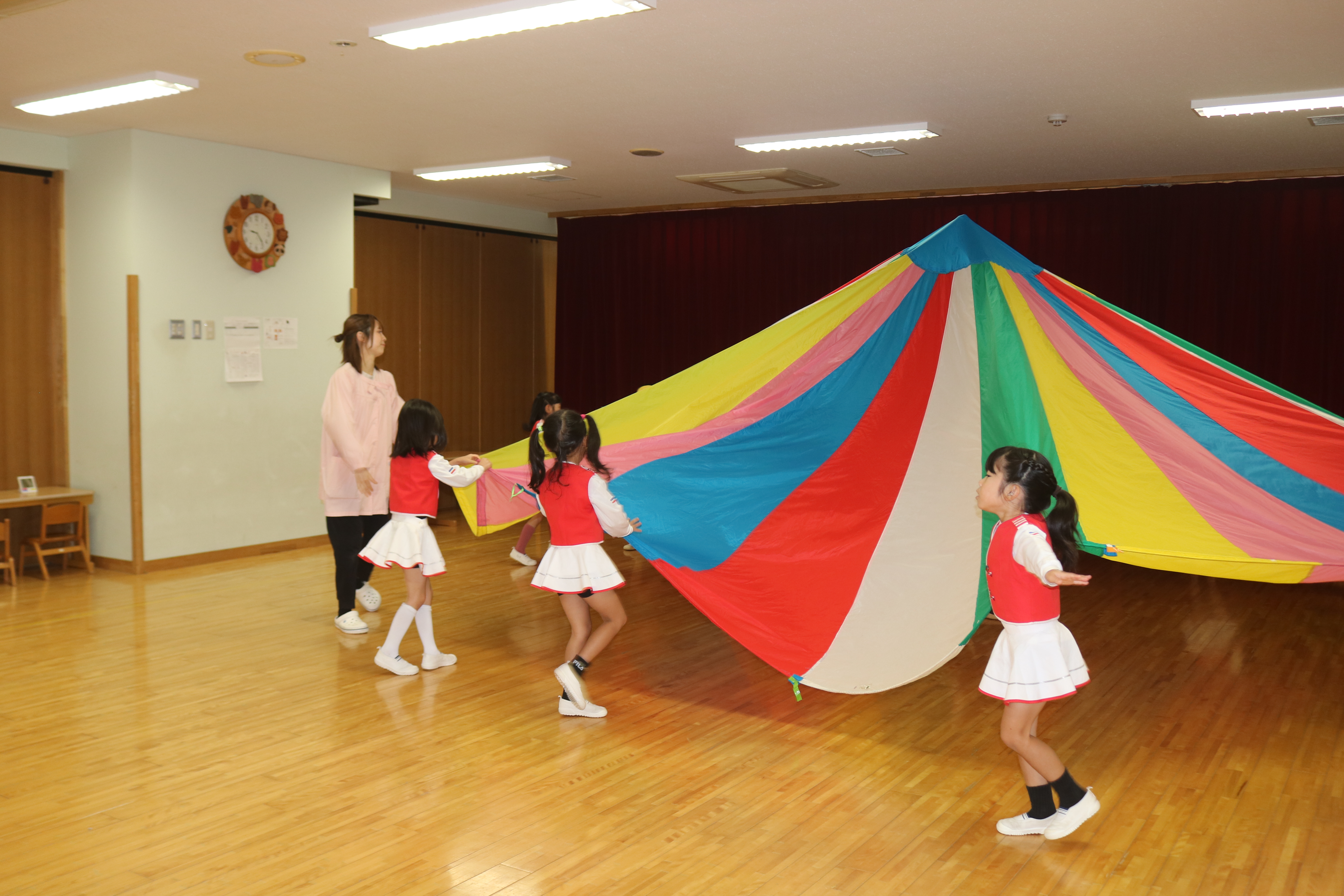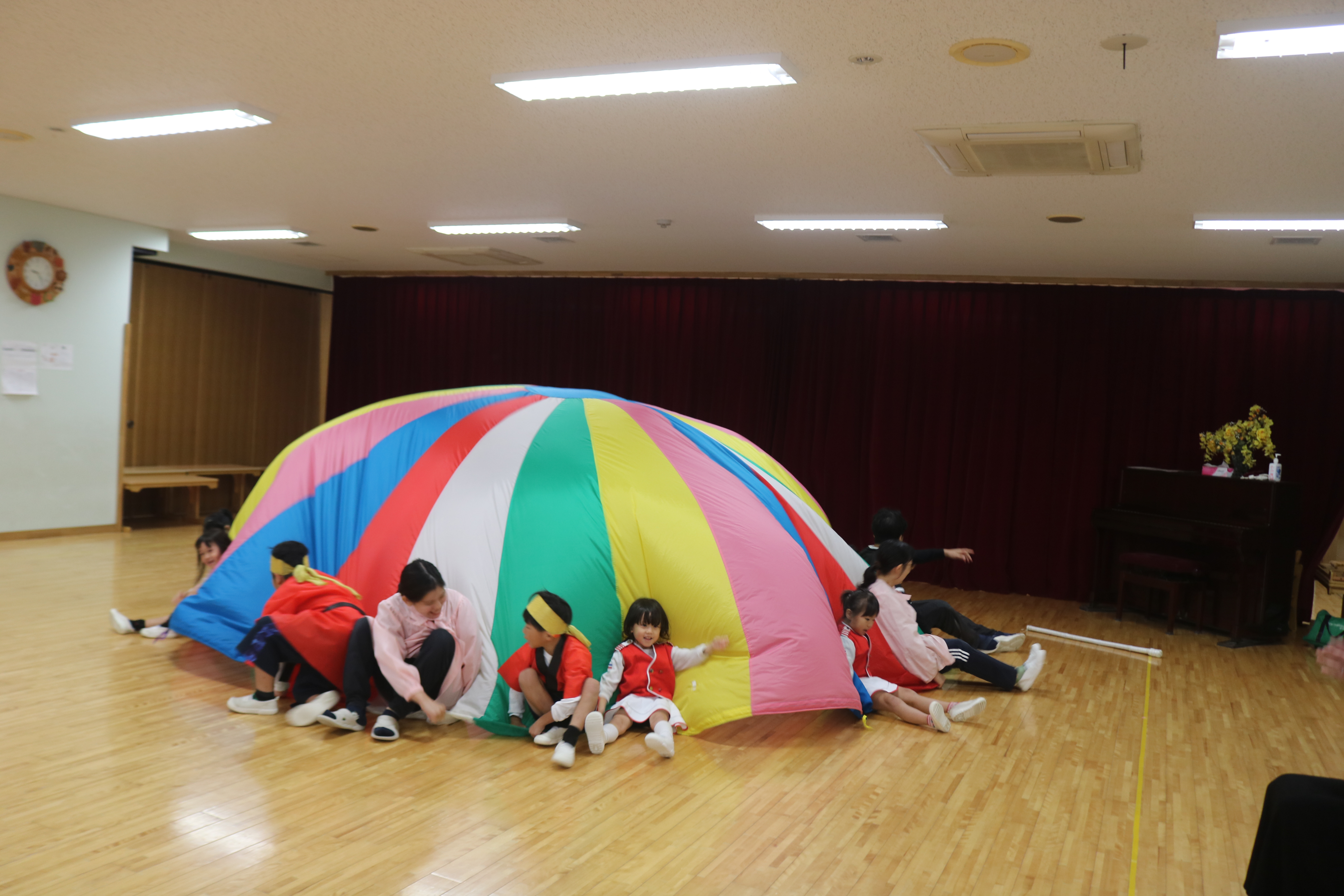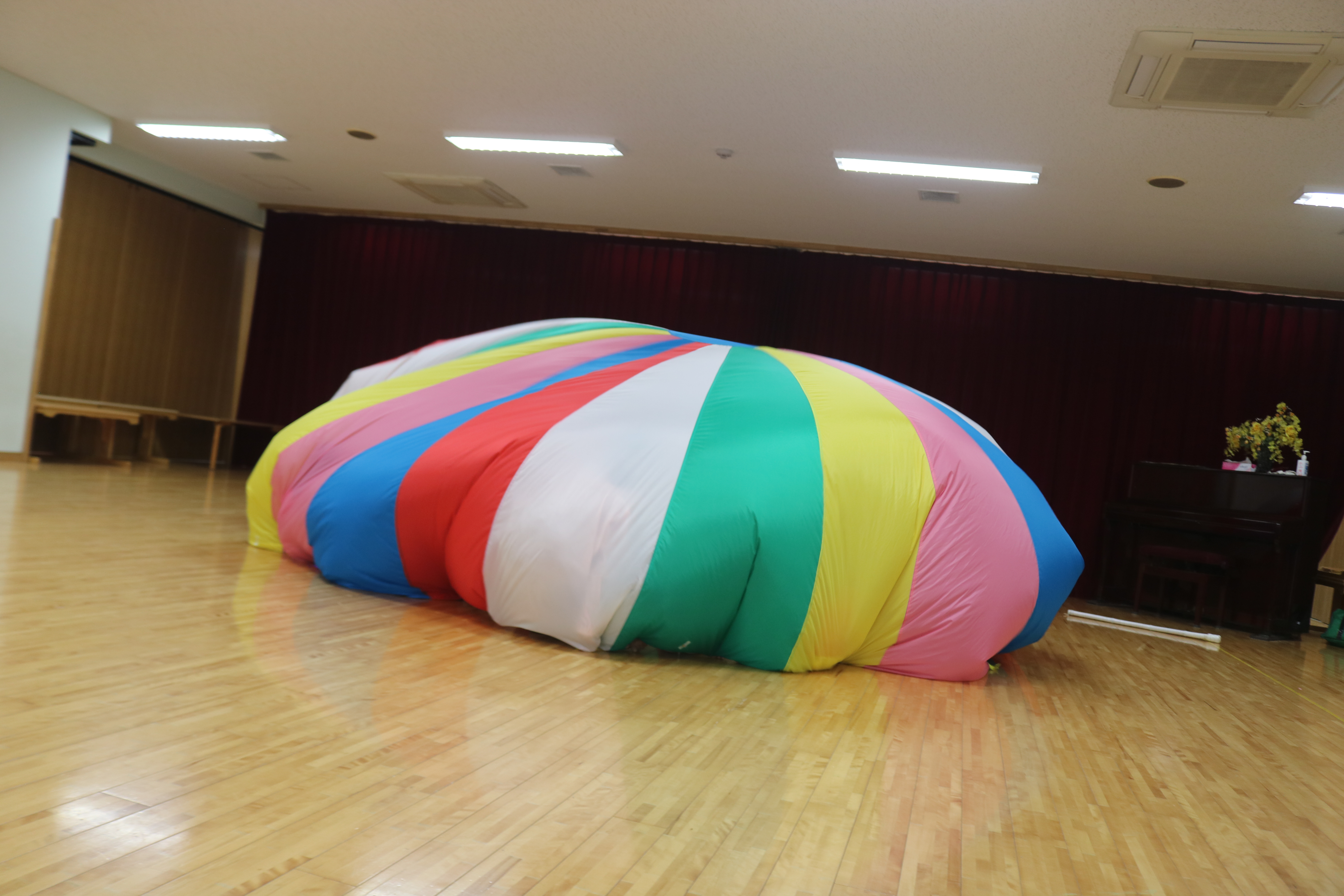 あやめ組のパラバルーンをすみれぐみのお友達が見に来てくれました。小さなお客さまは「くるくる回ってる!」「きれい」と驚きながら見てくれていました。あやめ組さん!今度は違うクラスのお友達にも見せてね!
