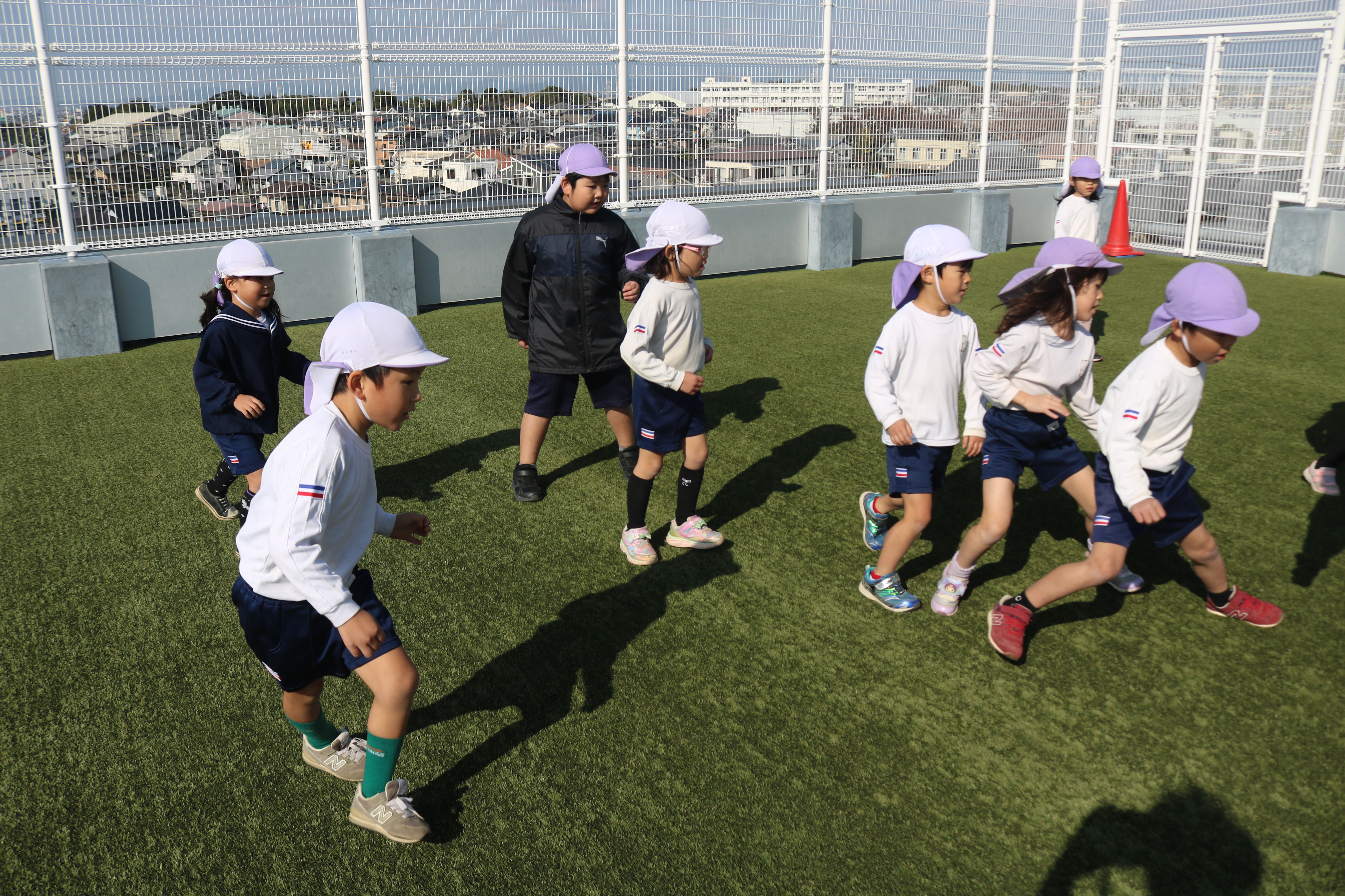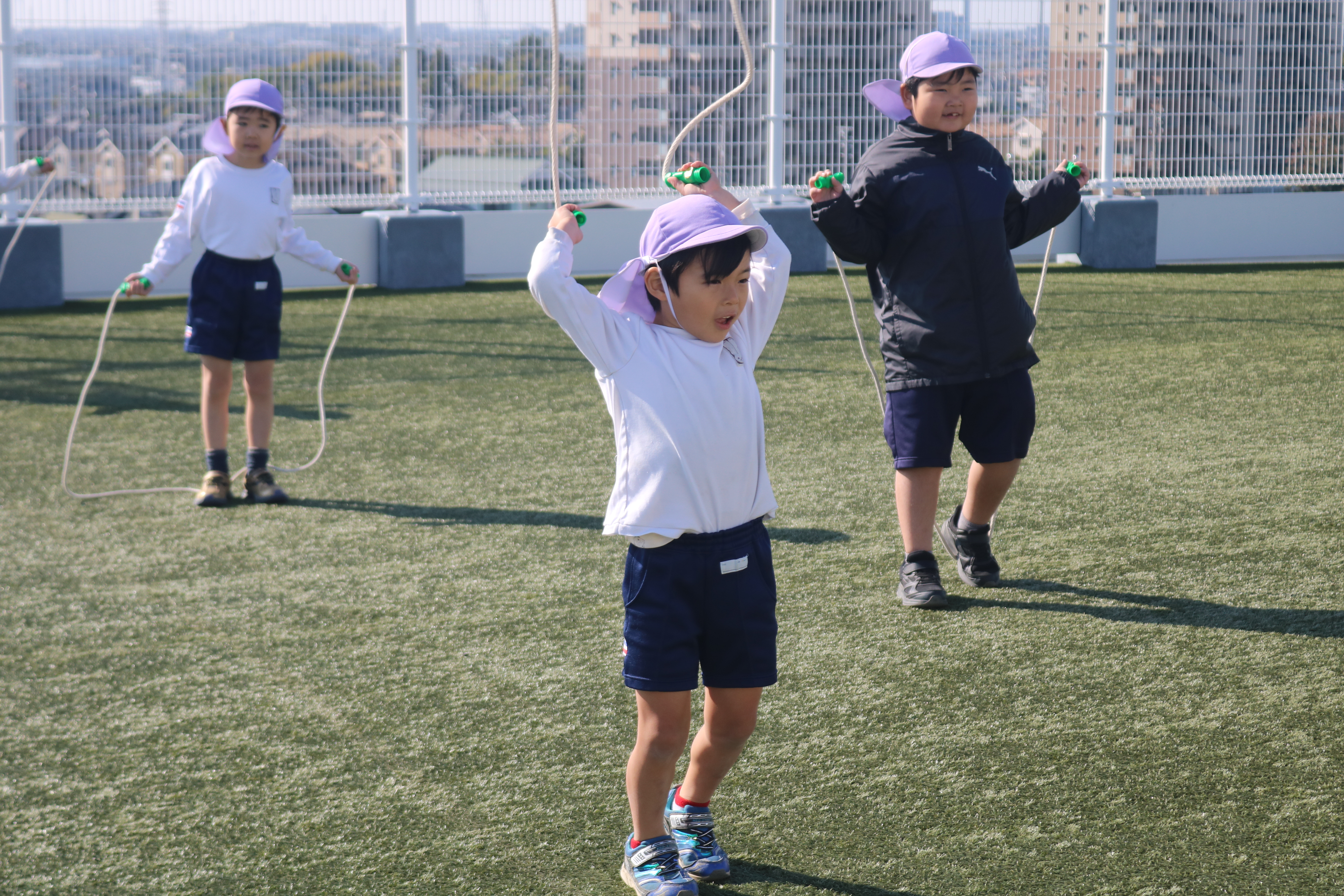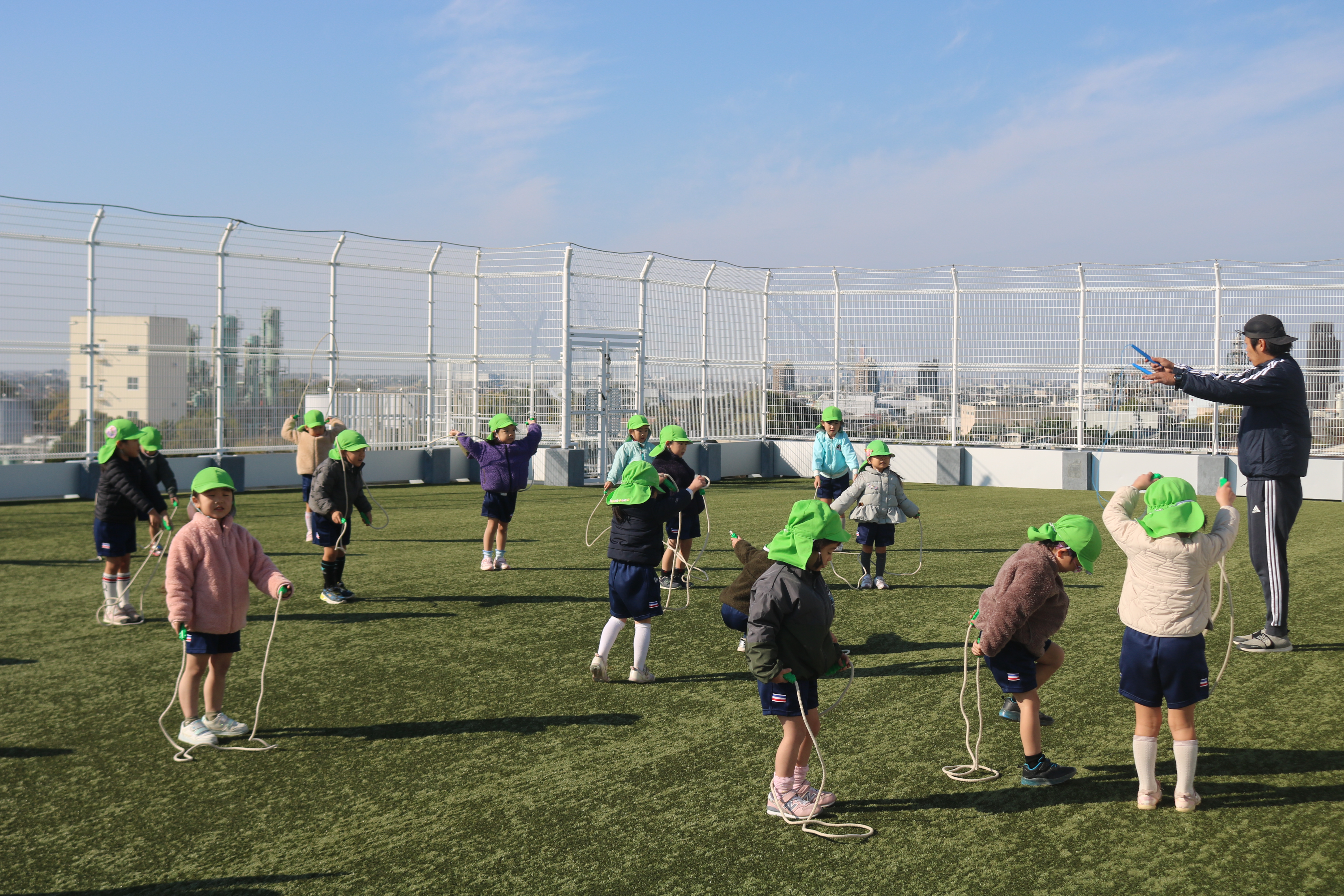 本日、5階屋上芝生広場にてきのいい羊達を行いました。強い風の中でも、子どもたちは縄跳びや運動に一生懸命取り組んでいました。