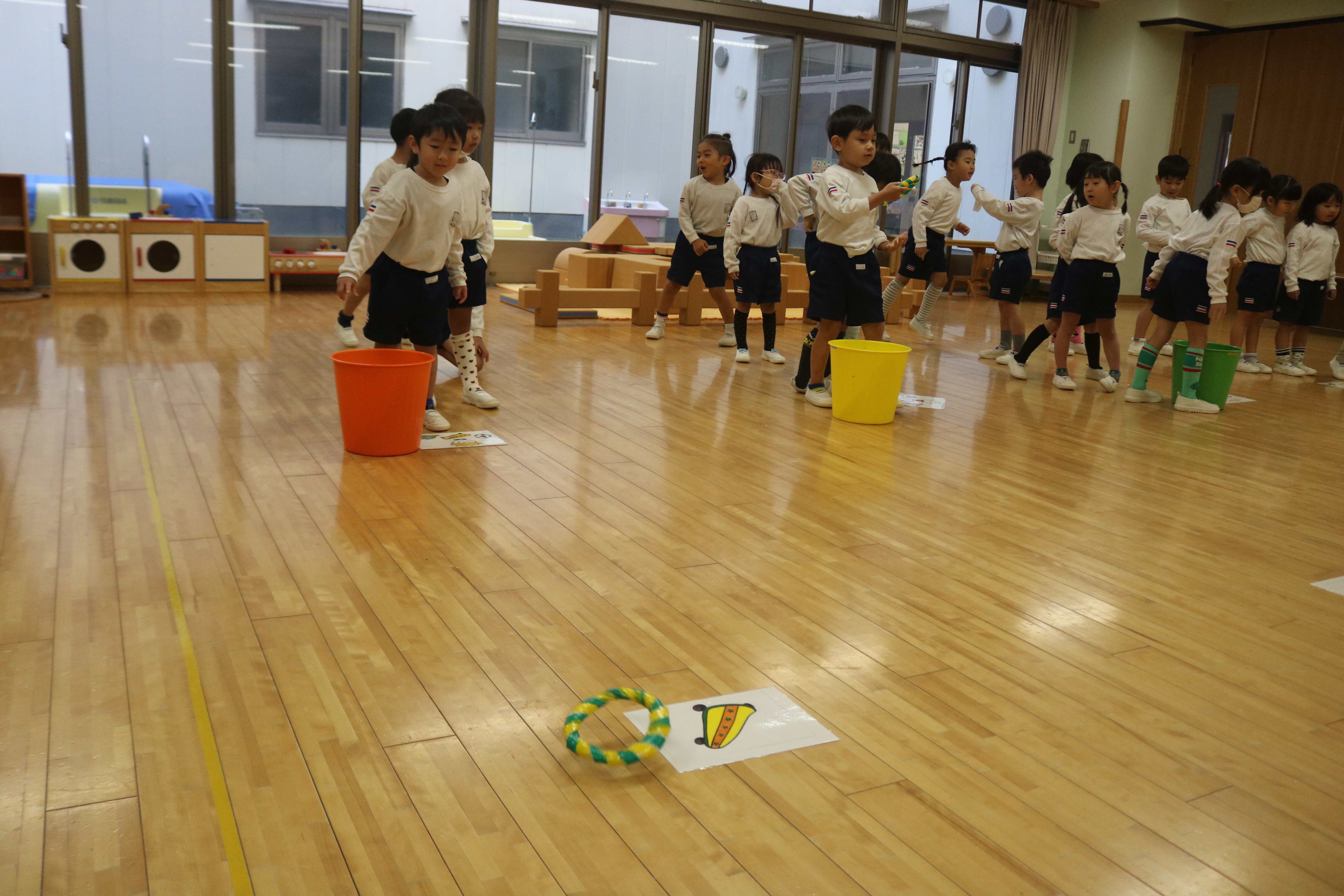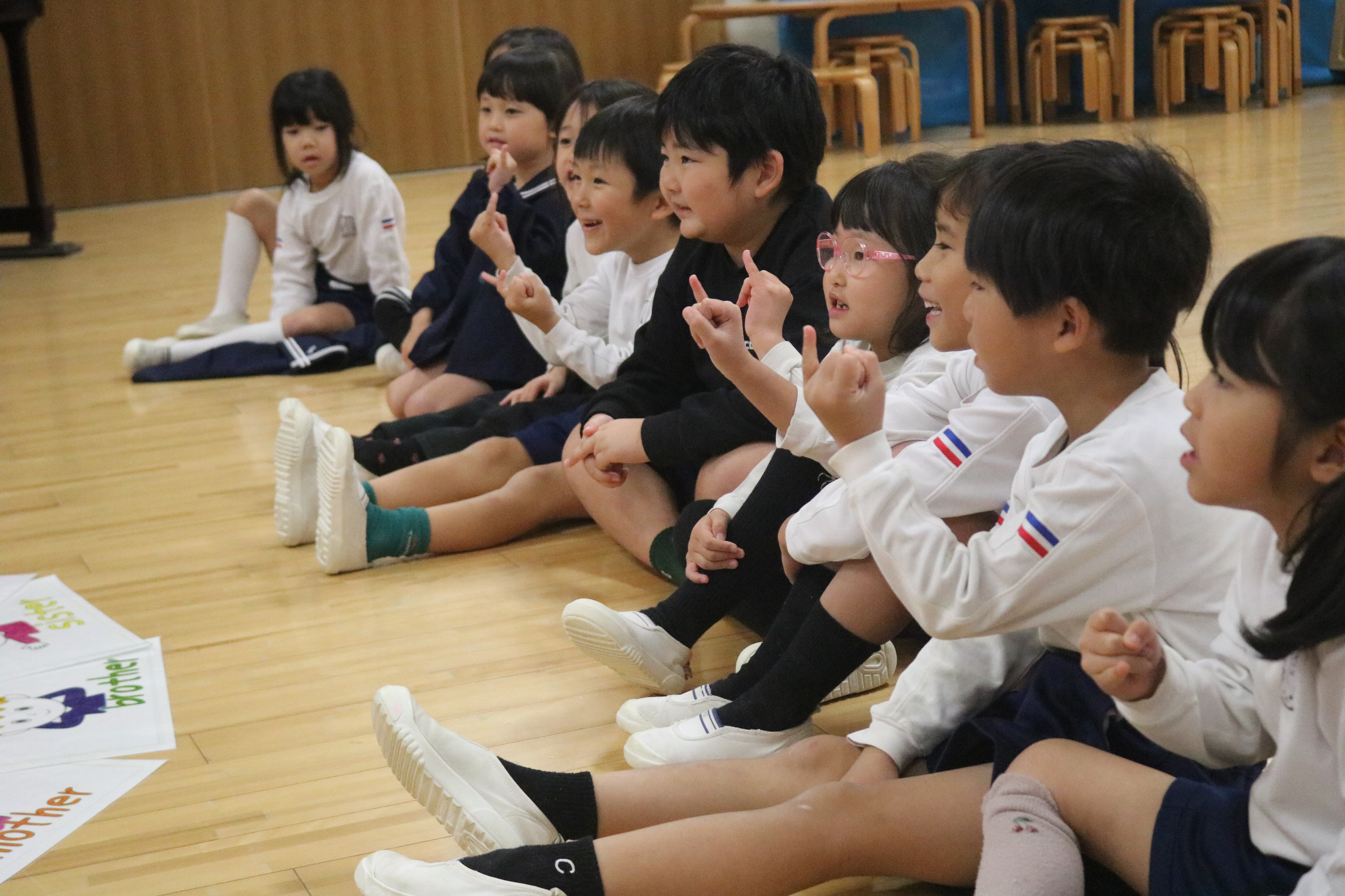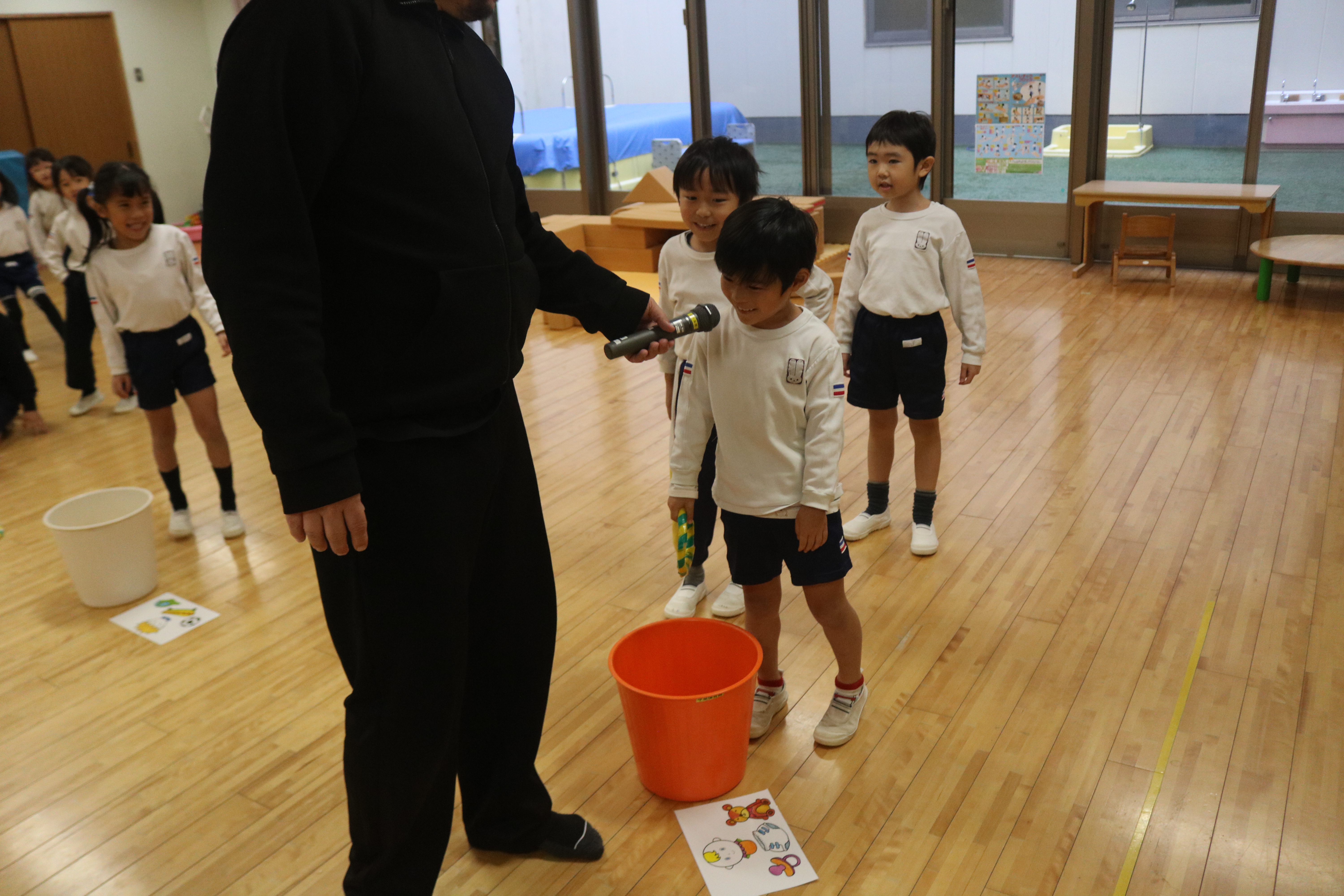 英語であそぼうがありました ゆり組 ゆり組 ゆり組 あやめ組 あやめ組 あやめ組 イグラム先生による英語であそぼう!がありました。「家族」のテーマに沿って家族の呼び方を歌に合わせて覚えたり、Father、Mother、Sister、Brotherのそれぞれのチームに分かれてそれぞれのアイテムを輪投げでゲットするゲームも行いました。楽しみながら英語に触れていきましたよ。