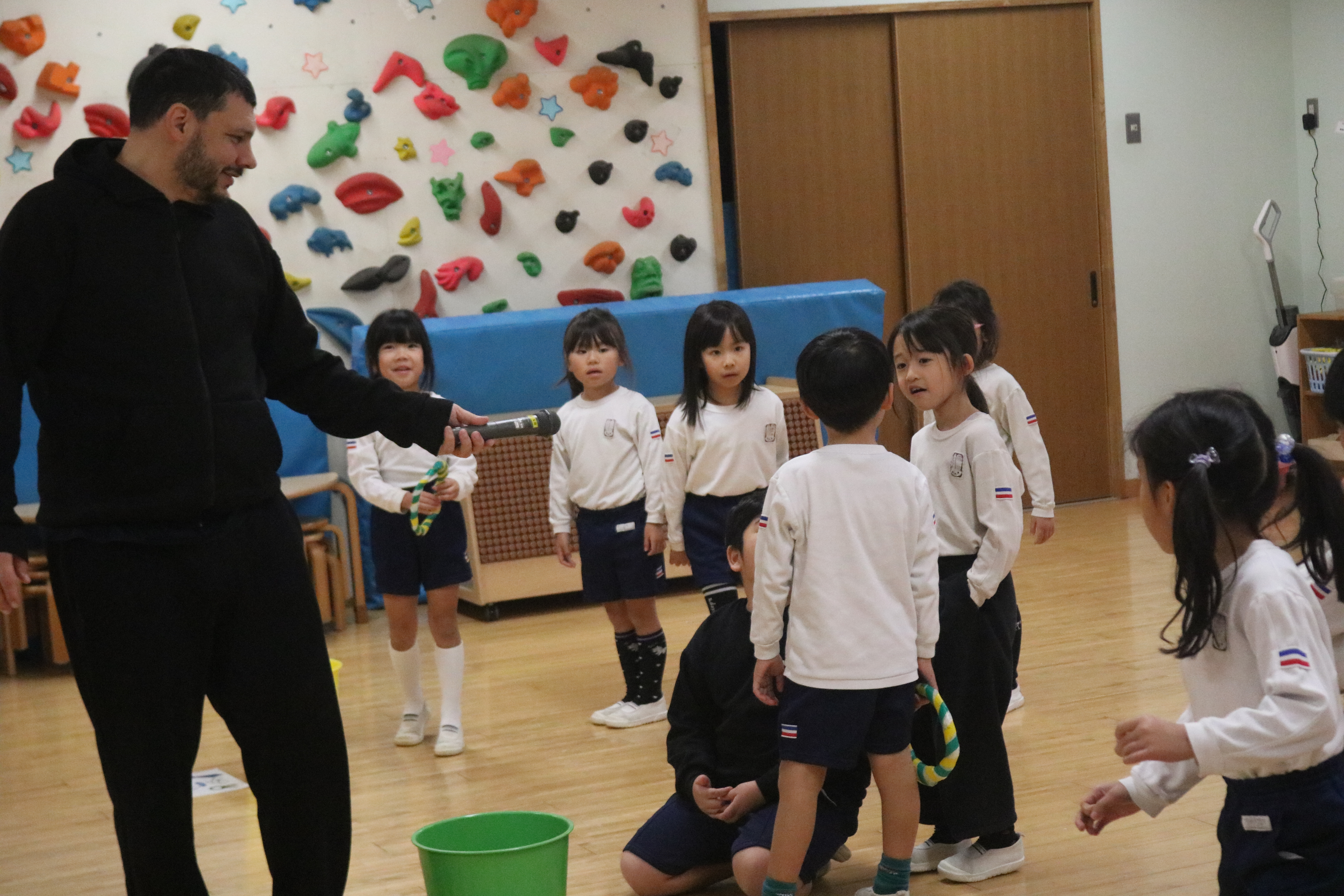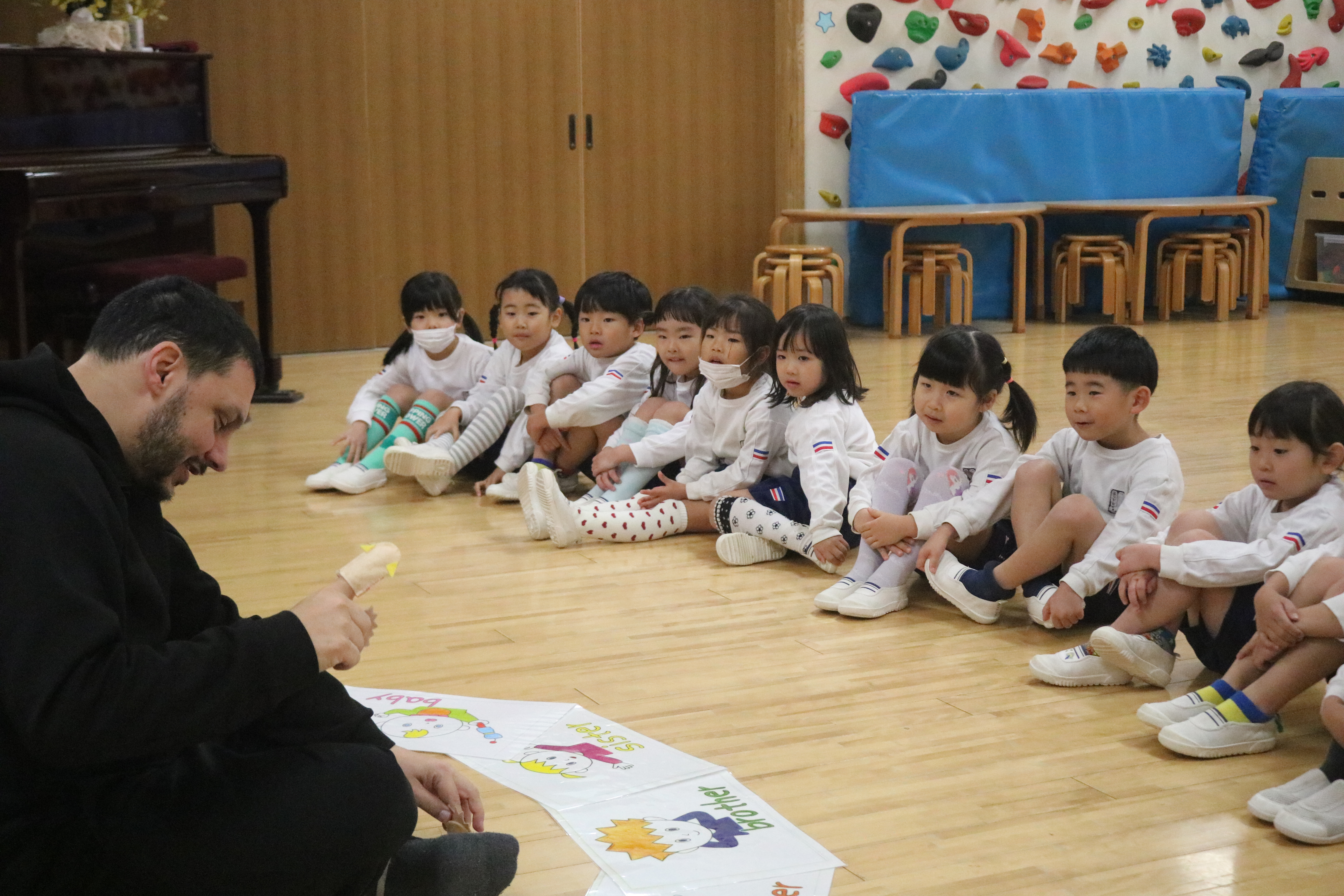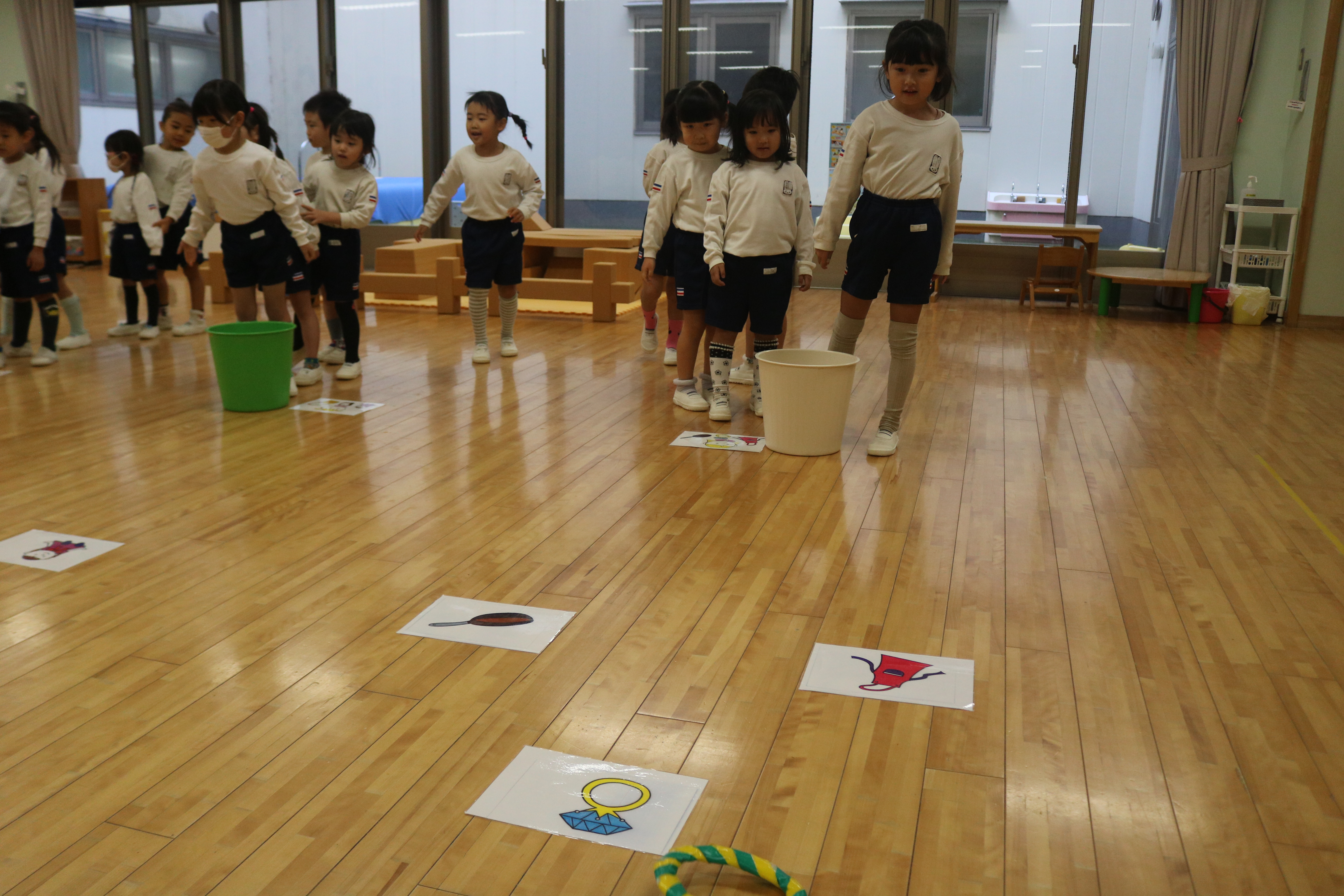 英語であそぼうがありました ゆり組 ゆり組 ゆり組 あやめ組 あやめ組 あやめ組 イグラム先生による英語であそぼう!がありました。「家族」のテーマに沿って家族の呼び方を歌に合わせて覚えたり、Father、Mother、Sister、Brotherのそれぞれのチームに分かれてそれぞれのアイテムを輪投げでゲットするゲームも行いました。楽しみながら英語に触れていきましたよ。