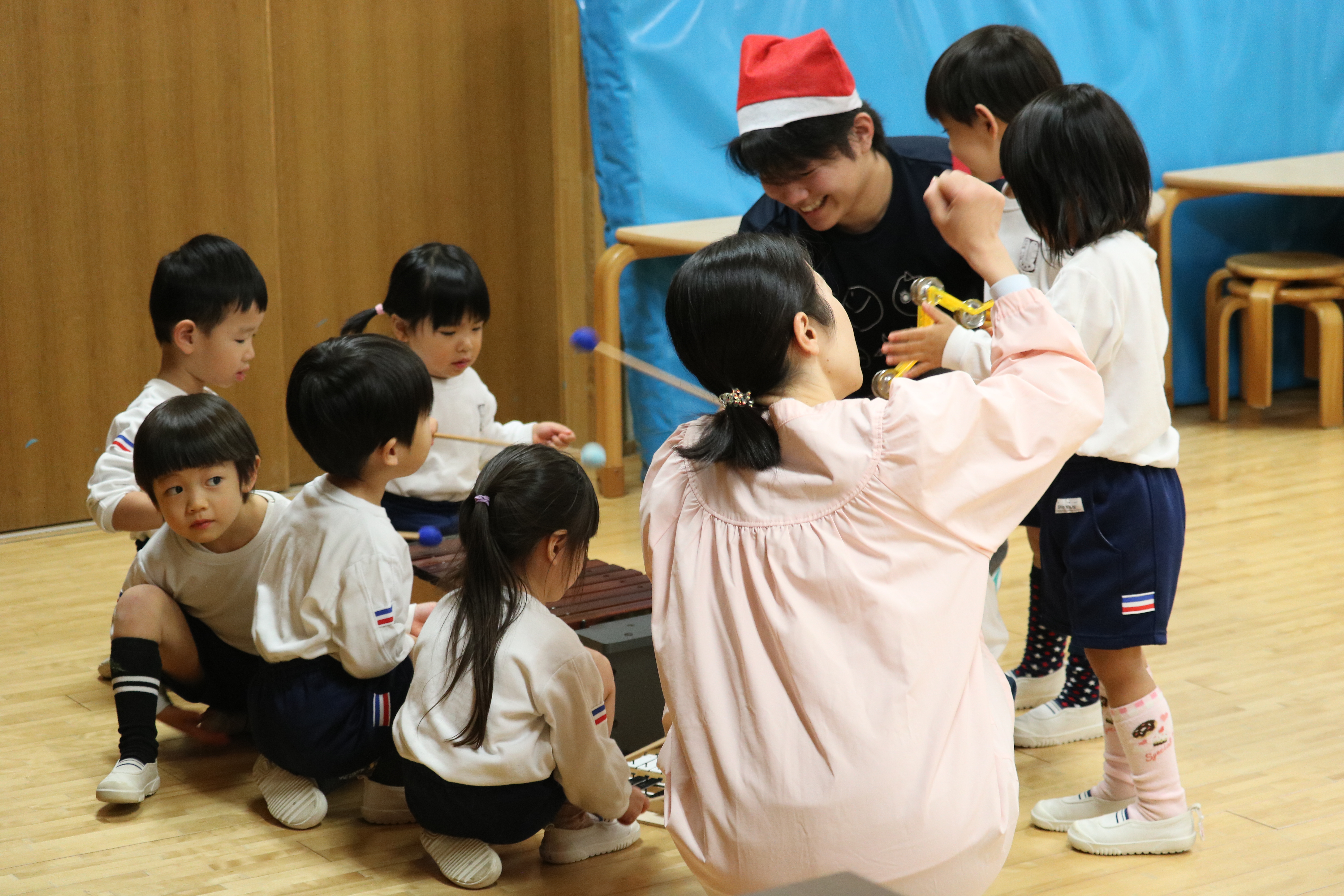 本日、【さんだいおんがくとどけ隊】として、静岡産業大学のお兄さん・お姉さんが来園し、きく組・ゆり組・あやめ組の子どもたちに素敵な演奏と、さまざまな楽器体験を届けてくださいました。