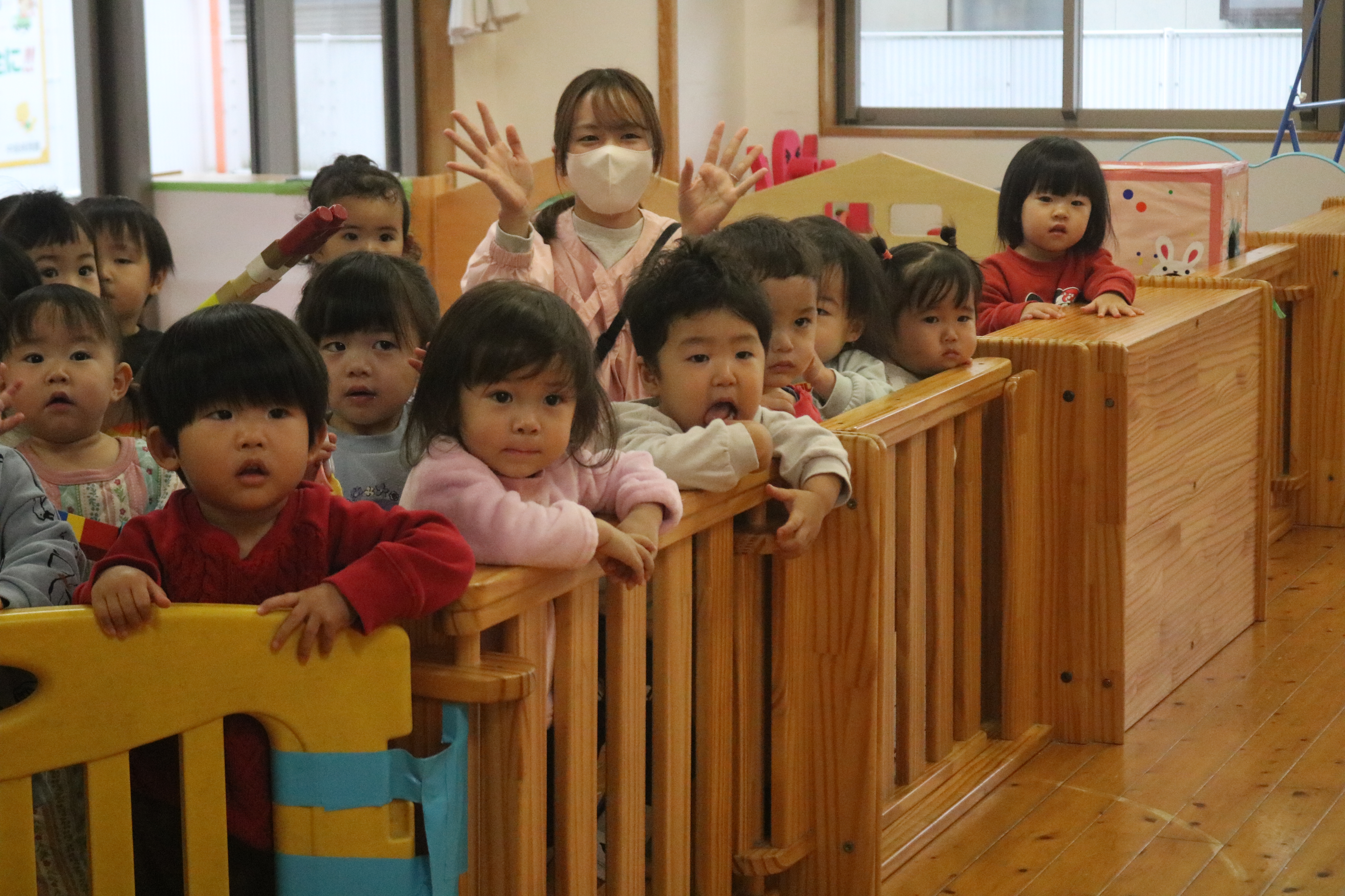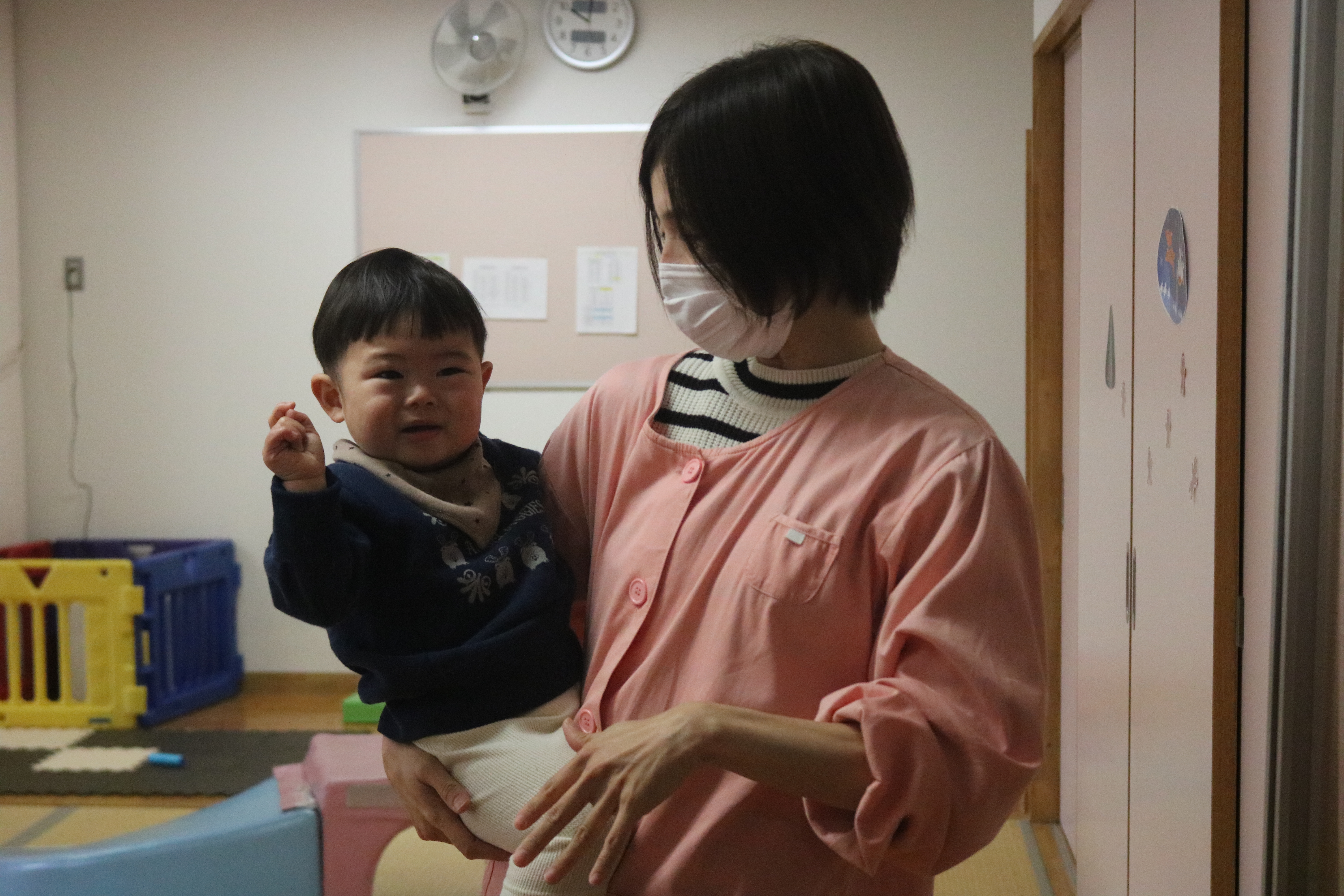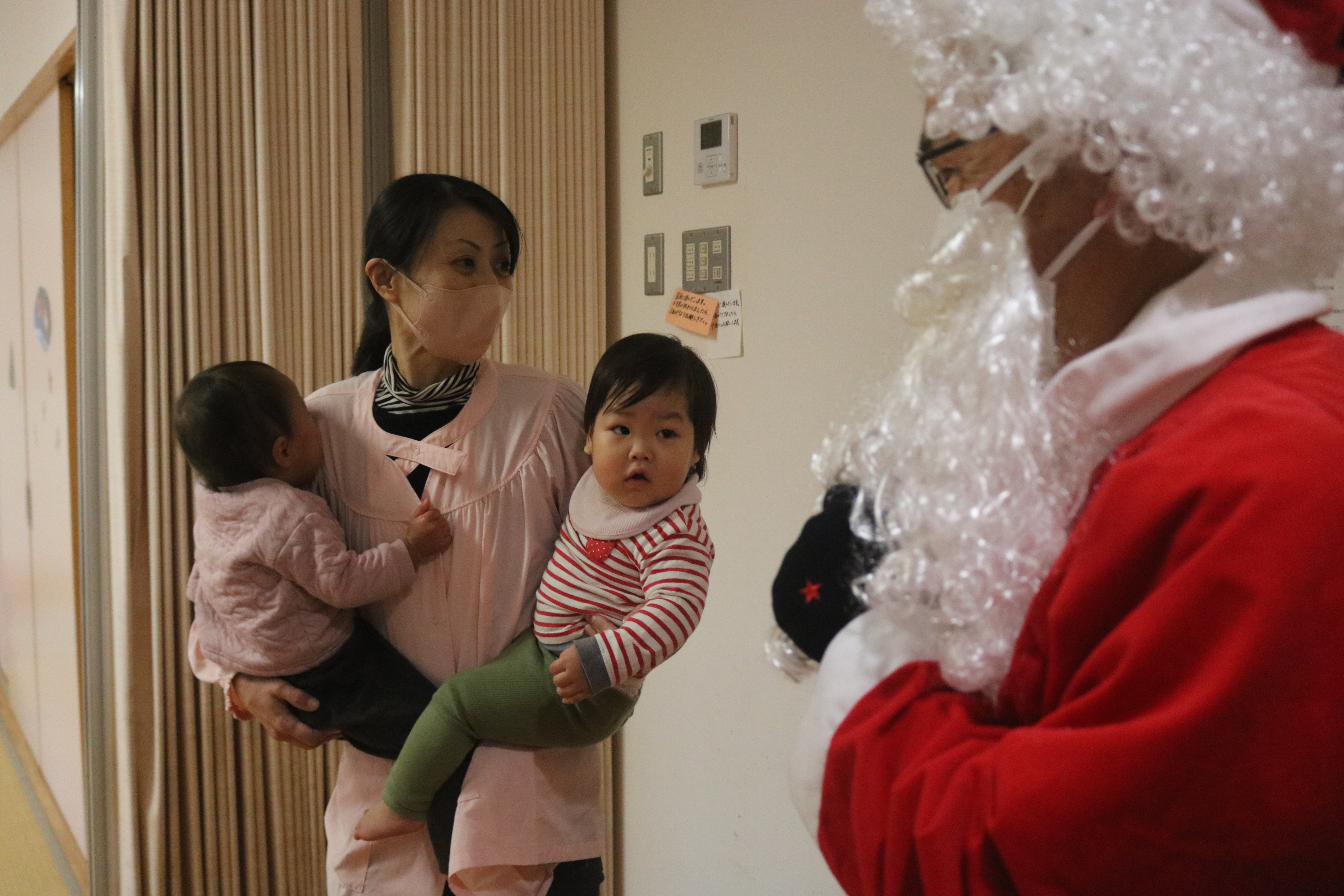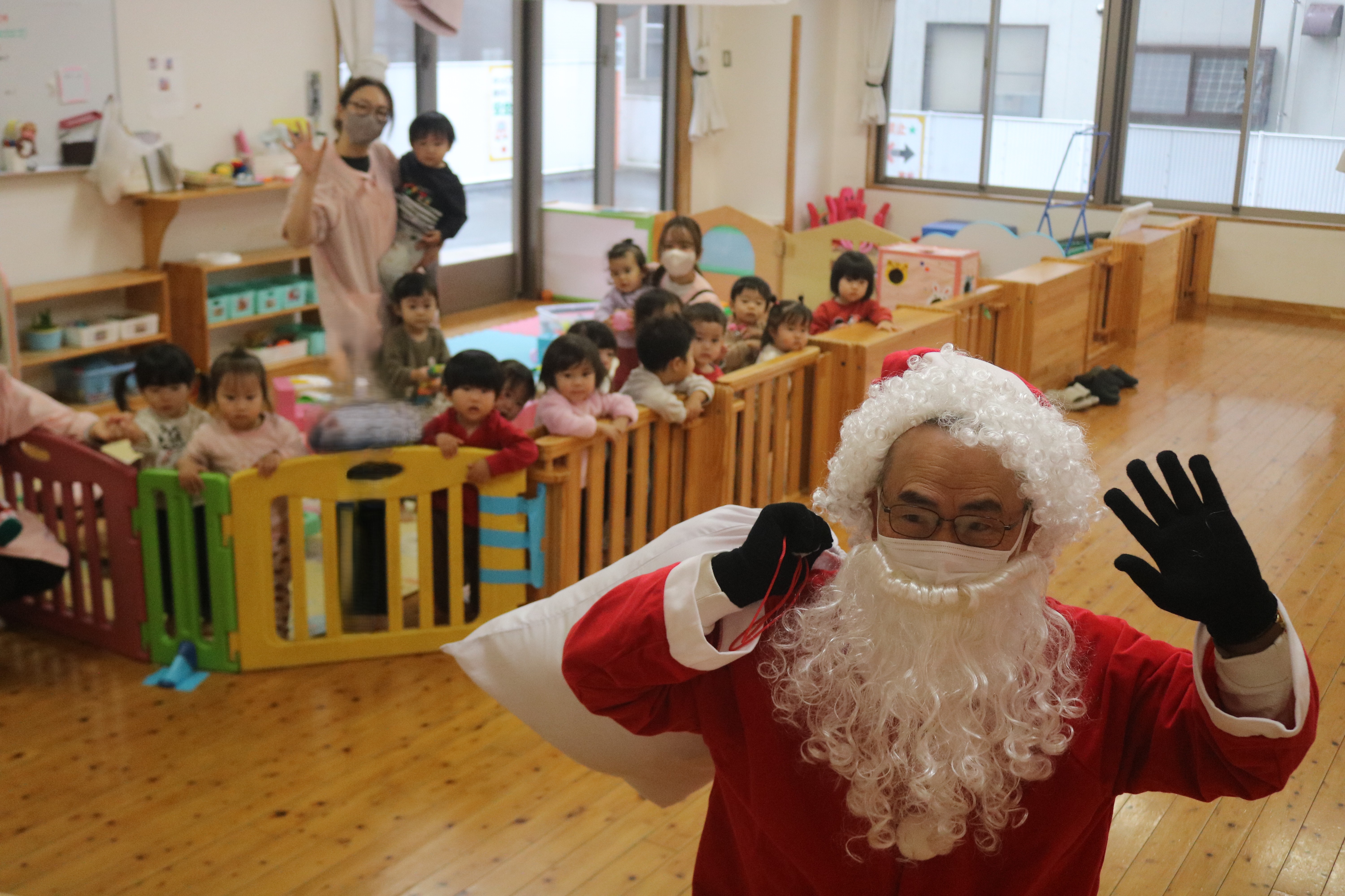もも組は突然のサンタさんにびっくりして涙が出てしまう姿もありましたが、プレゼントをもらうと泣き止み、じっとサンタさんの顔を見つめていました。