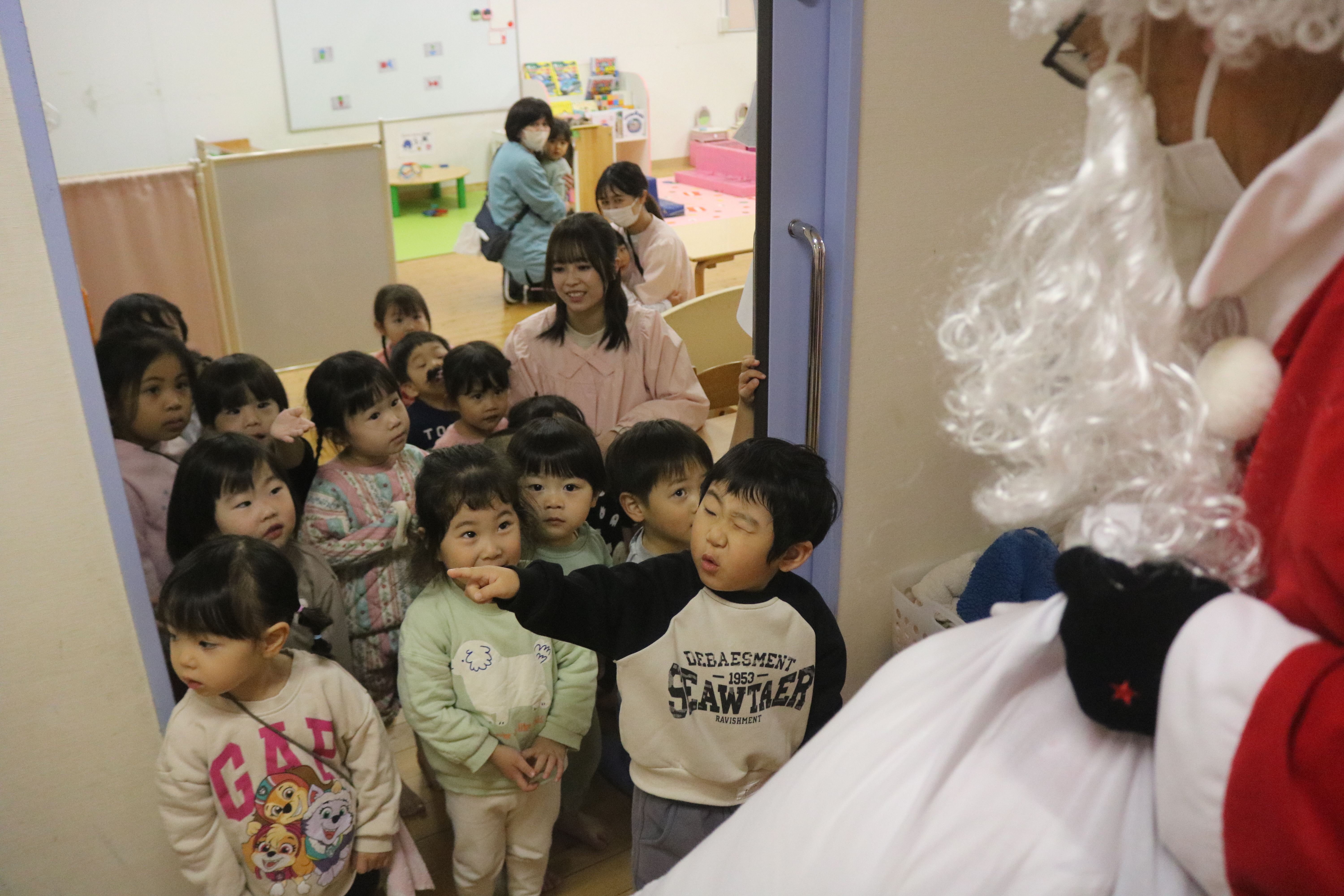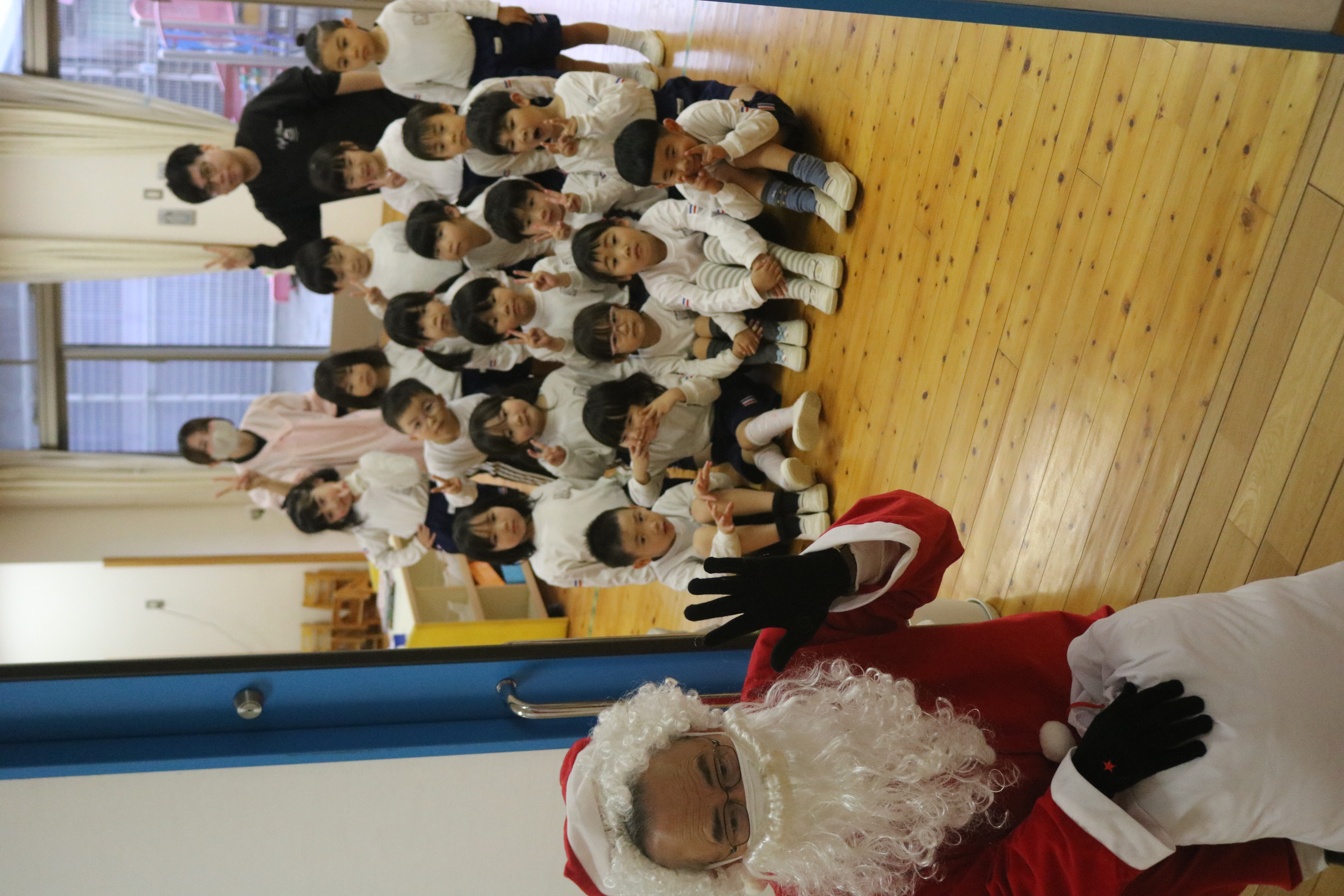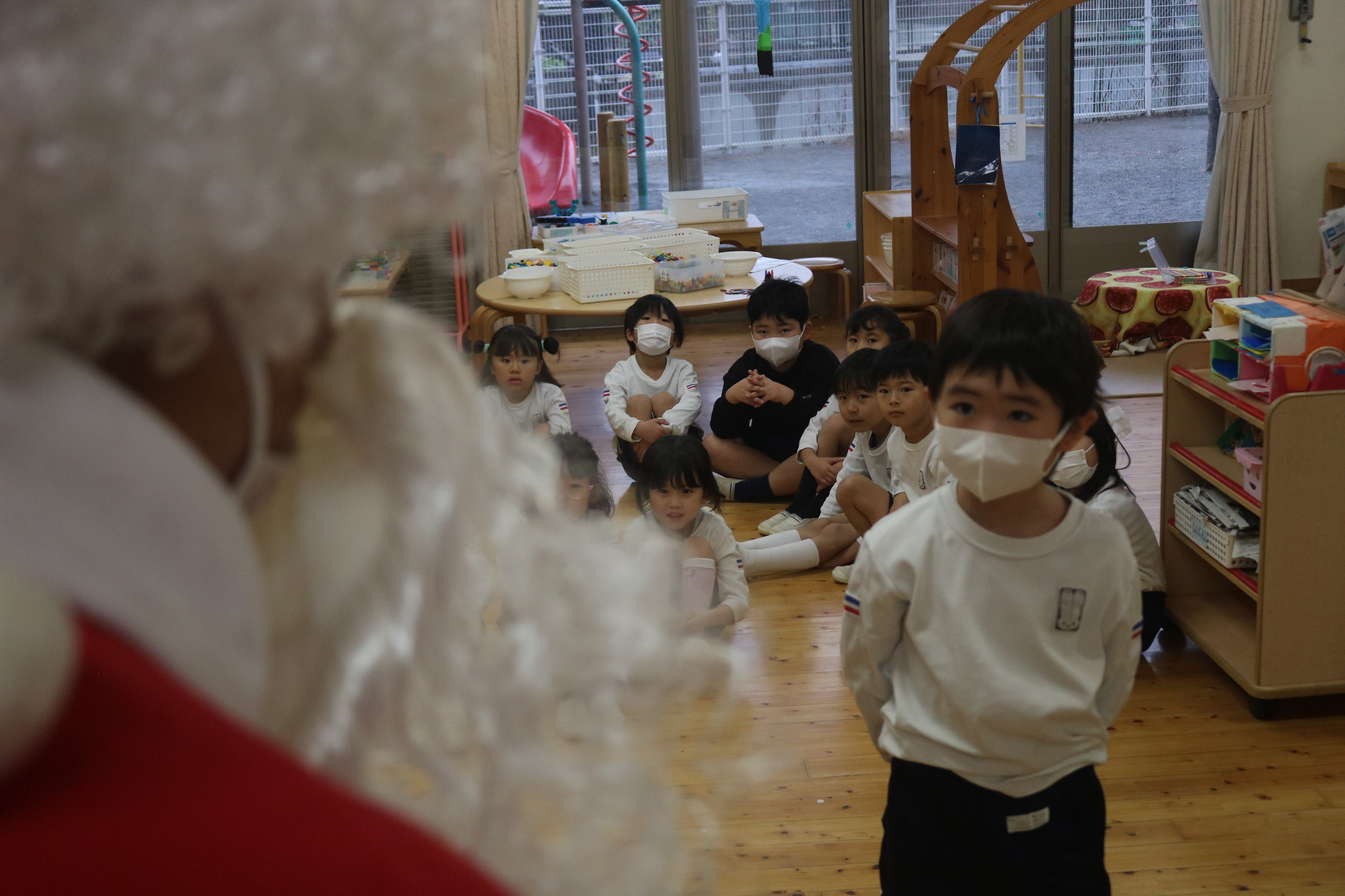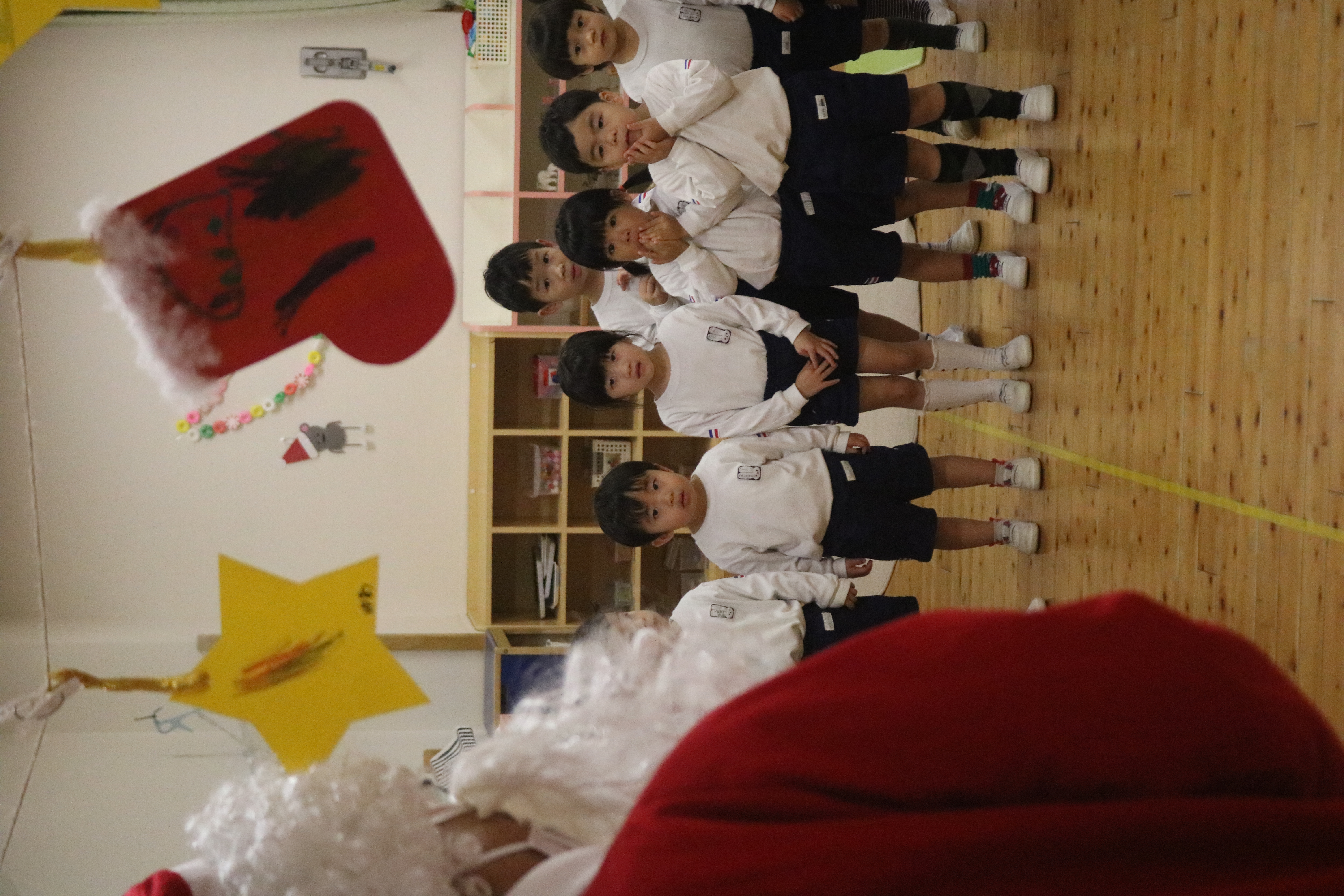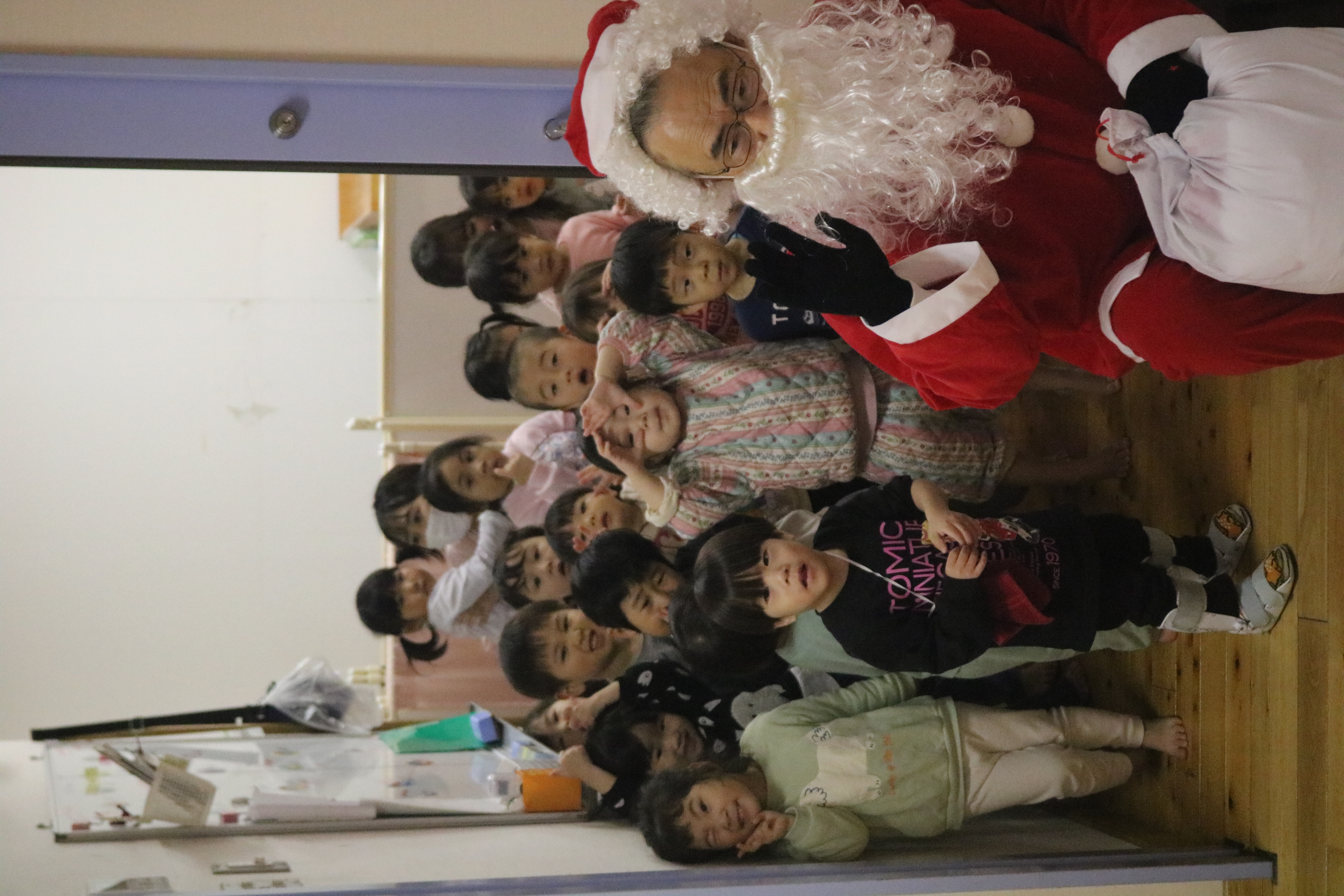 他のクラスでは、サンタさんを目の前に大喜び。きく組~あやめ組は、クラスで考えていた質問をサンタさんにすることができました。