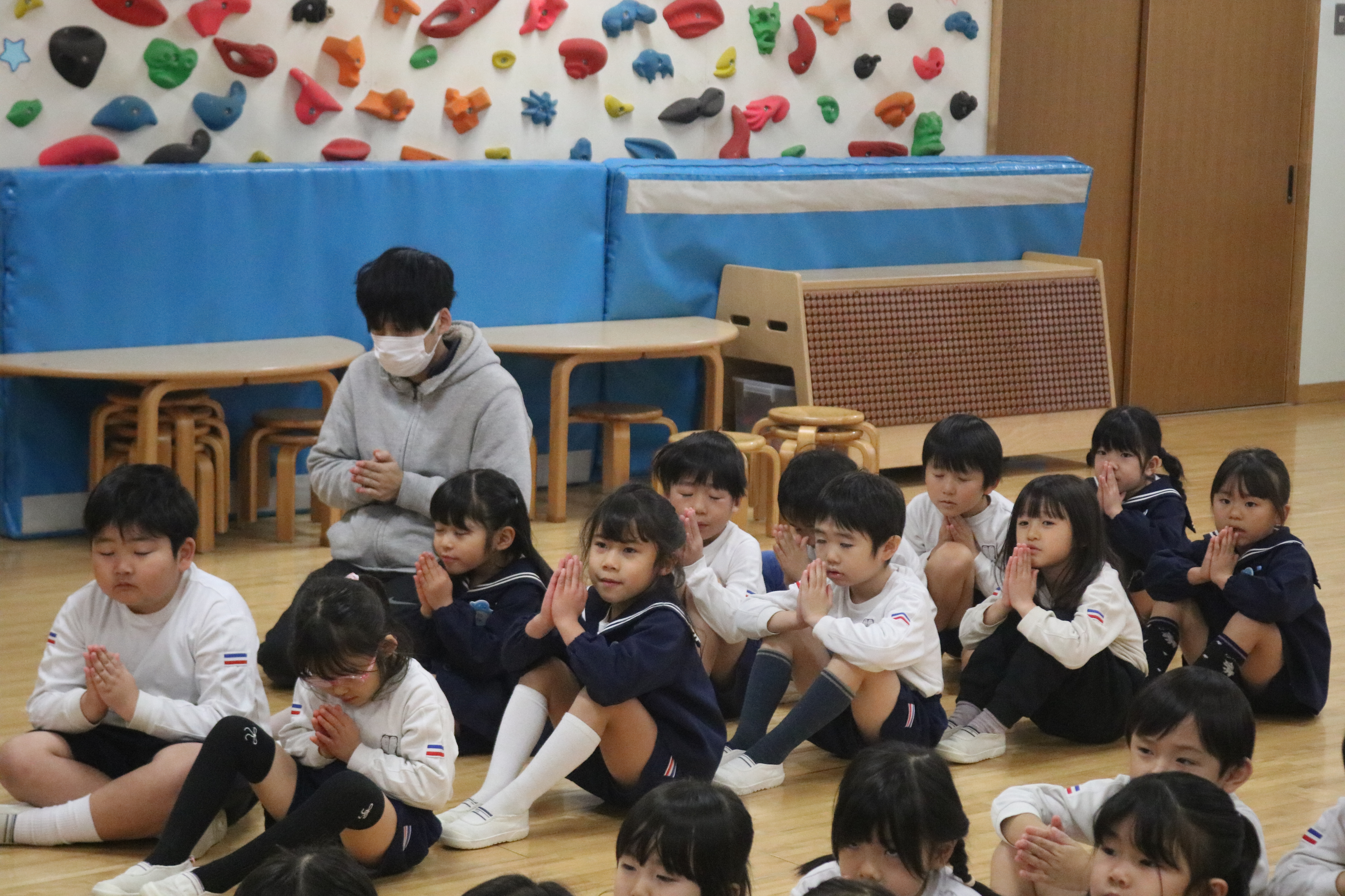 園長先生のお話では、終園式でのお約束を覚えていますかの問いかけに、元気よく手を挙げる子ども達の姿が見られました。