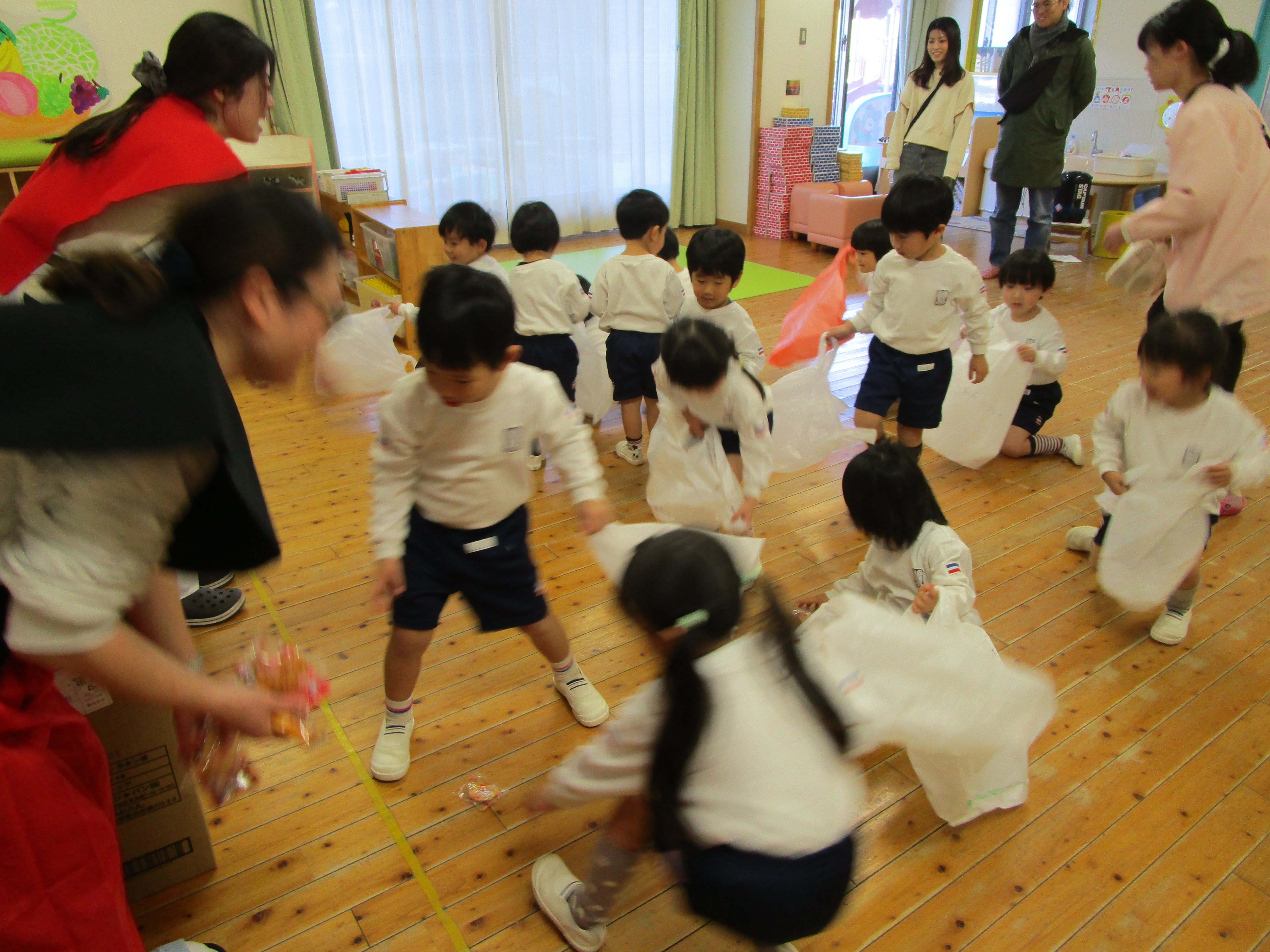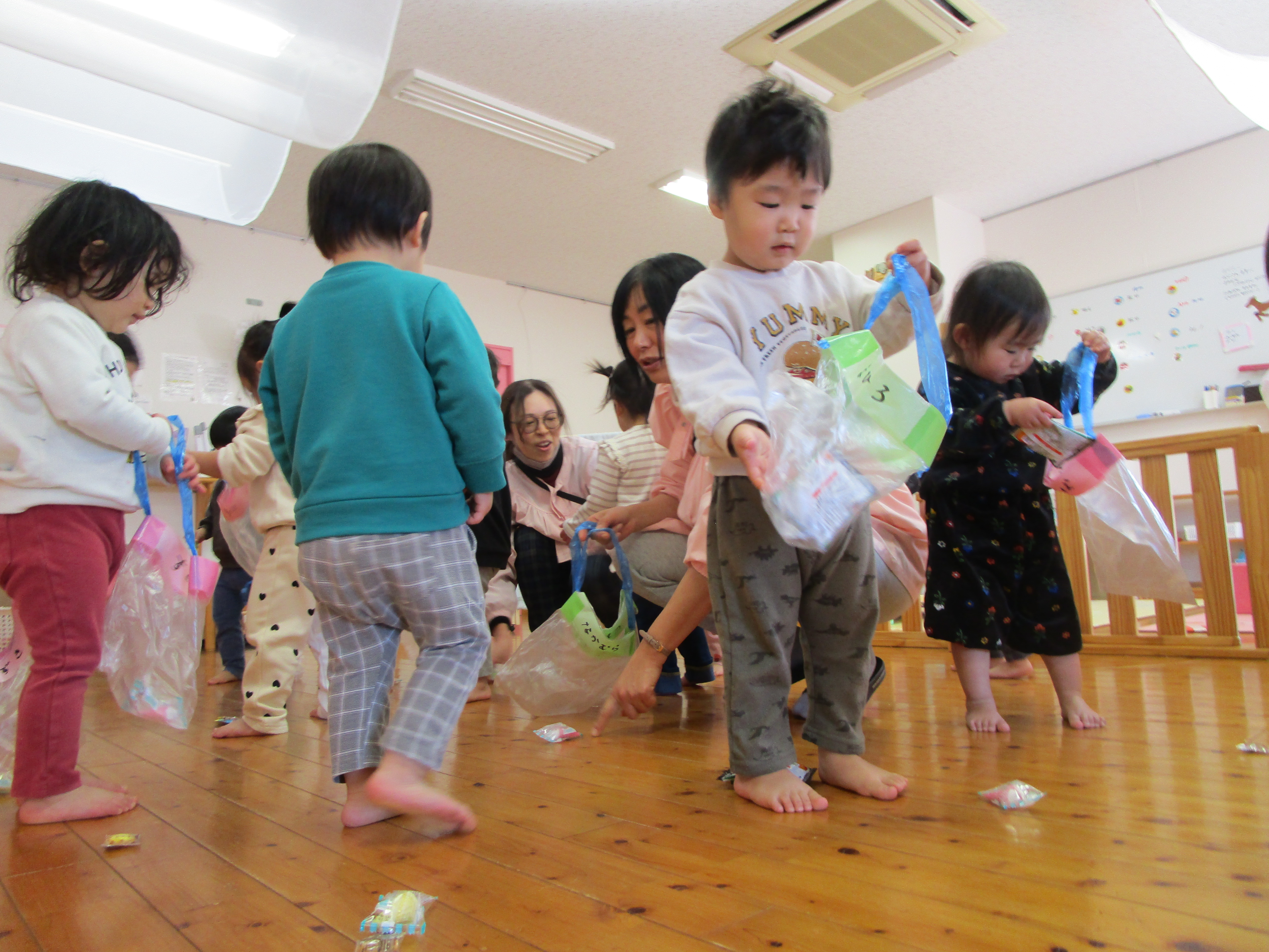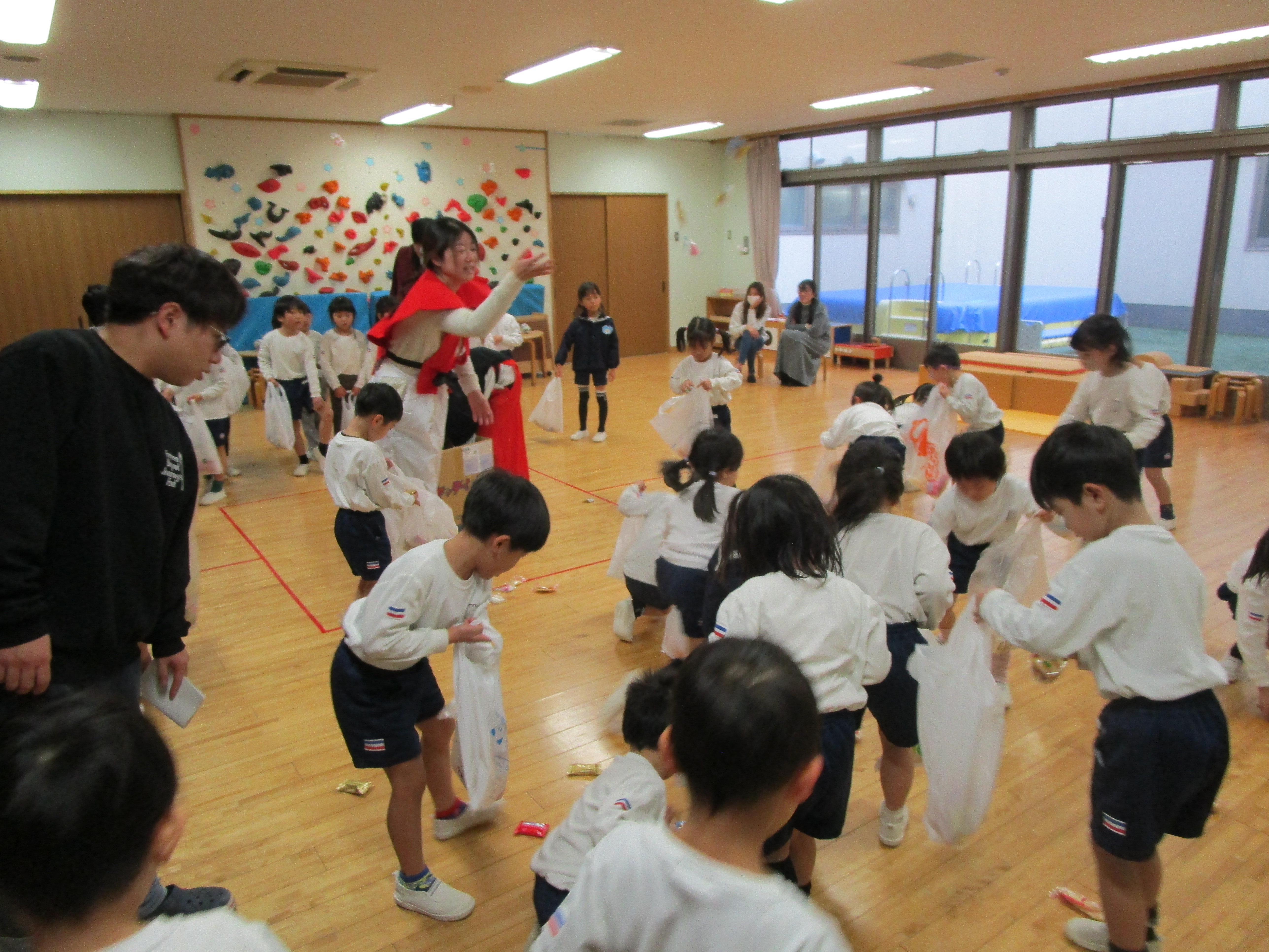 続いて福の神が現れ、みんなに福を届けてくれました。子どもたちは夢中になって福を拾い、とても嬉しそうな表情を見せていました。小さいクラスにも福の神が来てくれ、同じように楽しい時間を過ごしました。