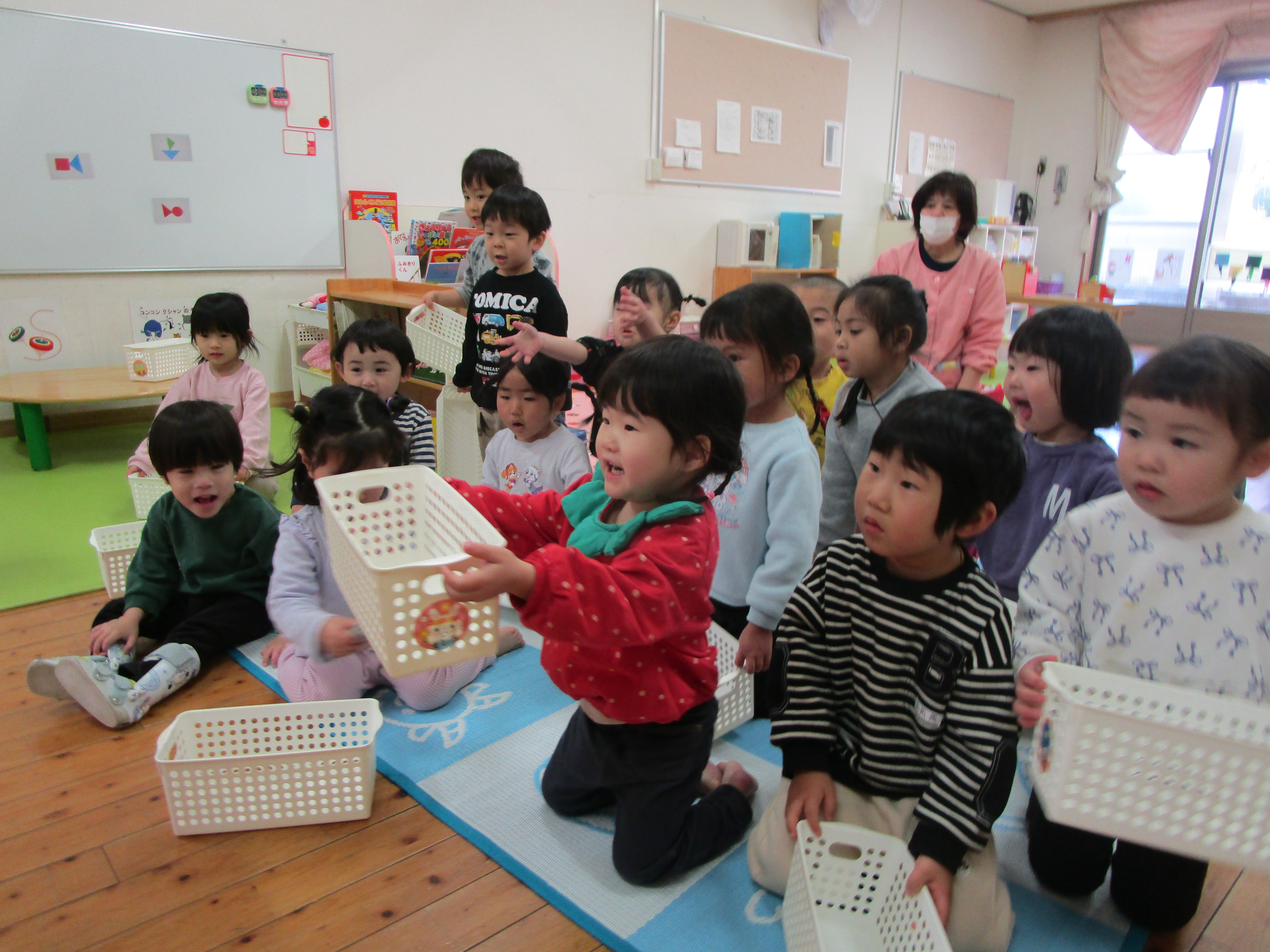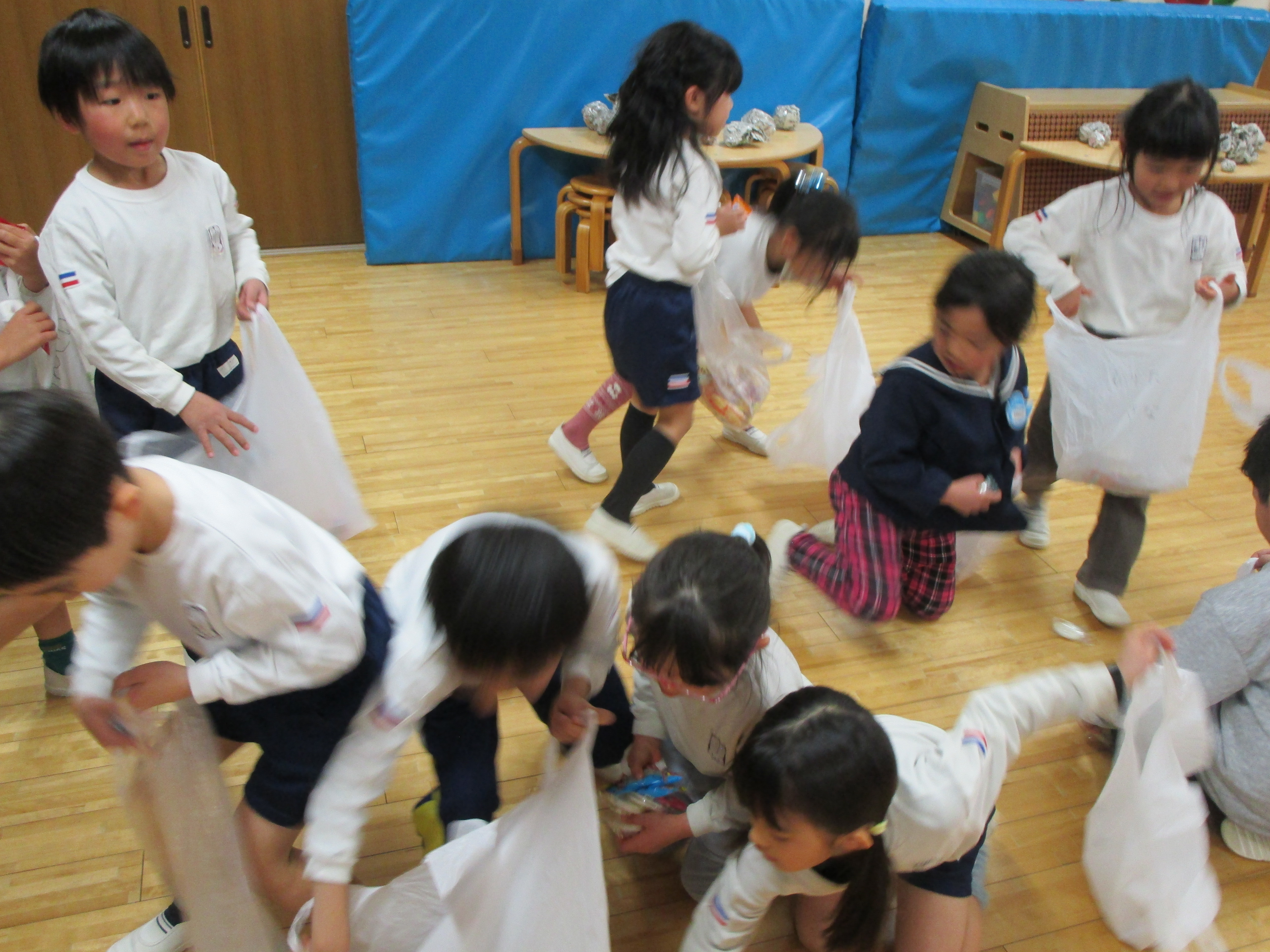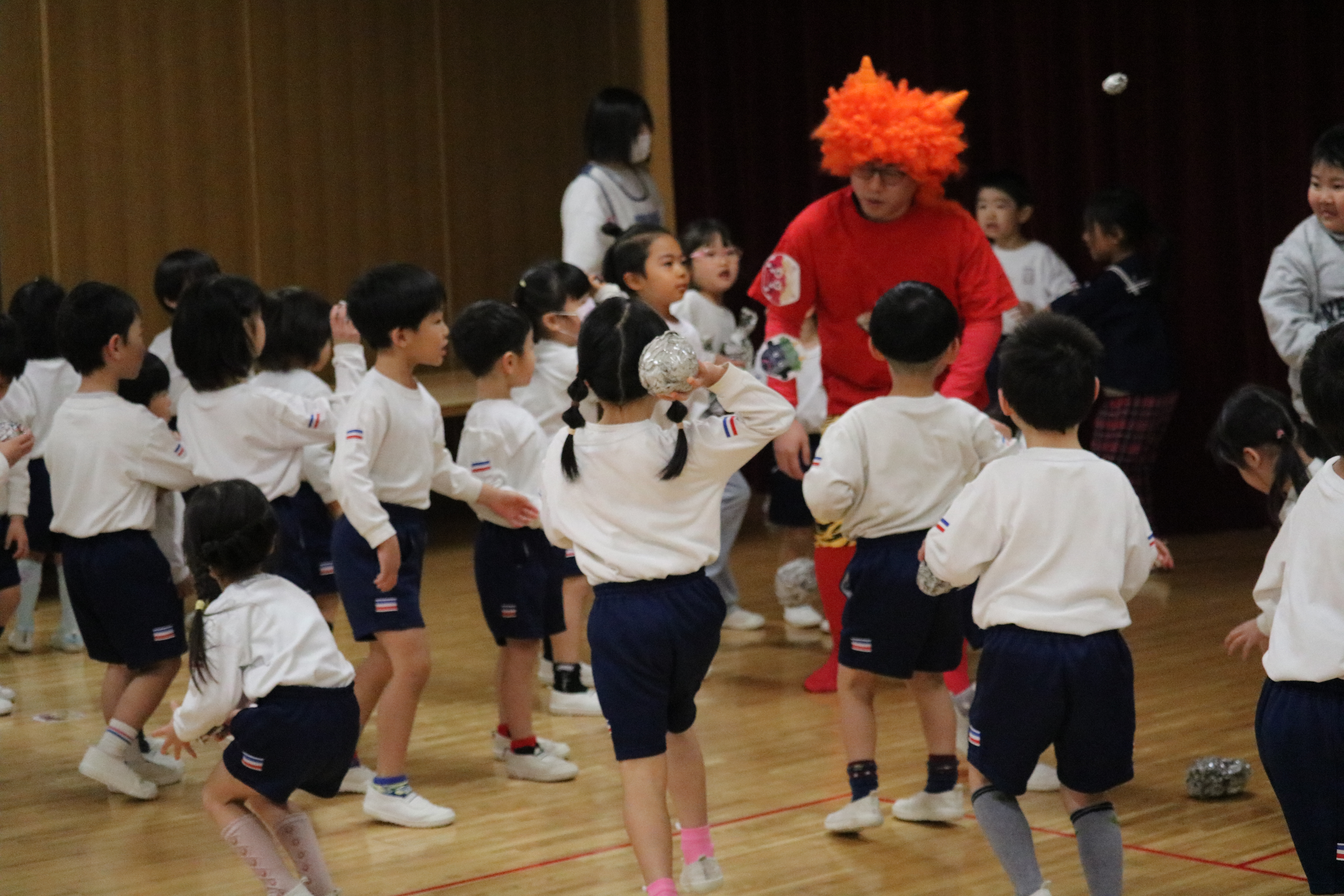 続いて福の神が現れ、みんなに福を届けてくれました。子どもたちは夢中になって福を拾い、とても嬉しそうな表情を見せていました。小さいクラスにも福の神が来てくれ、同じように楽しい時間を過ごしました。