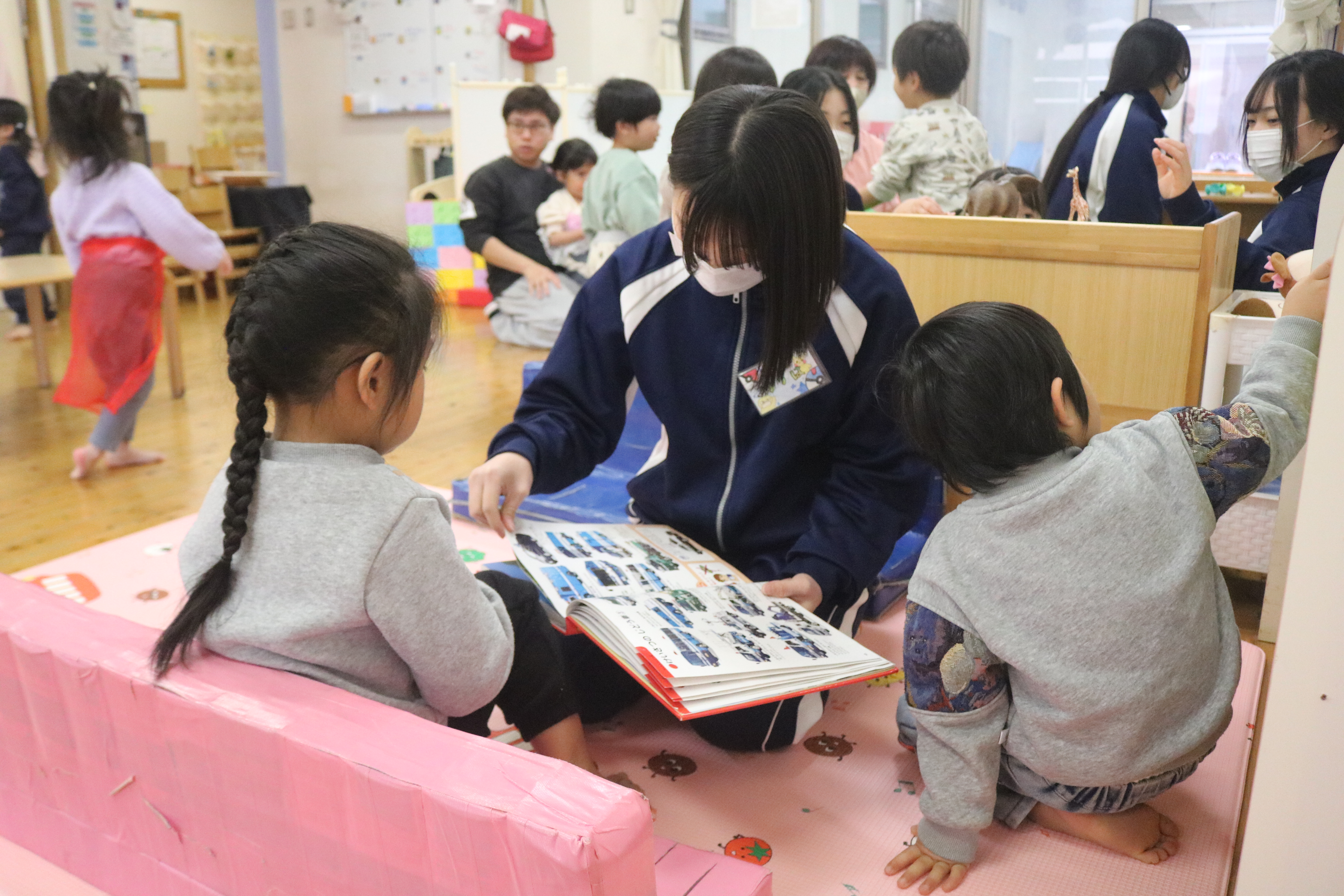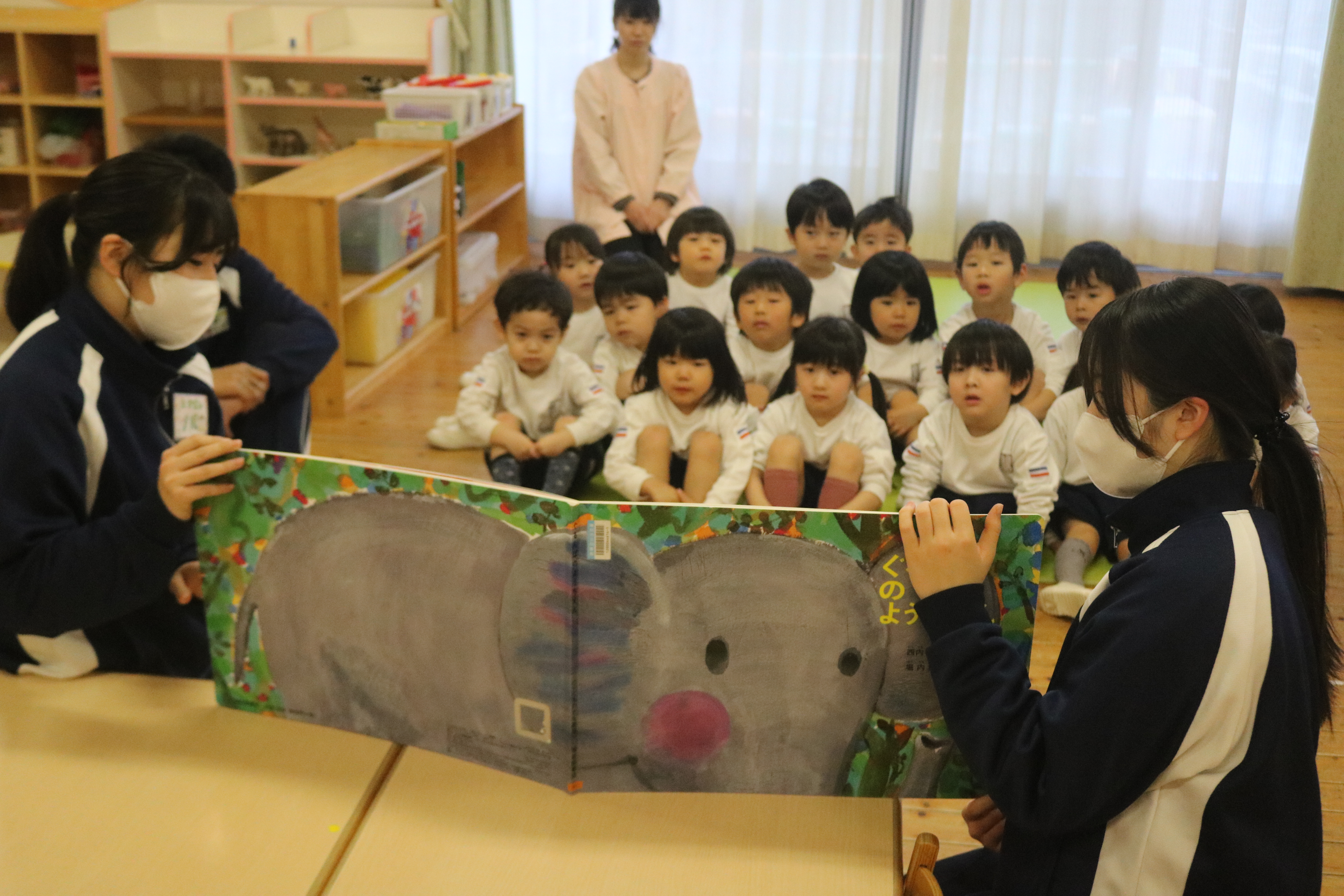職場体験でお兄さん・お姉さんが来てくれました~すみれ組・きく組・あやめ組~ すみれ組 きく組 あやめ組 本日は、磐田農業高校のお兄さん・お姉さんが職場体験で来てくれました。大型絵本の読み聞かせや、製作、ゲームなどをしてくれ、子どもたちは嬉しそうな表情で楽しんでいました。