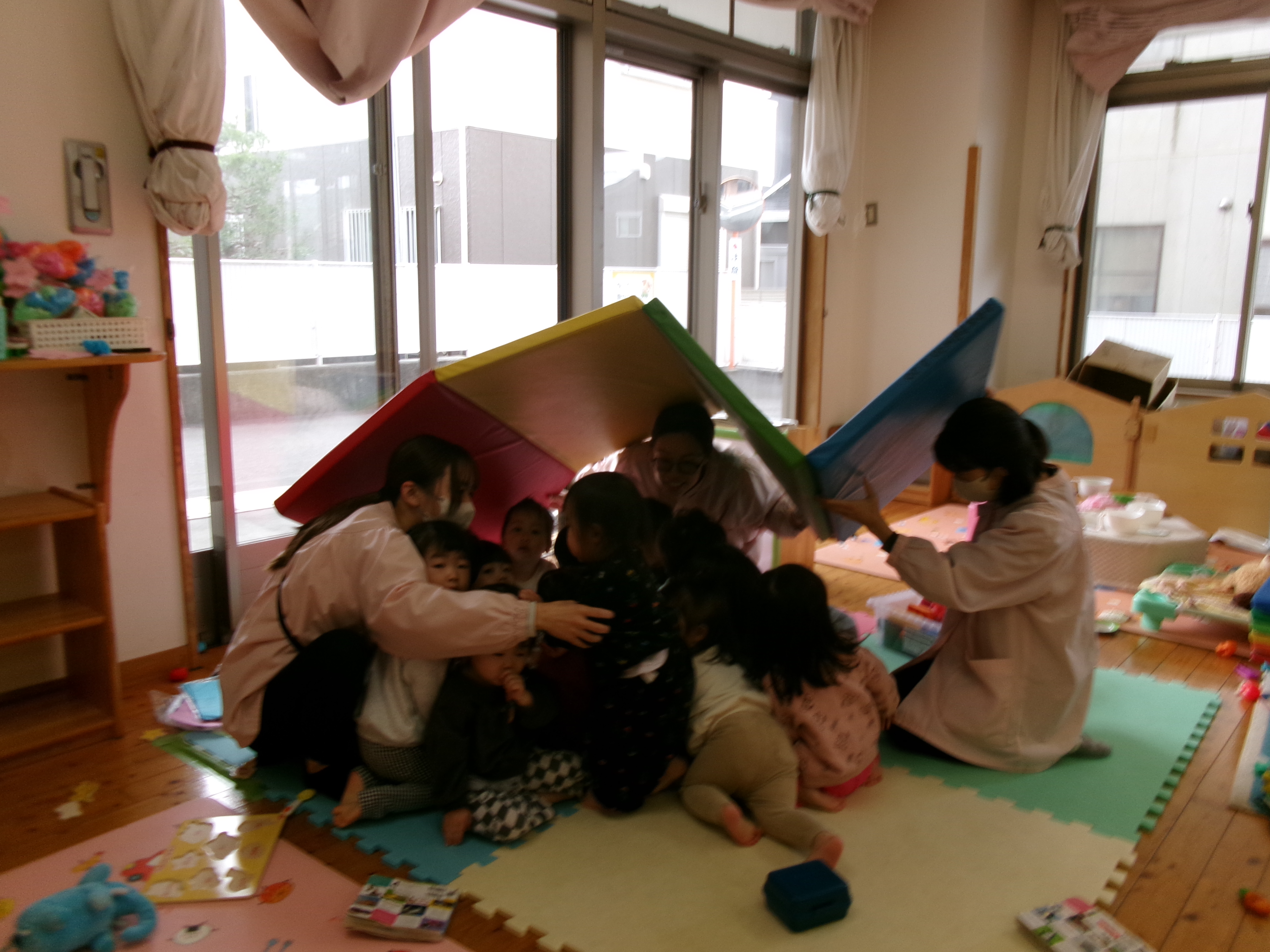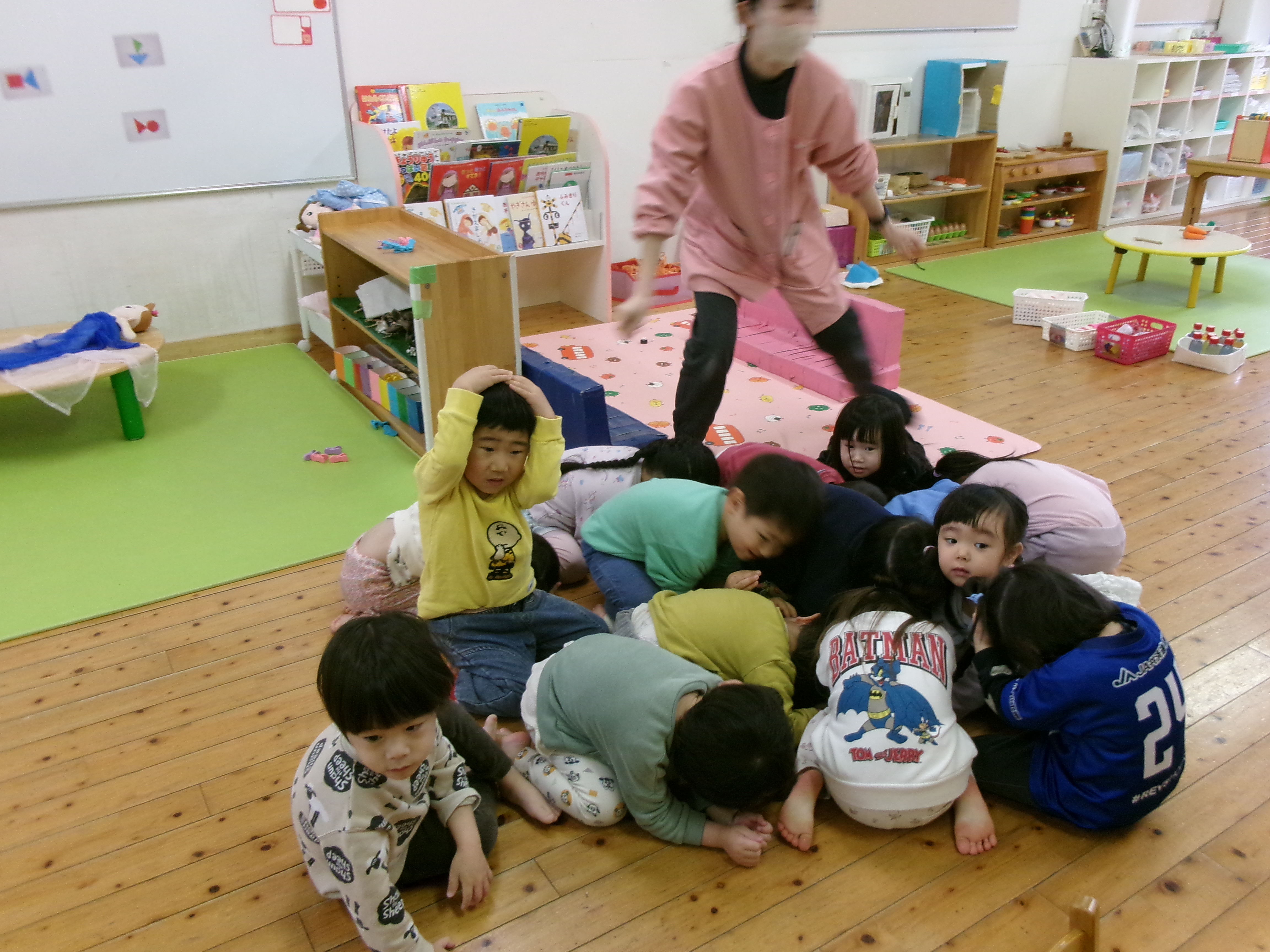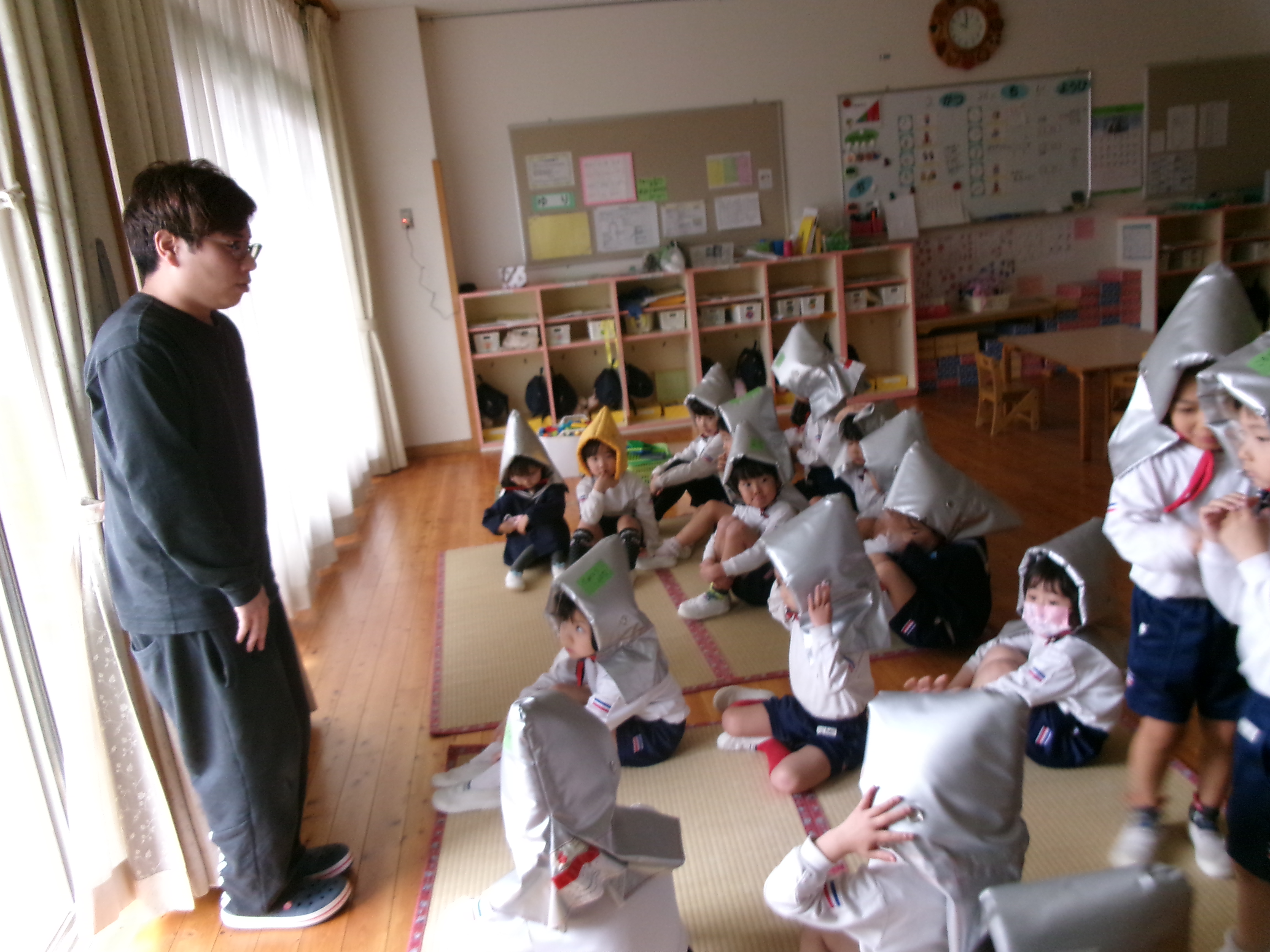 今日はいつもと違う時間に避難訓練を行いました。放送を聞いて頭を守る行動をとることが出来ました。