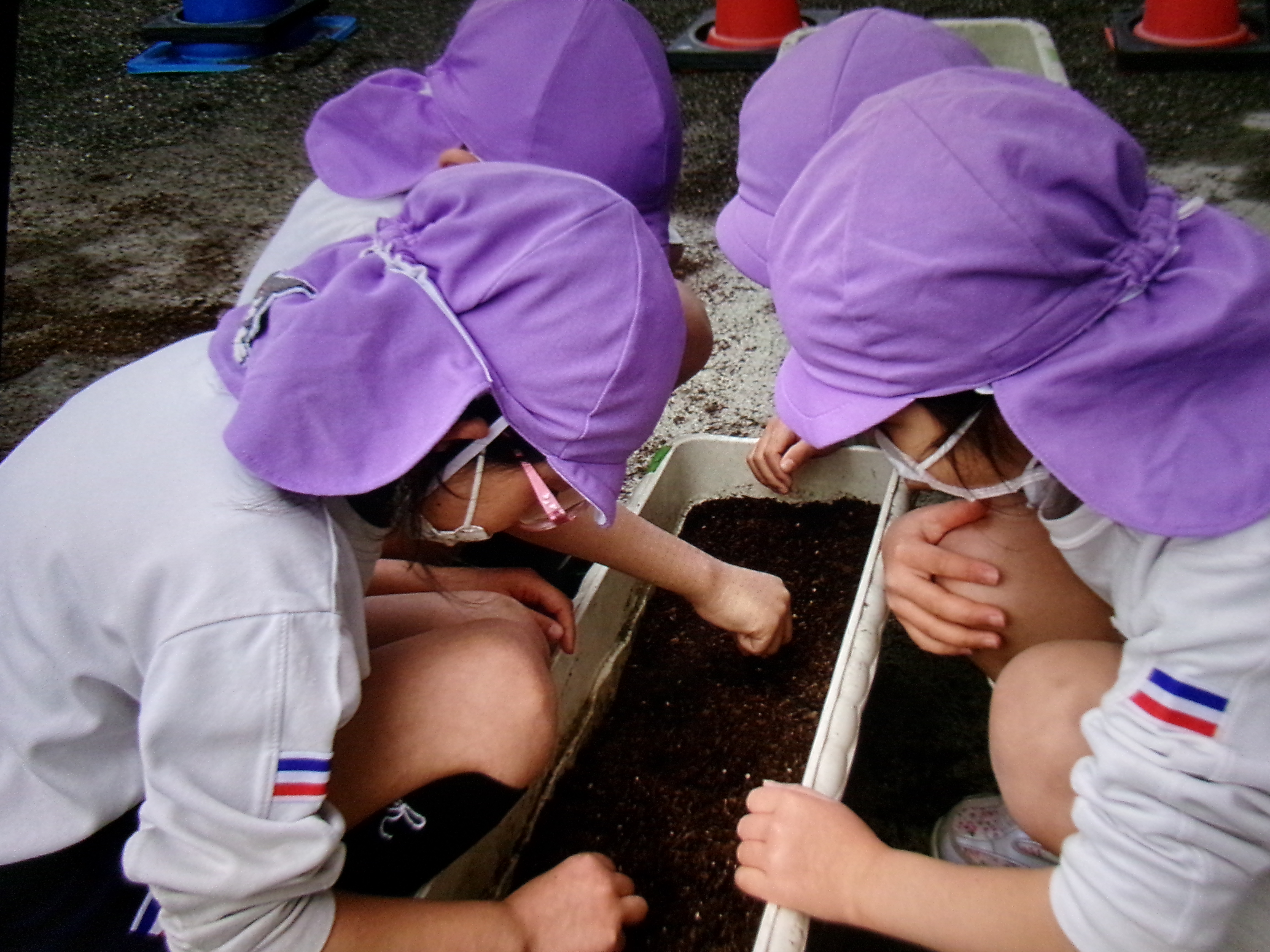 そして、午後にはあやめ組がミニ大根とホウレンソウの種を植えました。農家の杉山さんに前もってアドバイスをいただき、プランターに何個植えるのか、深さはどのくらいなのかを教えていただきました。確認しながら植えましたよ!お休みしているお友達はまた植えようね!そして3月末に収穫できると良いですね!!